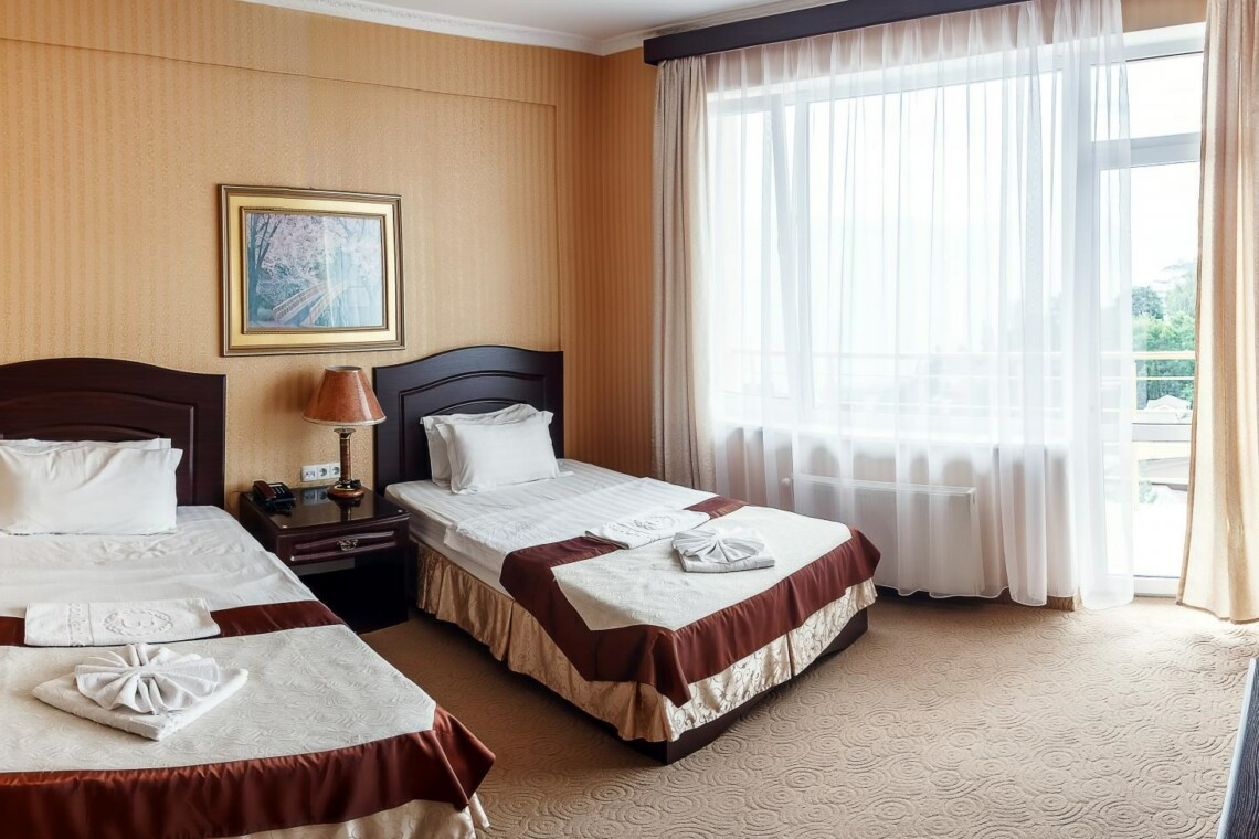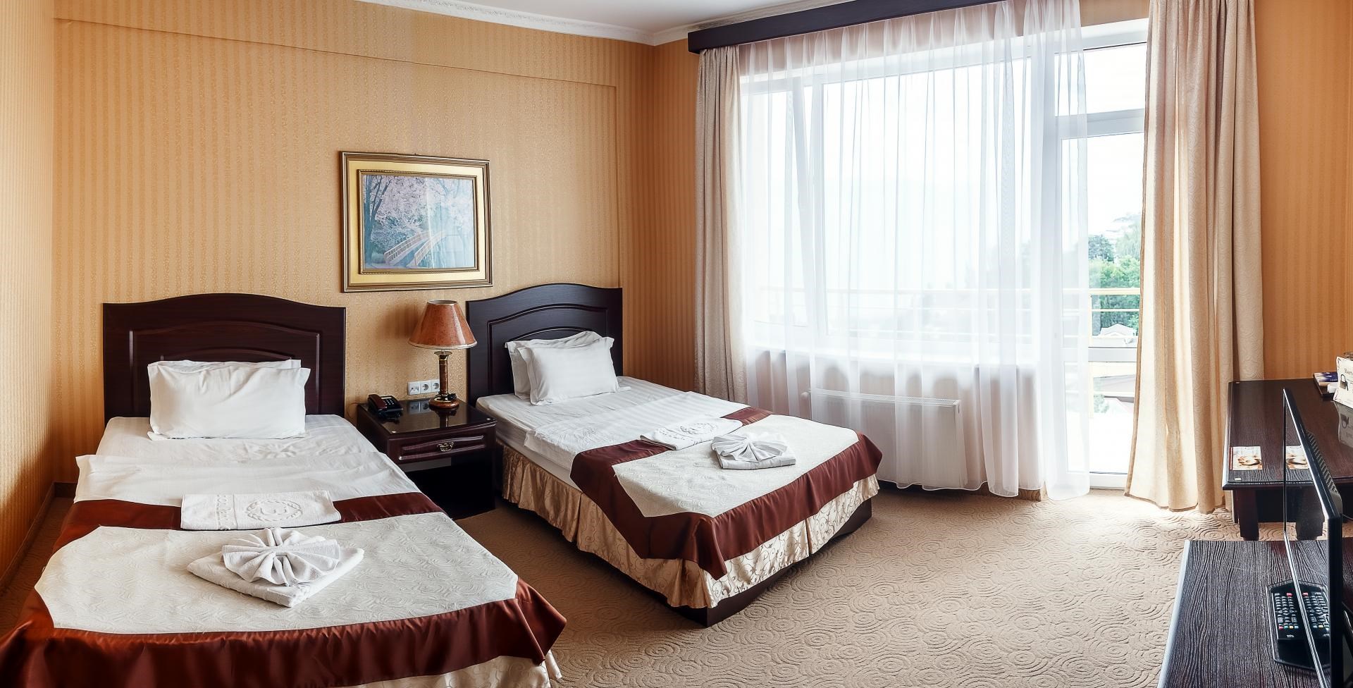 Уютный однокомнатный номер Стандарт комфорт имеет площадь 18 м2, с большой двуспальной или двумя полуторными кроватями. Номер с отдельным балконом, оснащенный мебелью, с которого открывается потрясающий вид на море. Номер рассчитан на проживание от 1-го до 3-х человек 2 основных и 1 дополнительное место. Размещение одного ребенка до 5- ти лет без предоставления дополнительного места бесплатно. При размещении 2-х детей в возрасте до 5-ти лет необходима оплата одного дополнительного места.