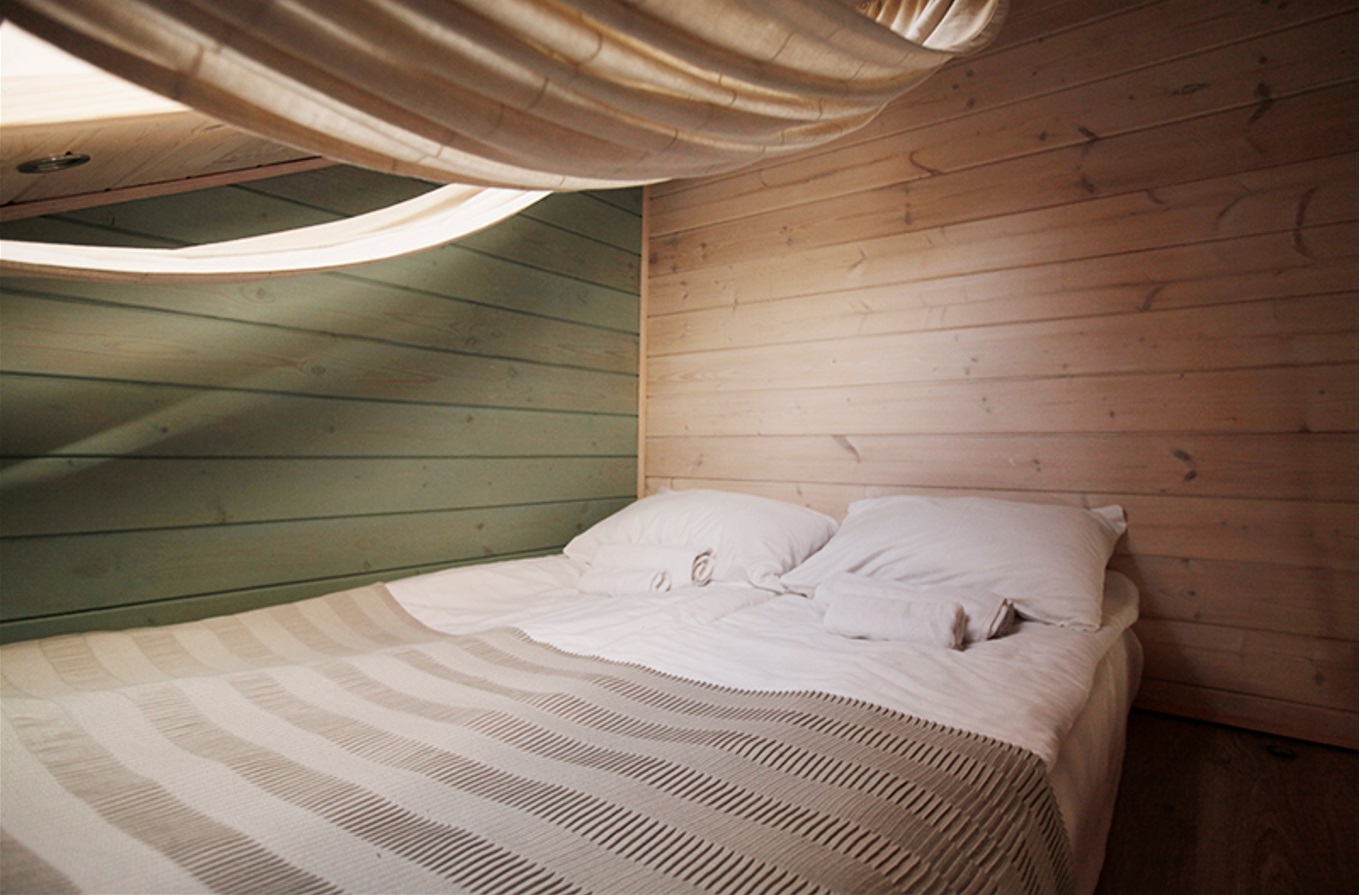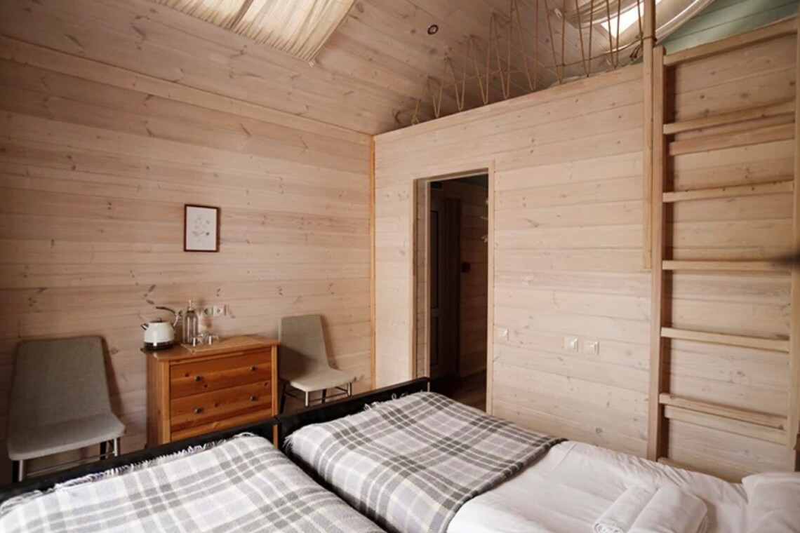 Здесь две односпальные кровати (по 90 см) и спальное место (140 см) на антресоли под скатом крыши. Обратите внимание, что лестница, которая ведет на мансардное спальное место, довольно крутая и подойдет не всем.