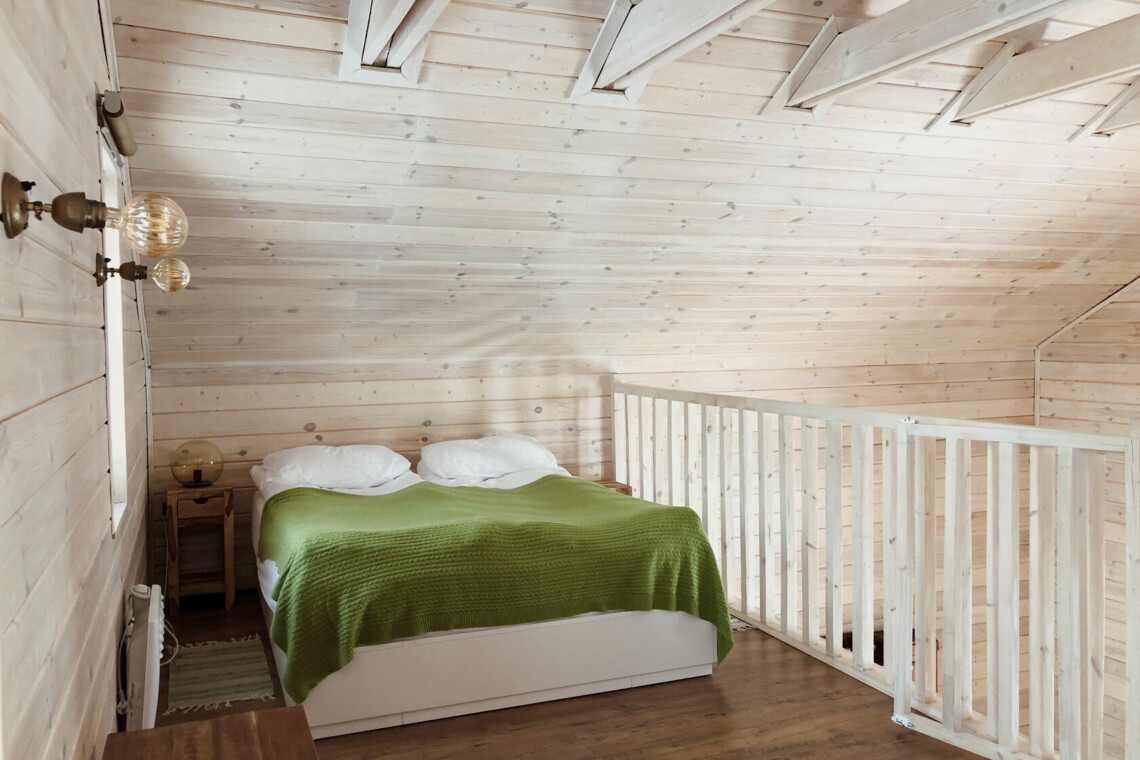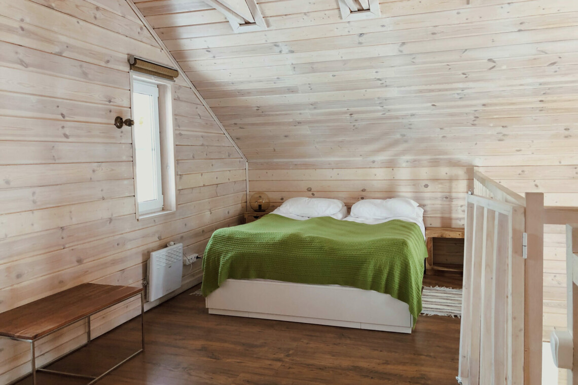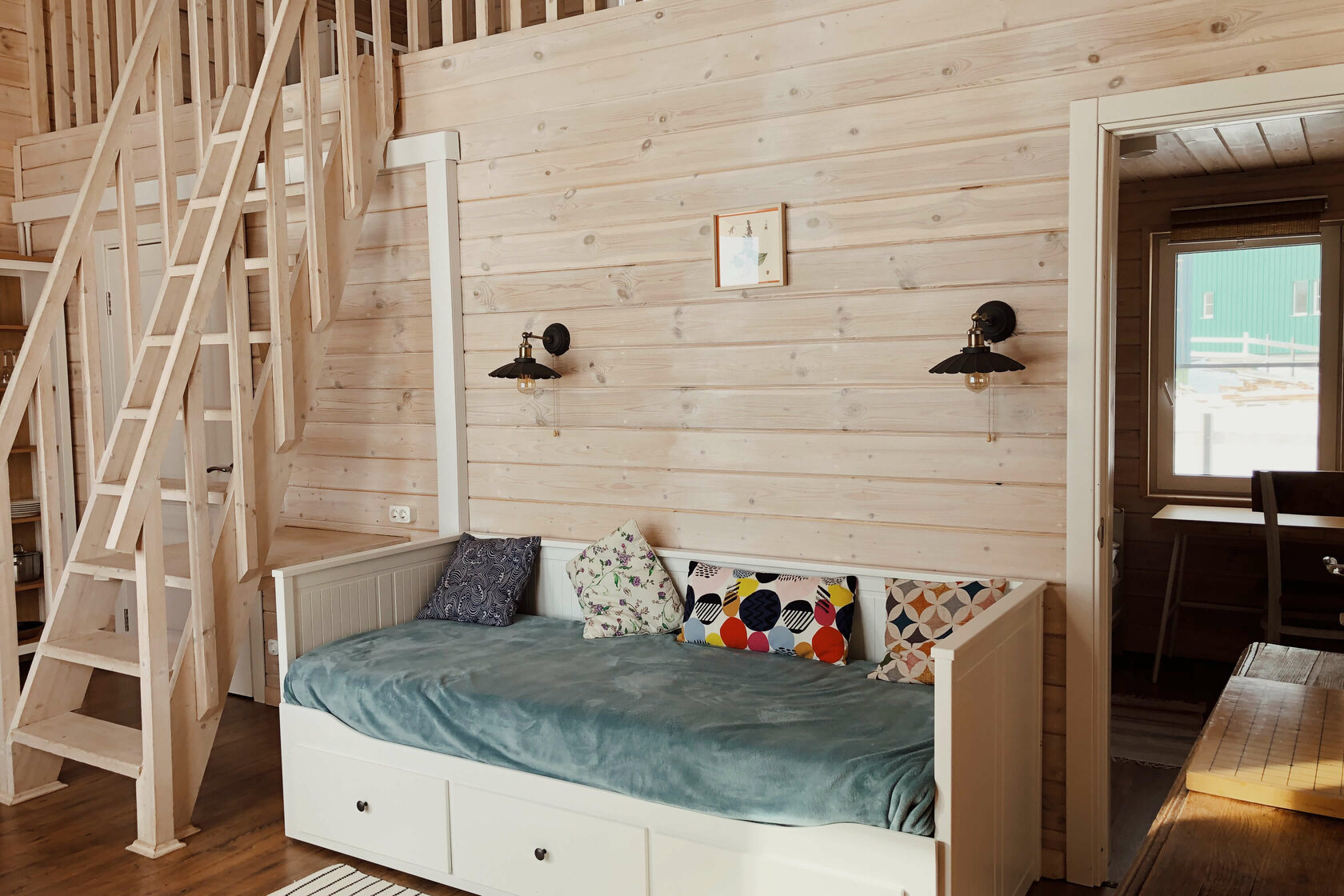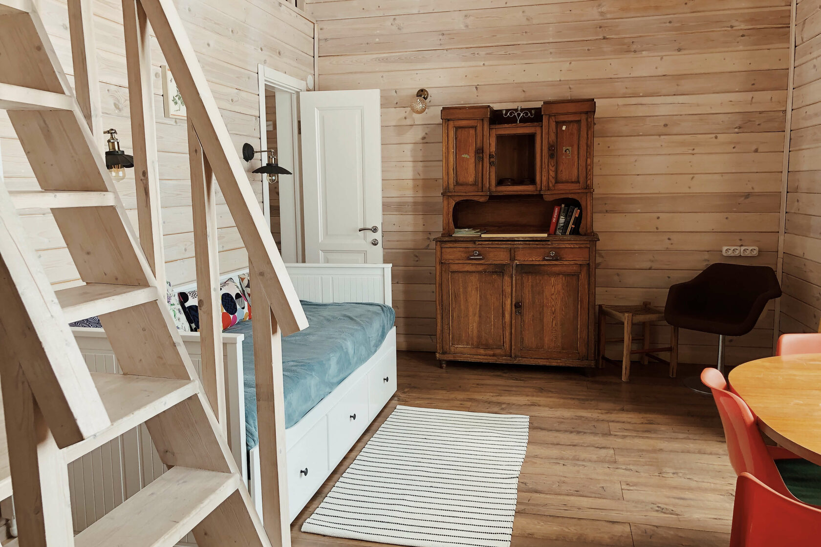 Двуспальная кровать (160 см) и детская кроватка находится на втором этаже. Обратите внимание, что лестница, которая встречается на втором этаже, довольно крутая и подходит не всем. На первом этаже в гостиной кушетка, которая раскладывается в спальное место на 160 см, а в небольшой комнате – на одноместную кровать (80 см).