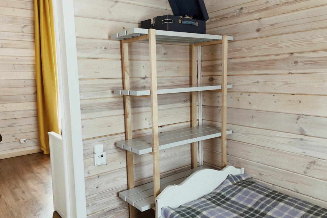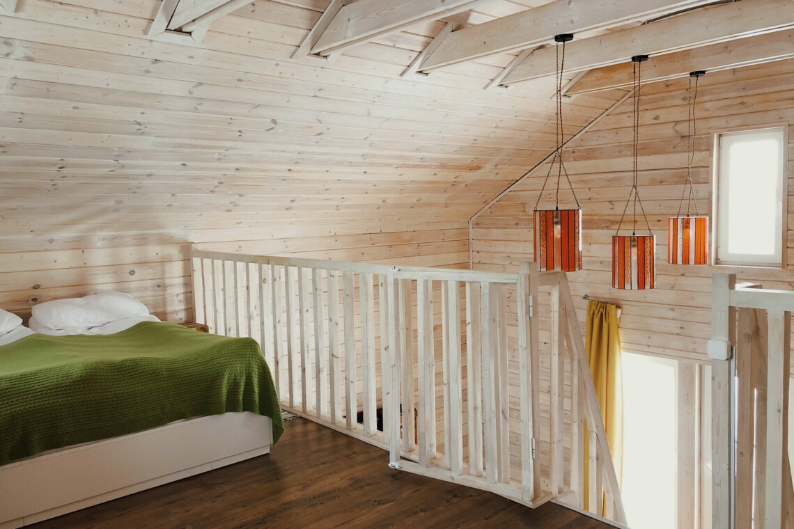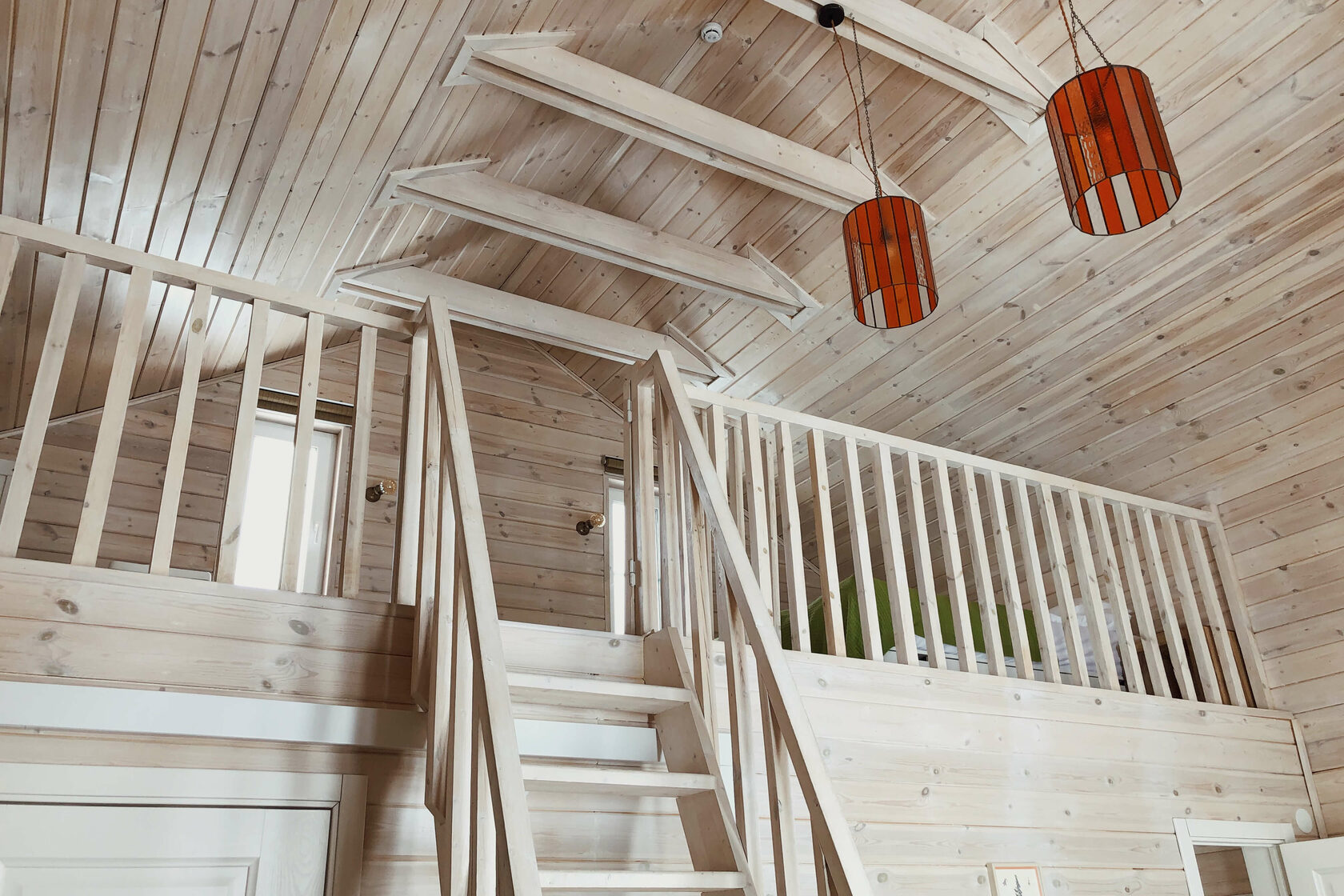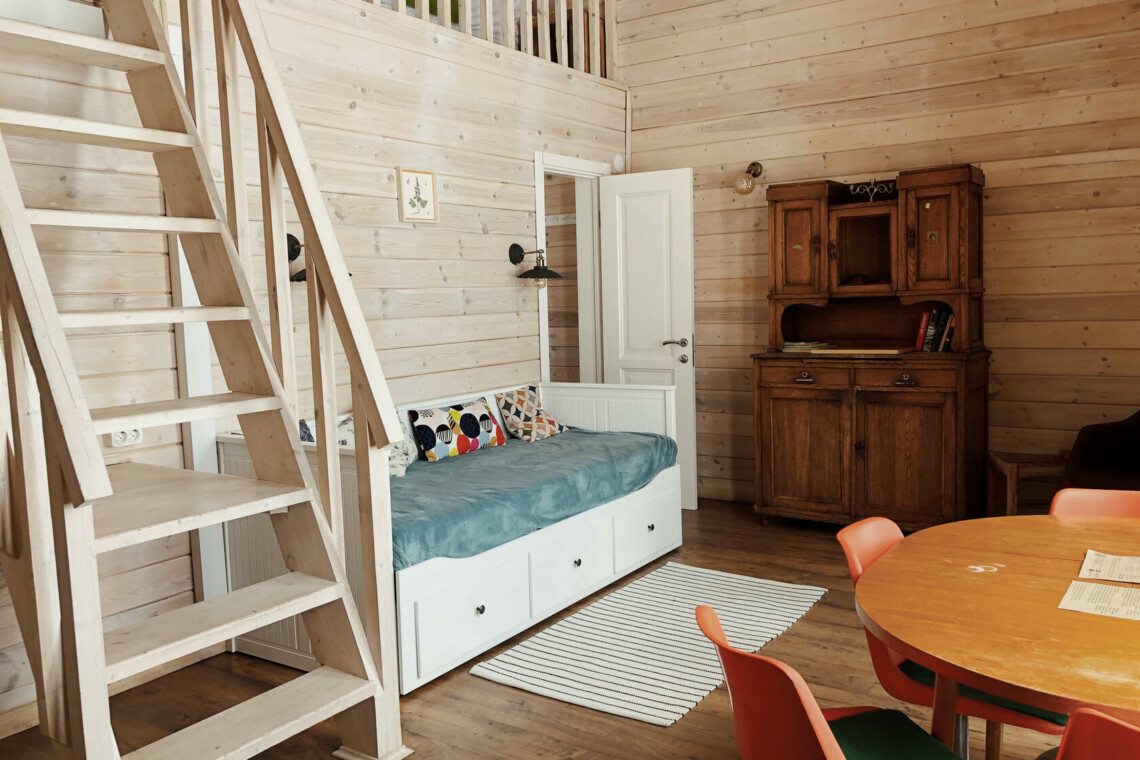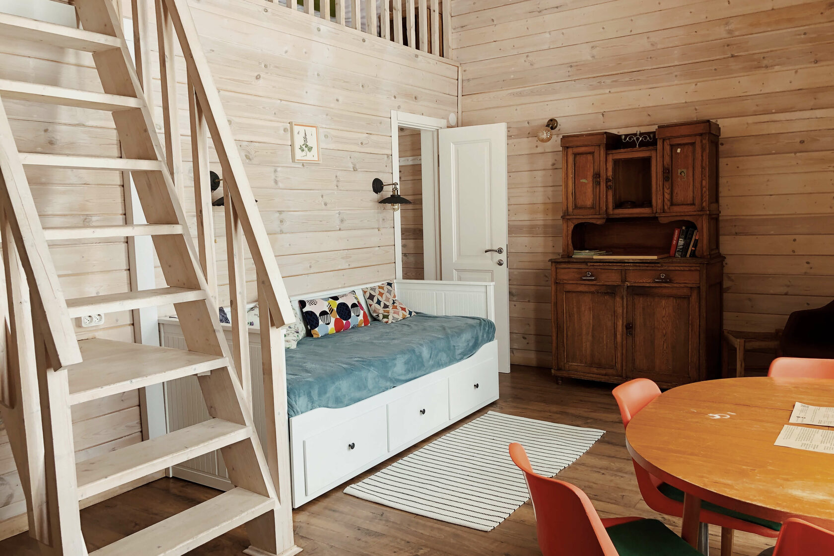 Двуспальная кровать (160 см) и детская кроватка находится на втором этаже. Обратите внимание, что лестница, которая встречается на втором этаже, довольно крутая и подходит не всем. На первом этаже в гостиной кушетка, которая раскладывается в спальное место на 160 см, а в небольшой комнате – на одноместную кровать (80 см).