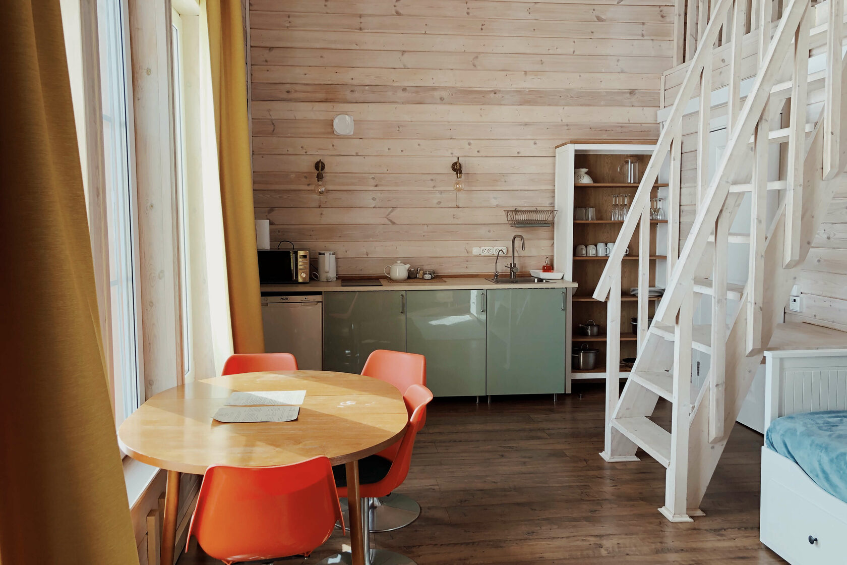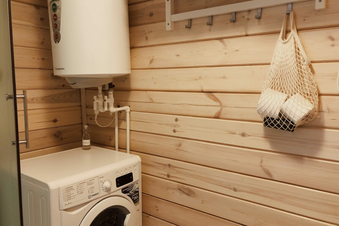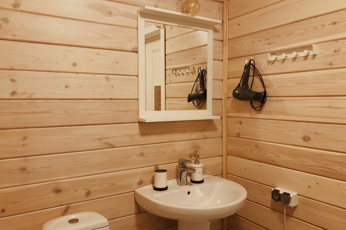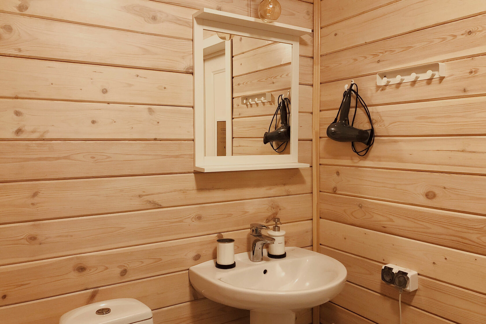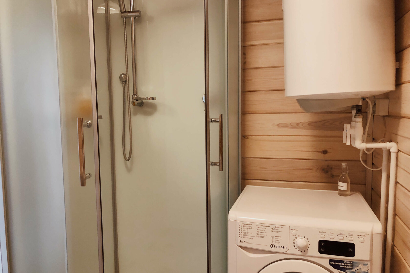 В гостиной обустроен кухонный уголок с минихолодильником, электроплитой на две конфорки, мойкой, чайником и печью. Ванная комната с туалетом, душевая кабина, теплый пол и стиральная машина. В ванной есть фен, по два полотенца для каждого гостя, жидкое мыло и гель для душа.