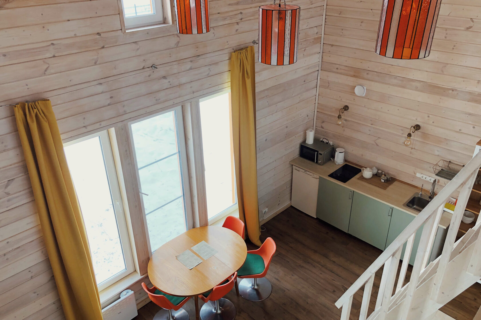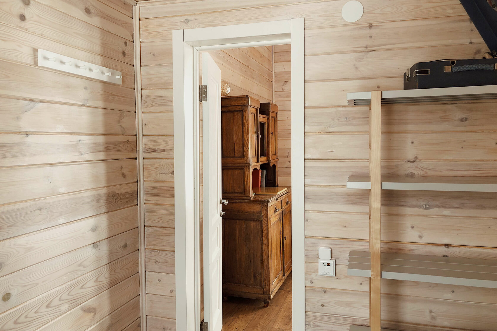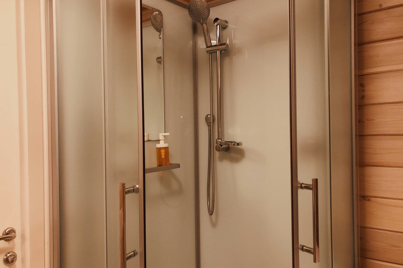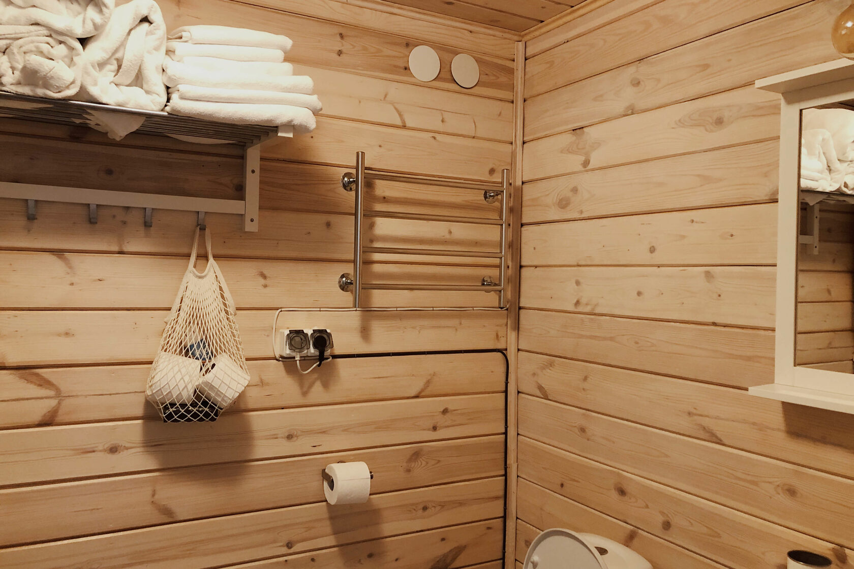 В гостиной обустроен кухонный уголок с минихолодильником, электроплитой на две конфорки, мойкой, чайником и печью. Ванная комната с туалетом, душевая кабина, теплый пол и стиральная машина. В ванной есть фен, по два полотенца для каждого гостя, жидкое мыло и гель для душа.