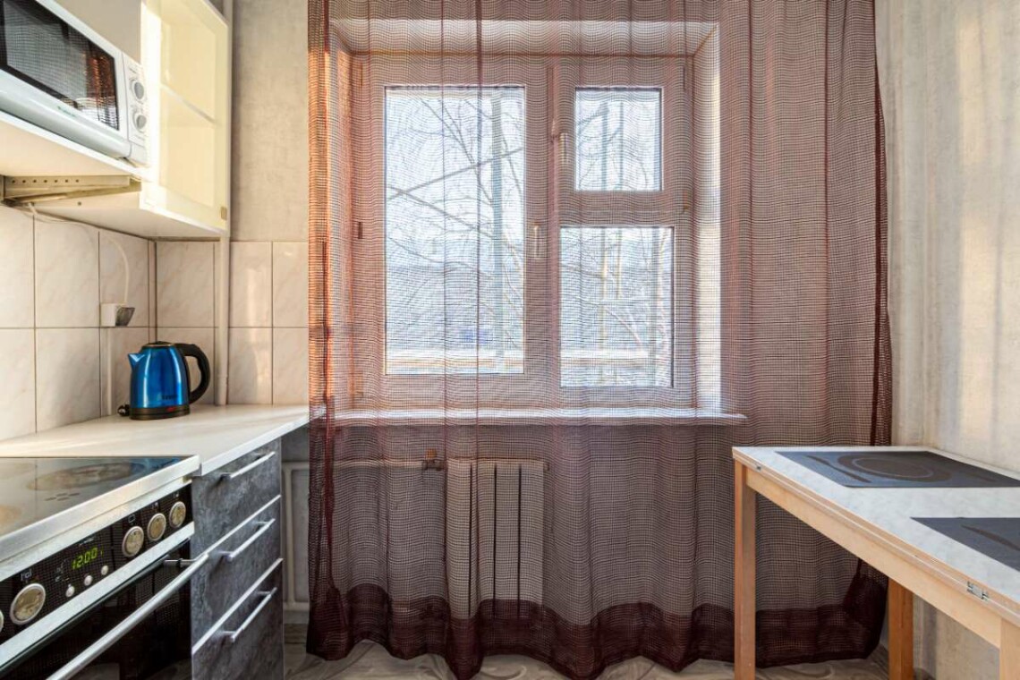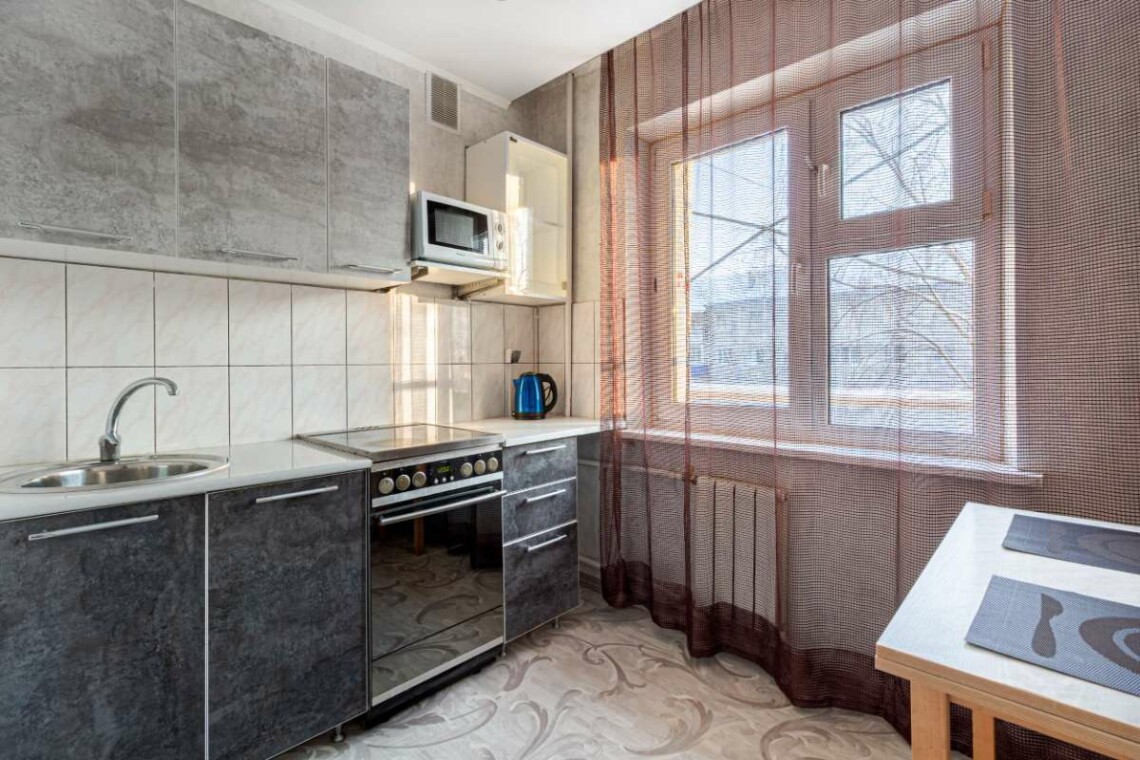 Кухонная техника и посуда:– холодильник – электрический чайник – микроволновка – электрическая плита – набор посуды и столовые приборы