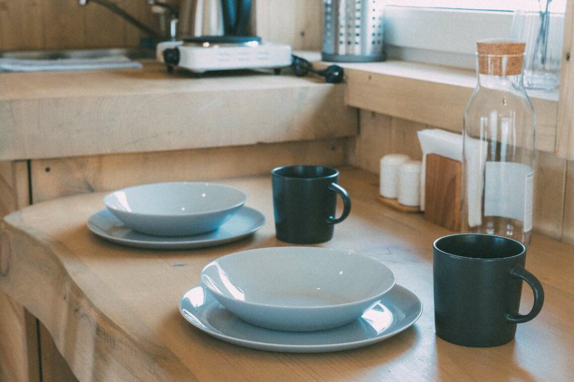 - Оборудованная кухонная зона с комплектом посуды и столовых приборов, бытовой техники