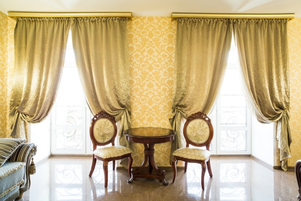 Интерьер, выполненный в золотистых тонах, разделен на зоны: