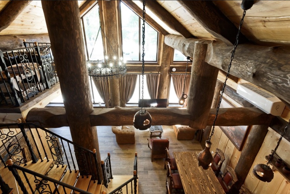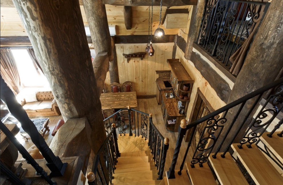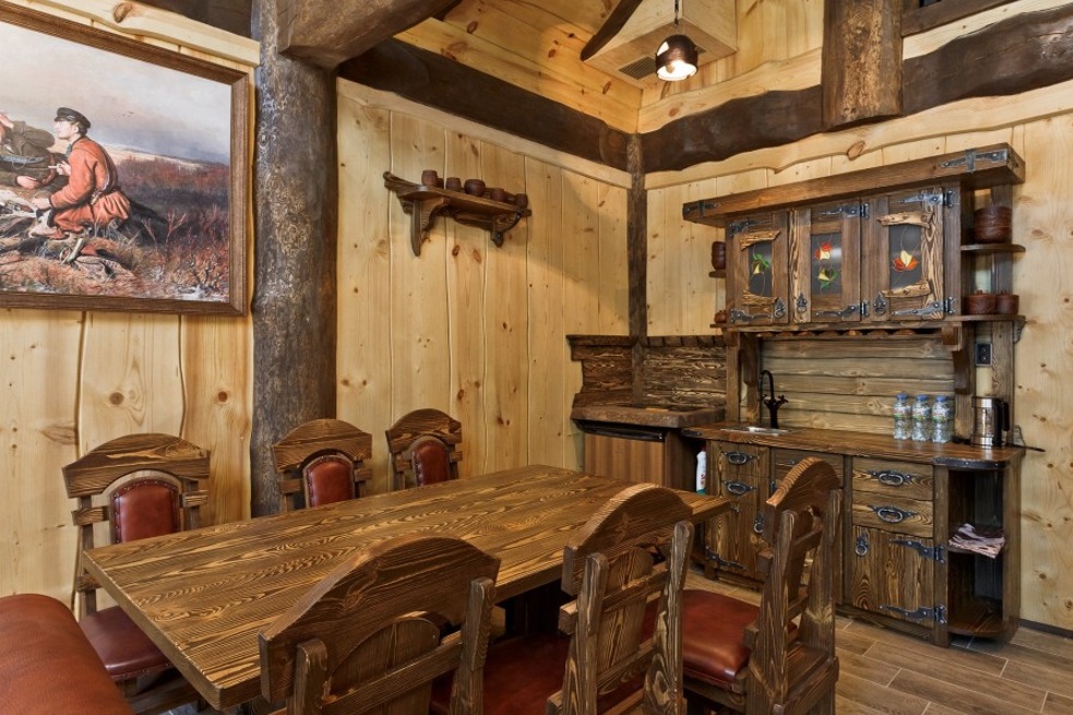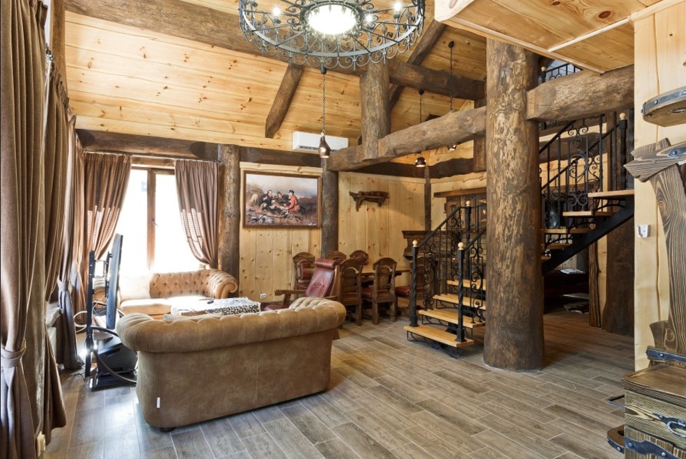 Роскошный двухэтажный дом в охотничьем стиле общей площадью 108,4 квадратных метра, приглашает на отдых большую семью или компанию друзей из 6 человек. Дизайн, с применением натуральных материалов в тёплой цветовой гамме, дарит ощущение уюта и комфорта. Экологическая чистота деревянного дома обеспечивает уникальный и здоровый микроклимат. Объёмная кованая люстра в гостиной, стилизованная под старину, деревянная мебель с коваными узорами, ажурное кружево лестницы наполняют вас харизмой и энергетикой этого дивного места. Панорамное остекление здания создаёт удивительную гармонию с окружающим миром неповторимой загородной природы.