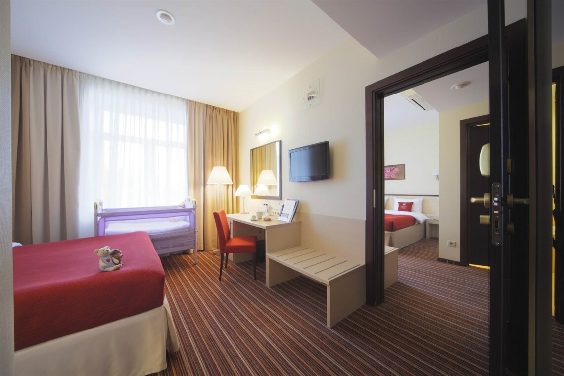 Большой семейный номер с двумя смежными спальнями и двумя ванными комнатами. Назначение для проживания семьи с детьми ( 2 взрослых + 2 ребенка до 12 лет). Для детей до 2 лет предоставляется детская кроватка.