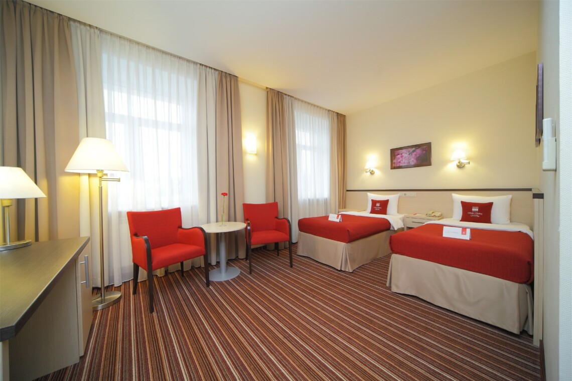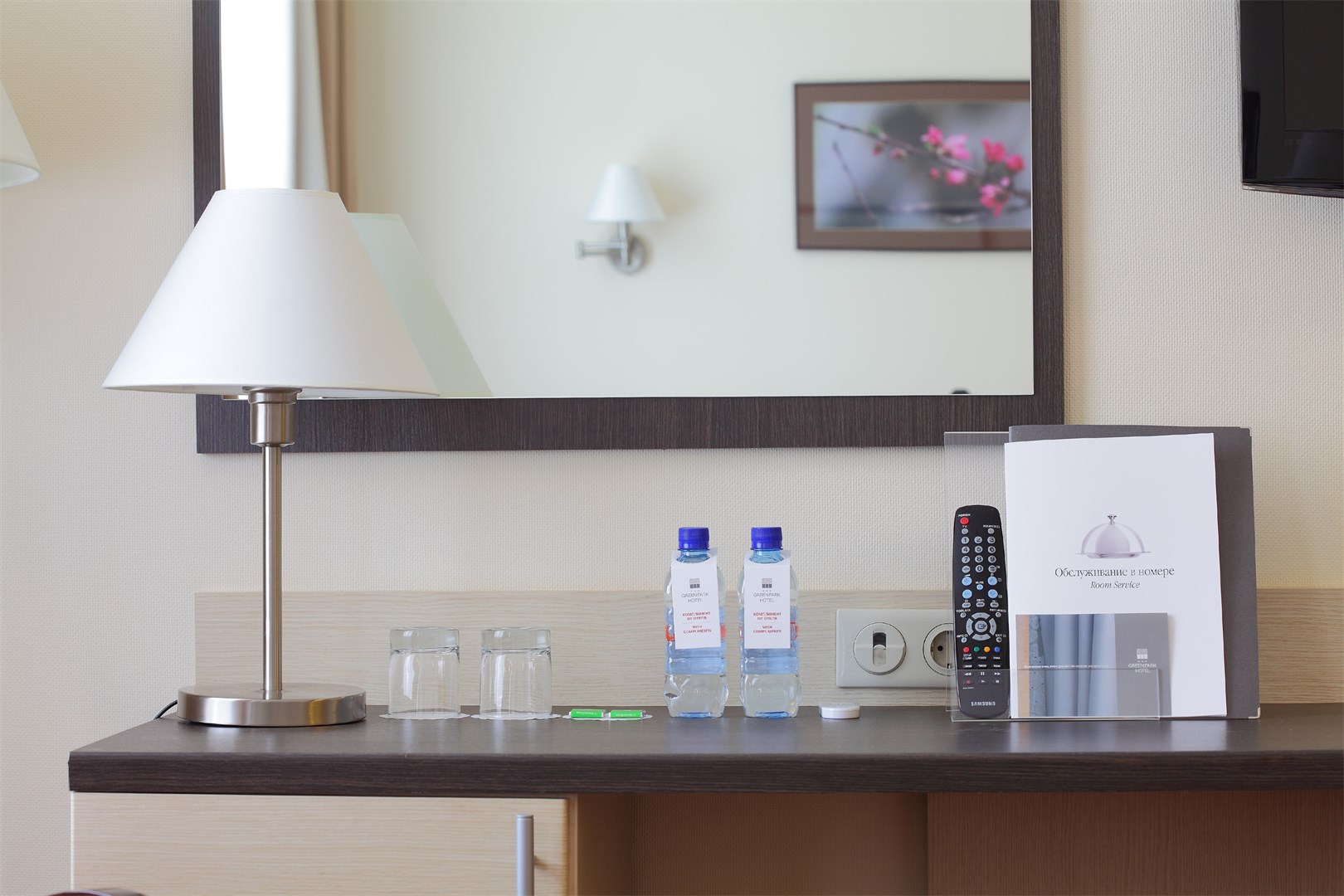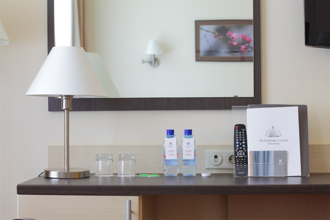 В номере: итальянская мебель – 2 раздельные кровати с ортопедическими матрацами, рабочая зона, зона отдыха (журнальный столик, 2 кресла, торшер), шкаф-купе, светонепроницаемые шторы, ЖК-телевизор с местами, индивидуальный кондиционер, телефон с междугородней и международной связью. , мини-холодильник, бесплатный сейф, бесплатный WiFi.