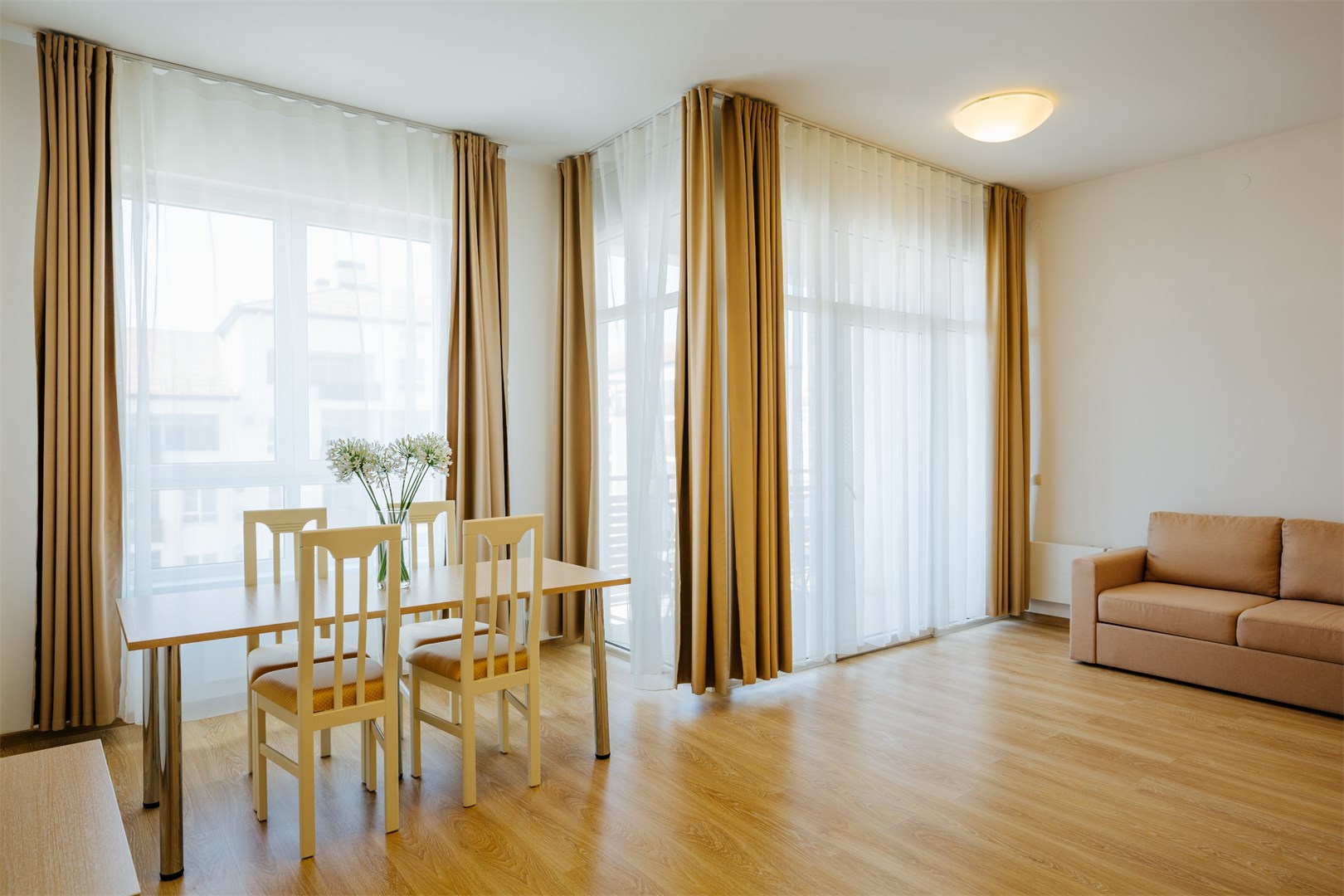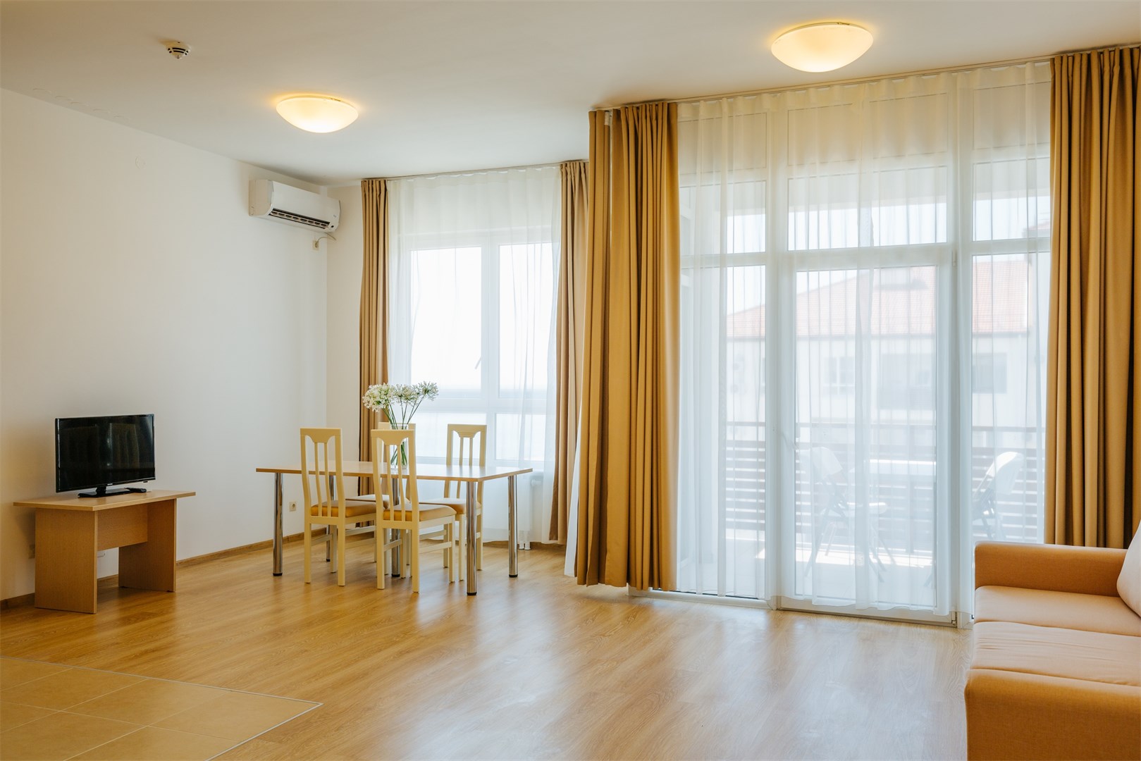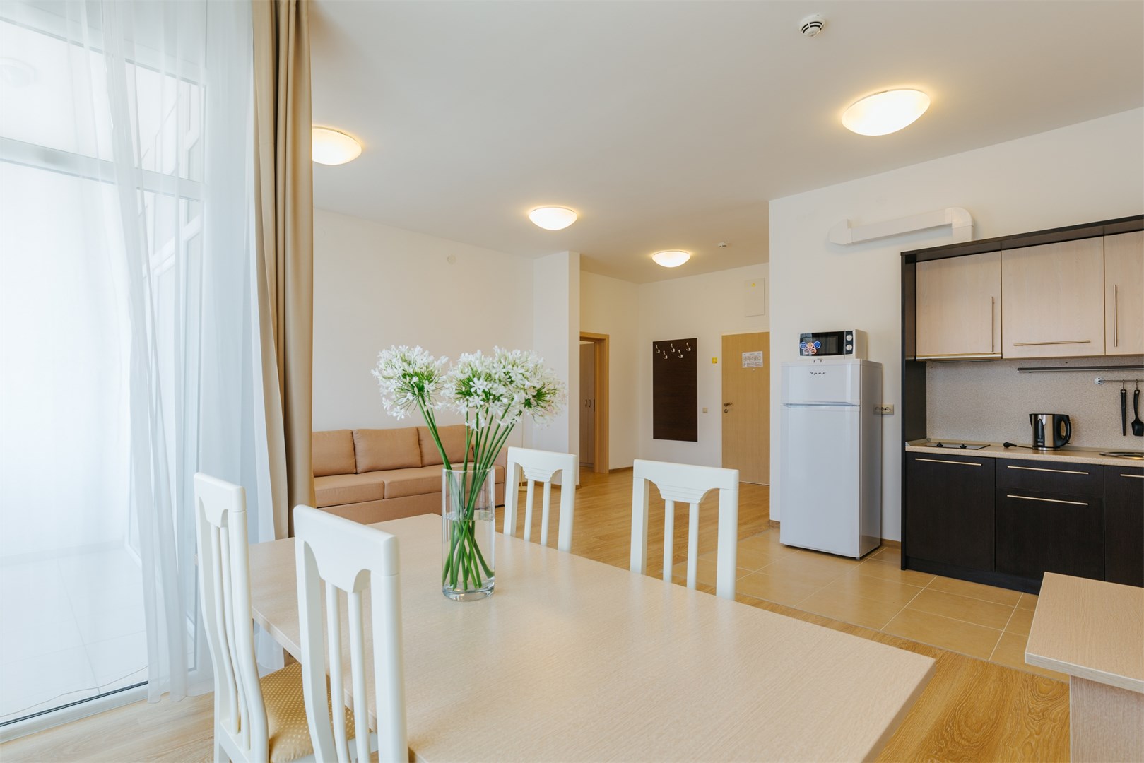 Номер категории “Апартамент”. Современный, уютный, просторный номер с одной двуспальной или двумя раздельными кроватями. Оснащен кухонным модулем и набором посуды для возможности самостоятельного приготовления пищи. Номера данной категории расположены в корпусах A, B, D, E, F, G, H, K. Мы бронируем только категорию номера, конкретный номер будет определен непосредственно в день заезда. В номере 2 основных спальных места (и одно дополнительное), которые могут быть использованы для размещения взрослого или ребенка от 6 до 12 лет. Допускается размещение двух детей до 12 лет на одном дополнительном месте (раскладной диван). Детям от 0 до 3 лет бесплатно предоставляется кровать-манеж. Дети от 3 до 5 лет включительно размещаются без предоставления отдельного спального места. Обращаем Ваше внимание, что вид на море может быть как прямым, так и боковым, в том числе с балкона.