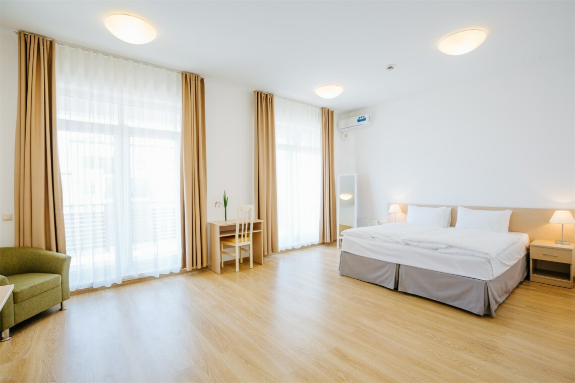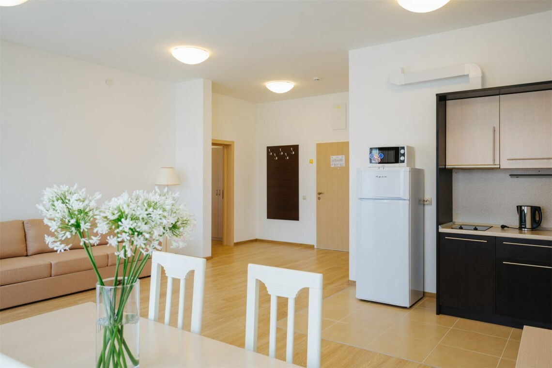 Номер категории “Апартамент”. Современный, уютный, просторный номер с одной двуспальной или двумя раздельными кроватями. Оснащен кухонным модулем и набором посуды для возможности самостоятельного приготовления пищи. Номера данной категории расположены в корпусах H, K, L, N. Мы бронируем только категорию номера, конкретный номер будет определен непосредственно в день заезда. В номере 2 основных спальных места (и одно дополнительное), которые могут быть использованы для размещения взрослого или ребенка от 6 до 12 лет. Допускается размещение двух детей до 12 лет на одном дополнительном месте (раскладной диван). Детям от 0 до 3 лет бесплатно предоставляется кровать-манеж. Дети от 3 до 5 лет включительно размещаются без предоставления отдельного спального места.