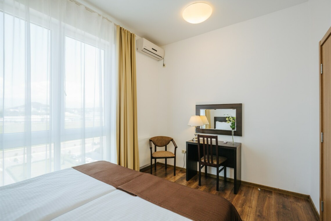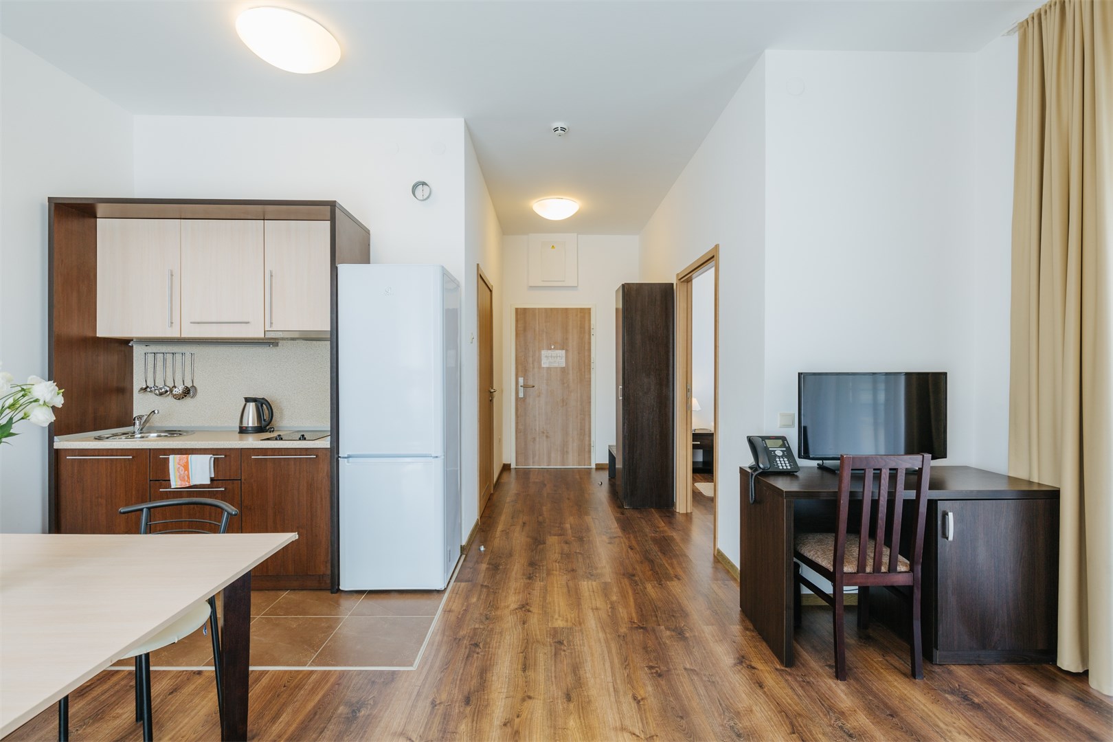 Номер “Первой категории”. Просторный светлый номер с большой гостиной зоной и отдельной спальней, оборудованный кухонным модулем с набором посуды для возможности самостоятельного приготовления пищи, располагает всем необходимым для комфортного пребывания маломобильных гостей*: – широкие дверные проемы; – поручни в ванной комнате; – специально оборудованный санузел с раковиной удобной высоты и формы. Номера данной категории находятся в корпусах H, I, J и K. Мы бронируем только категорию номера, конкретный номер будет определен непосредственно в день заезда. В номере 2 основных спальных места (и одно дополнительное), которые могут быть использованы для размещения взрослого или ребенка от 6 до 12 лет. Детям от 0 до 3 лет бесплатно предоставляется кровать-манеж. Дети от 3 до 5 лет включительно размещаются без предоставления отдельного спального места. Только для маломобильных гостей (при предоставлении удостоверения инвалида 1 или 2 группы) дополнительно бесплатно по запросу : – Номер гостя комплектуется стульчиком для принятия душа – Предоставляется комплиментарная парковка – Предоставляется комплиментарное посещение Фитнес-центра (в присутствии сопровождающего) – Предоставляется доступ во все кварталы – При заезде гостю предлагается легкая инвалидная коляска как альтернатива для передвижения внутри отеля. Если апартаменты расположены на первом этаже, то они оборудованы открытой террасой (без балкона). *Данный тип номера могут бронировать все гости, даже не имеющие ОВЗ.