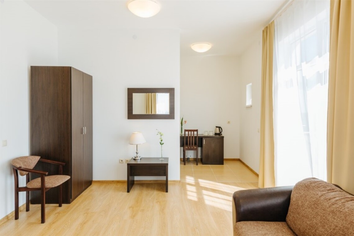 Номер “Первой категории”. Просторный и комфортабельный номер, рассчитанный на проживание 5-6 человек. Подходит для размещения большой семьи или дружной компании. Оснащен кухонным модулем и набором посуды для возможности самостоятельного приготовления пищи. Номера данной категории находятся в корпусах F, H, I, J и K. Мы бронируем только категорию номера, конкретный номер будет определен непосредственно в день заезда. В номере 5 основных спальных мест (и одно дополнительное), которые могут быть использованы для размещения взрослого или ребенка от 6 до 12 лет. Детям от 0 до 3 лет бесплатно предоставляется кровать-манеж. Дети от 3 до 5 лет включительно размещаются без предоставления отдельного спального места. Если апартаменты расположены на первом этаже, то они оборудованы открытой террасой (без балкона).