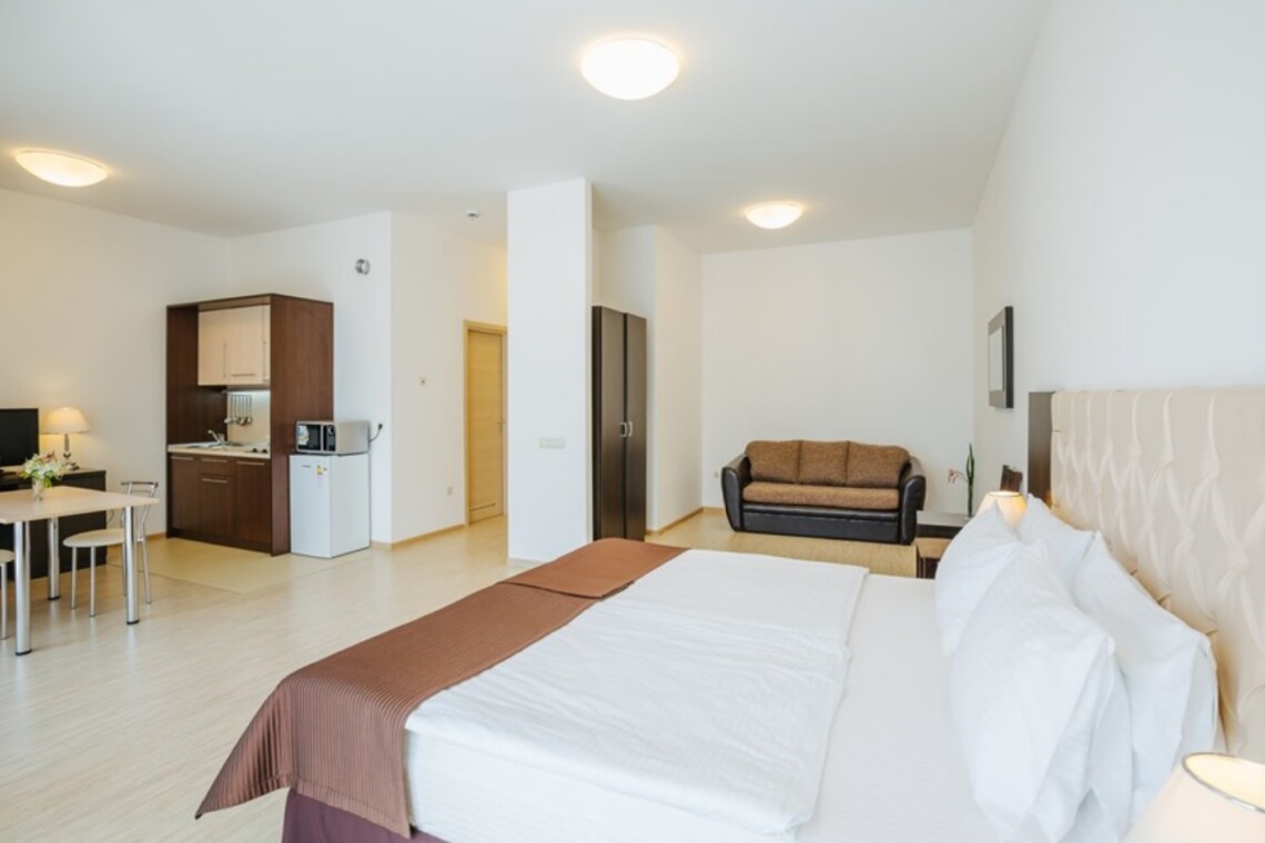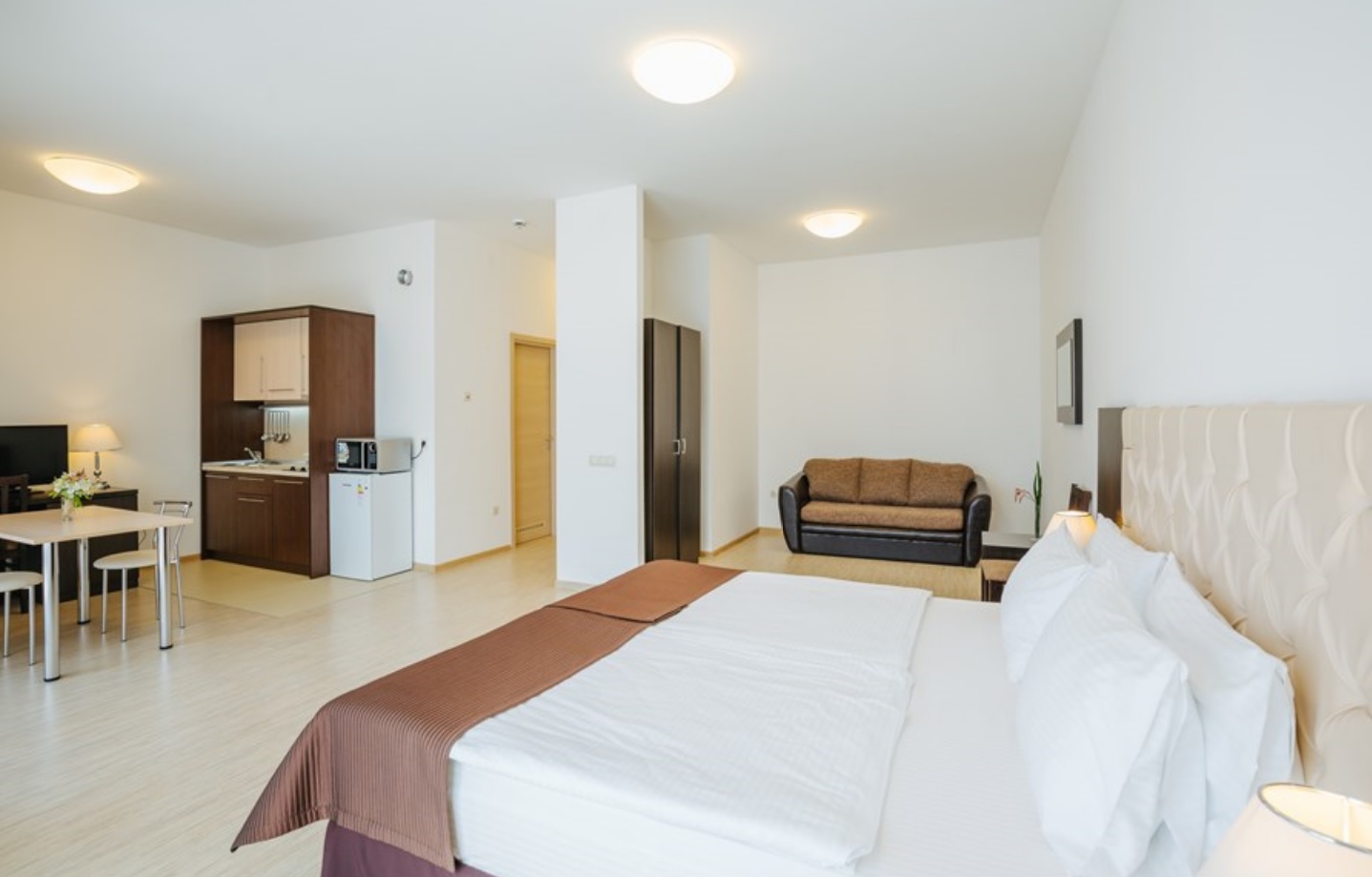 Номер “Первой категории”. Современный, уютный, просторный номер с одной двуспальной или двумя раздельными кроватями. Оснащен кухонным модулем и набором посуды для возможности самостоятельного приготовления пищи. Номера данной категории находятся в корпусах G, H, I, J и K. Мы бронируем только категорию номера, конкретный номер будет определен непосредственно в день заезда. В номере 2 основных спальных места (и одно дополнительное), которые могут быть использованы для размещения взрослого или ребенка от 6 до 12 лет.  Если апартаменты расположены на первом этаже, то они оборудованы открытой террасой (без балкона).