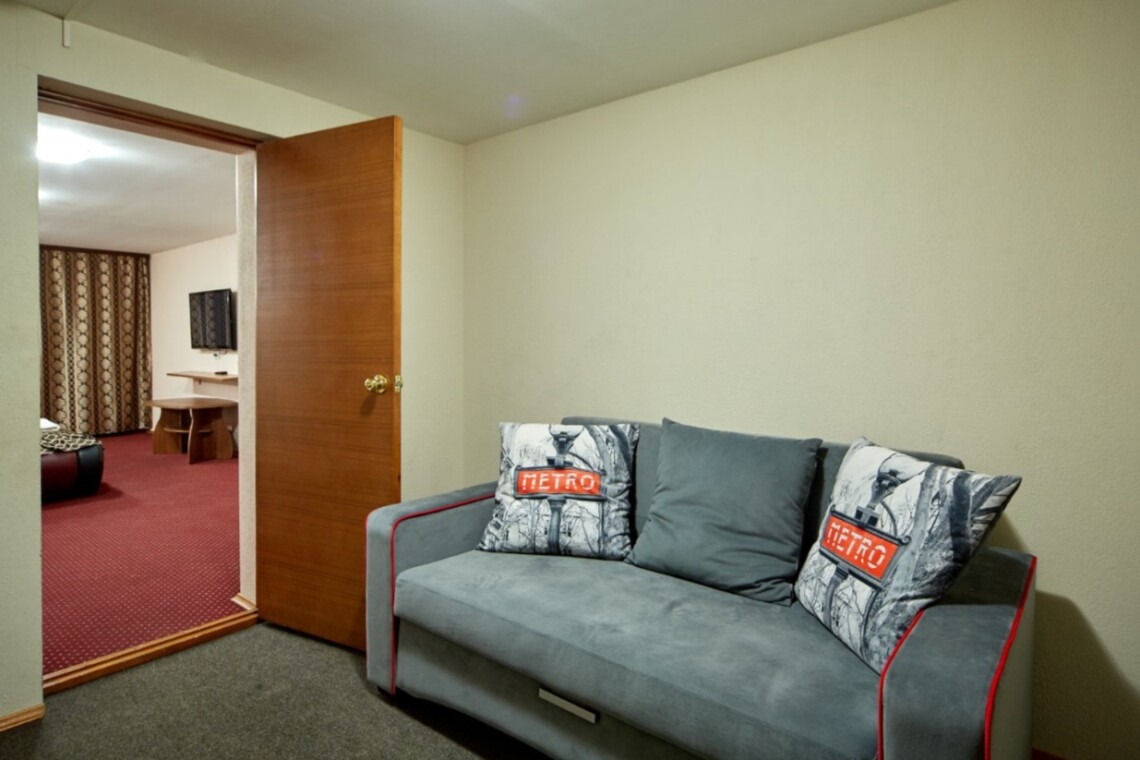 На первом этаже просторная гостиная с обеденной группой, холодильником, телевизором и музыкальным центром. Четыре спальни: две спальни с двуспальной кроватью и две спальни с двумя раздельными кроватями. Также на первом этаже мини сауна с душем для проживающих в коттедже гостей, два санузла и отдельная душевая. Есть кулер с питьевой водой, чайник и чайные пары.