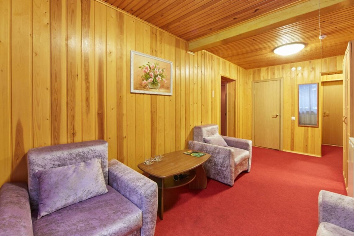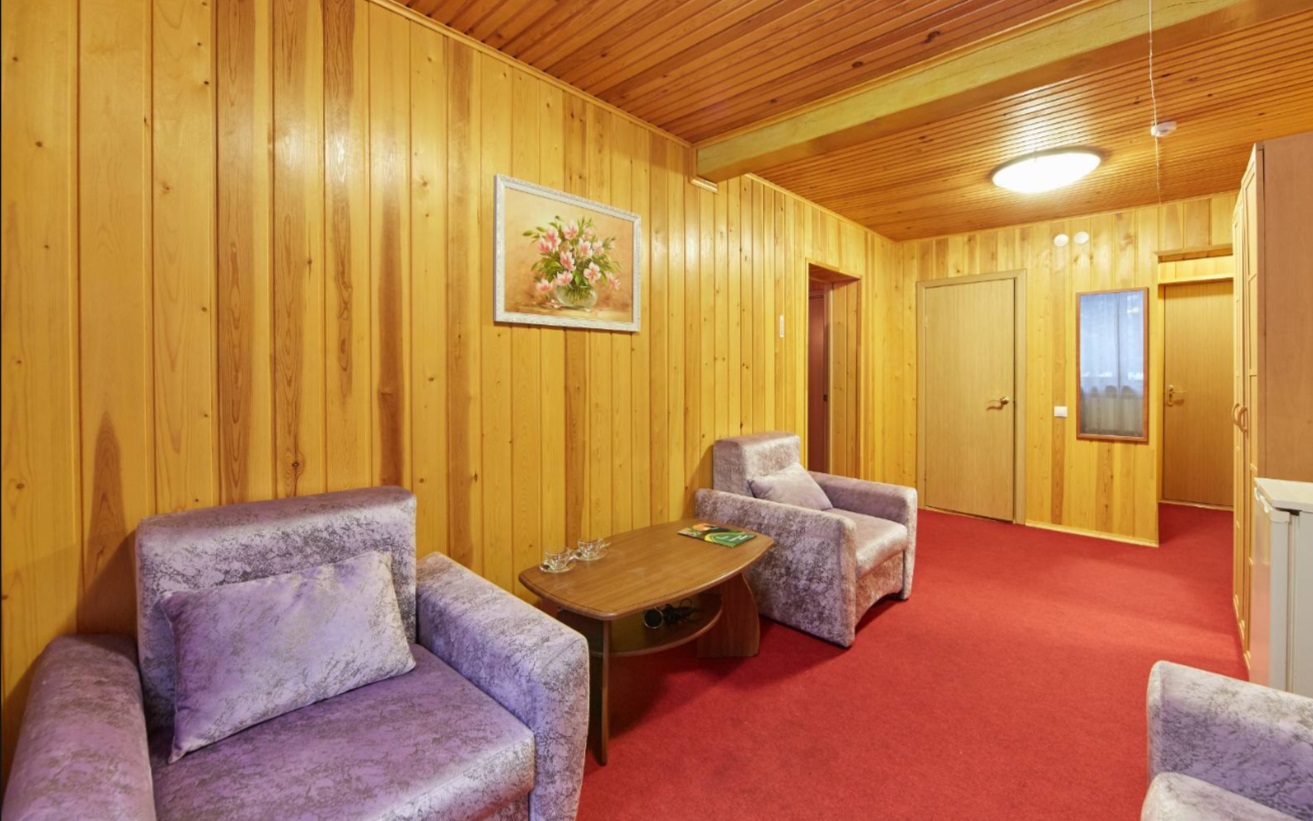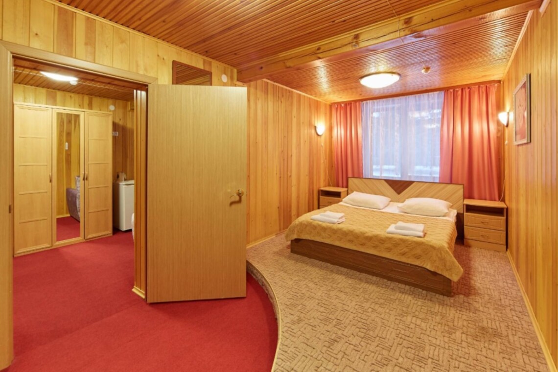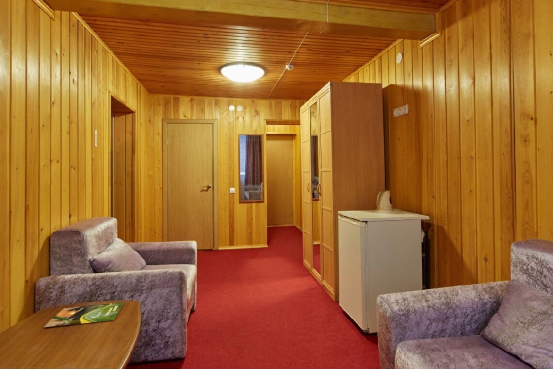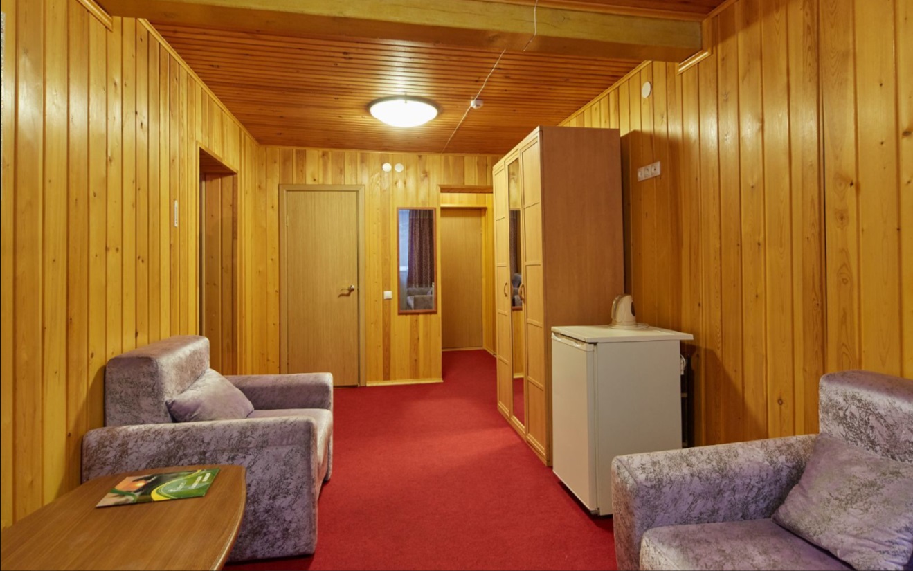 Двухэтажный деревянный корпус На 1-м этаже размещены номера первой категории класса «люкс»: 5 номеров однокомнатных и 6 номеров двухкомнатных; и два просторных общих холла для отдыха.