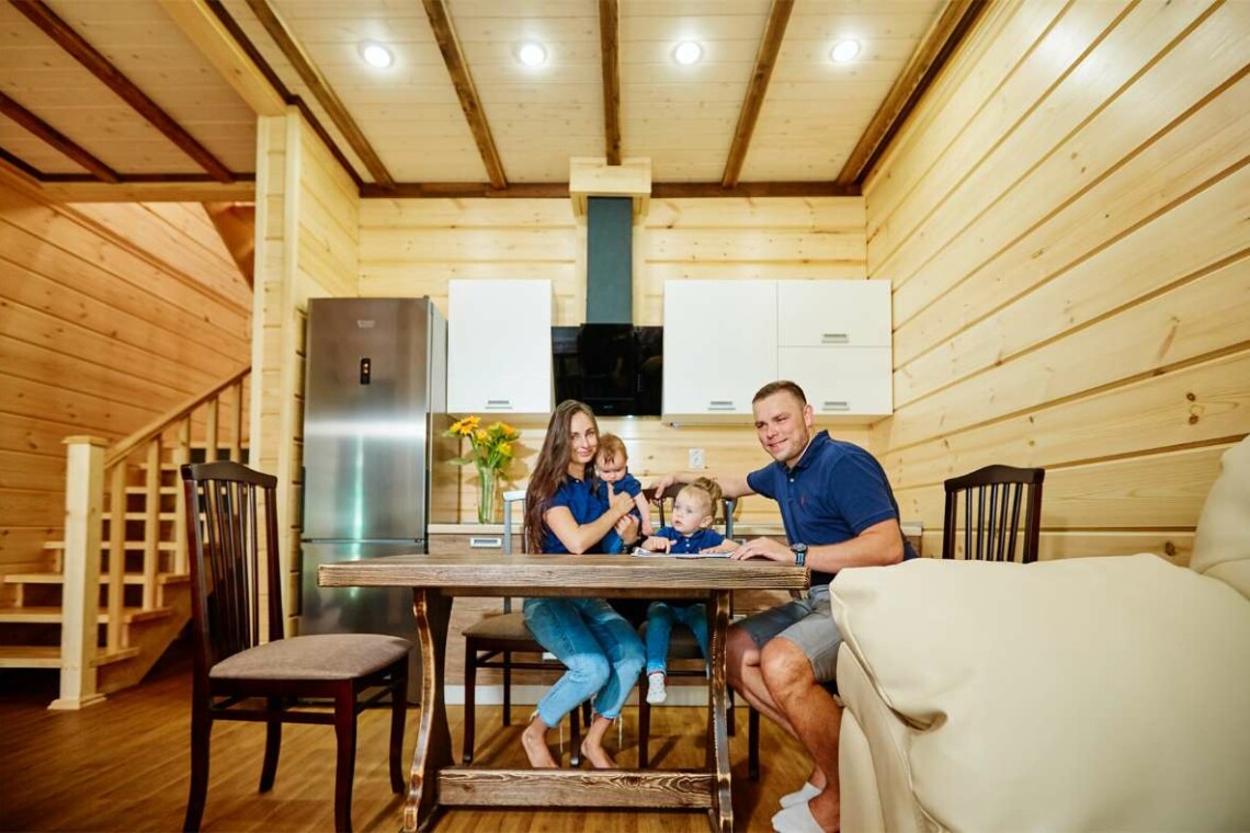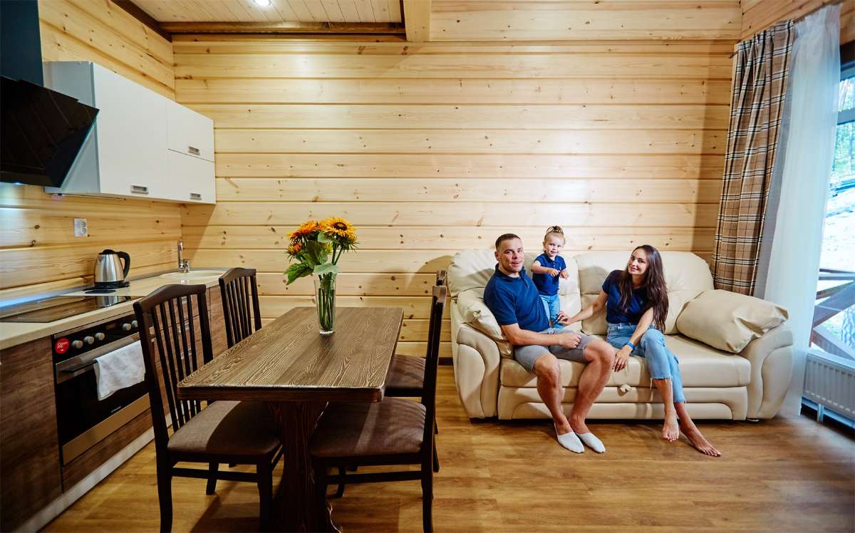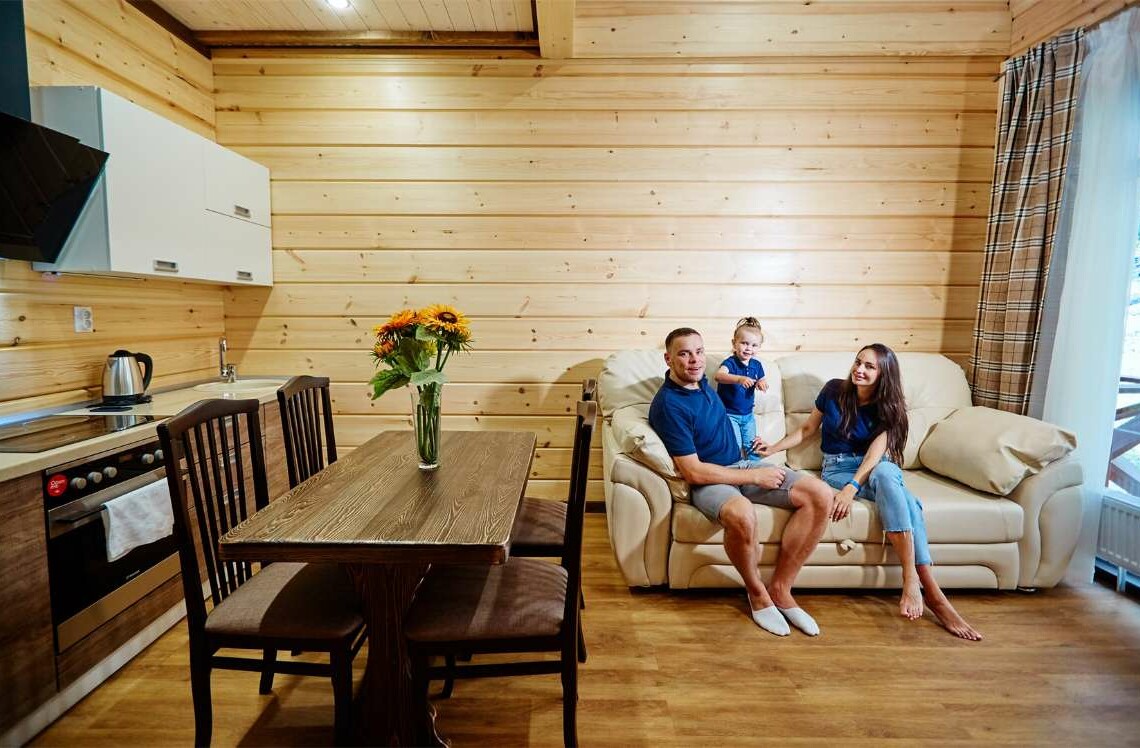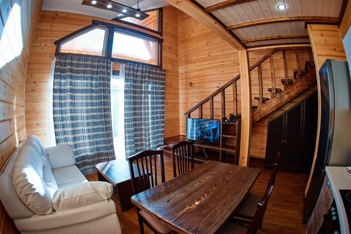Просторные двухъярусные апартаменты с панорамными окнами и балконом. Расположены в новом апарт-отеле «Дом Олега Митяева». Внутреннее оформление апартаментов «Люкс» выполнено в стиле Шале с стенами из светлого бруса и дизайнерской мебелью из массива дерева в темных тонах. Апартаменты «Люкс» прекрасно подойдут для проживания 5 человек в полной гармонии с природой. Вас ждут: просторная гостиная с кухонной зоной (плита, холодильник, микроволновка, посуда), стол и стулья, диван-кровать и кресло-кровать, шкаф-купе, телевизор, телефон, сейф, мини-бар и wi-fi. Уютная спальня на втором этаже с двуспальной кроватью и креслом-кроватью. Санузел с душевой кабиной, тёплым полом, туалетными принадлежностями и феном.