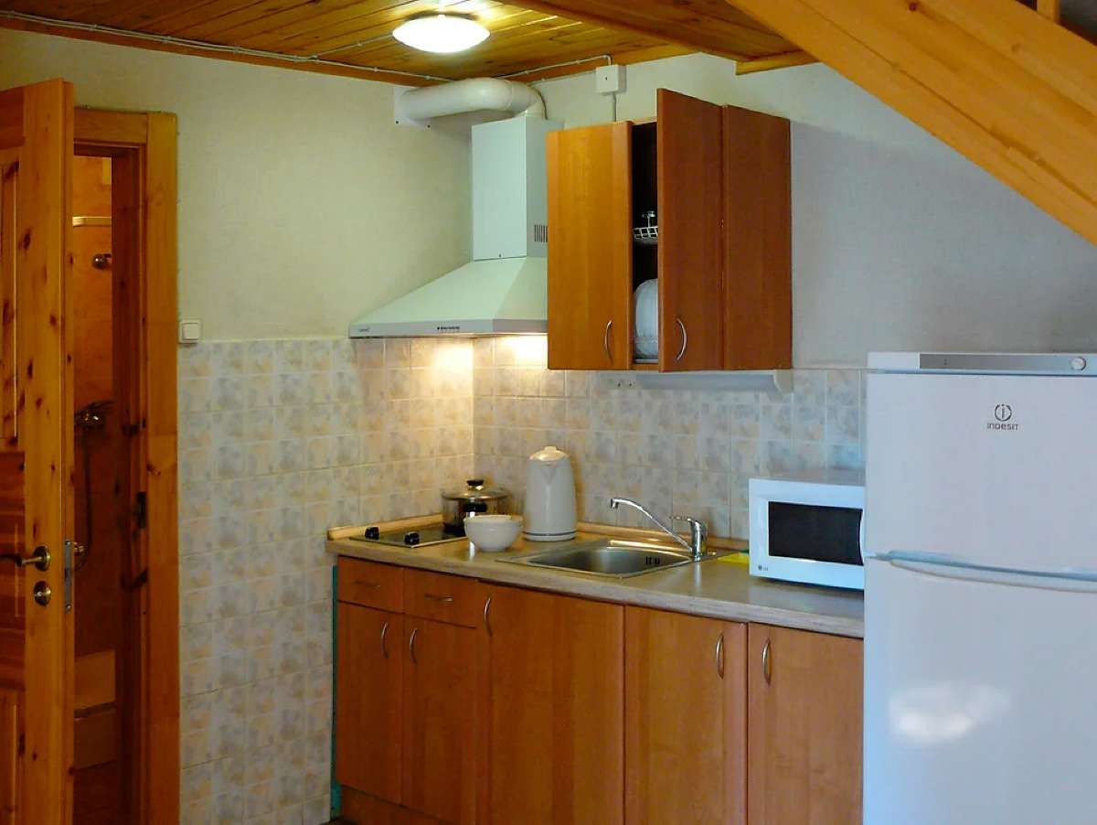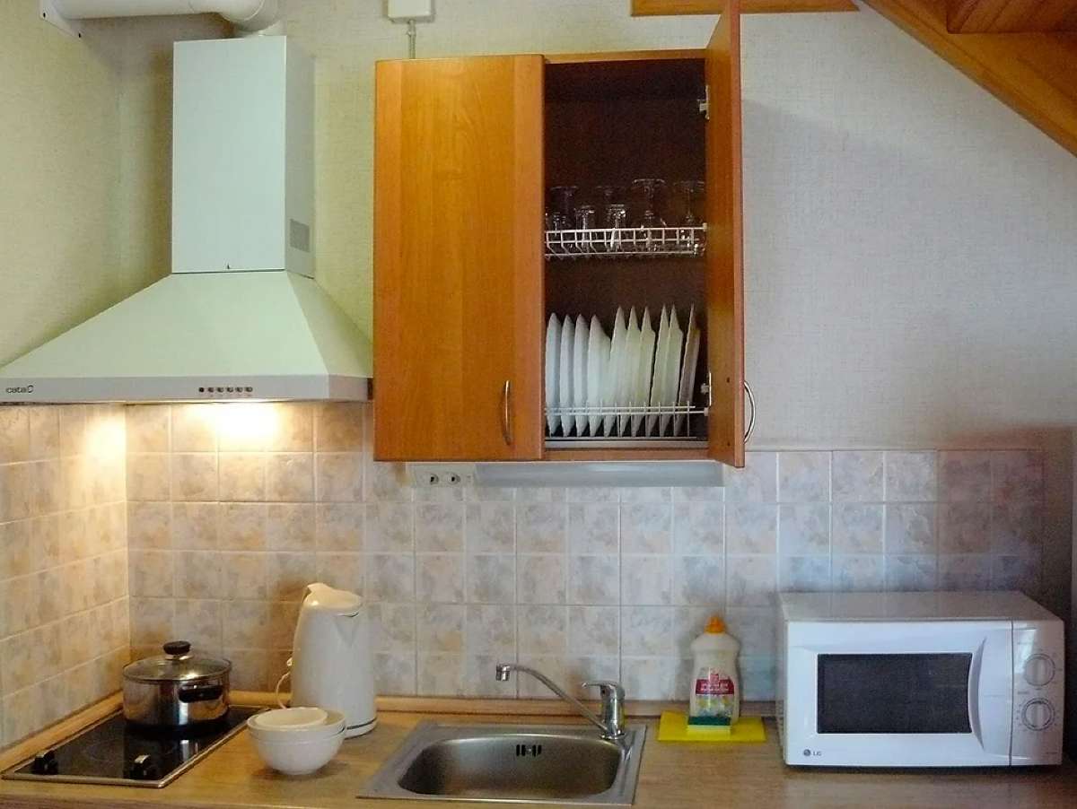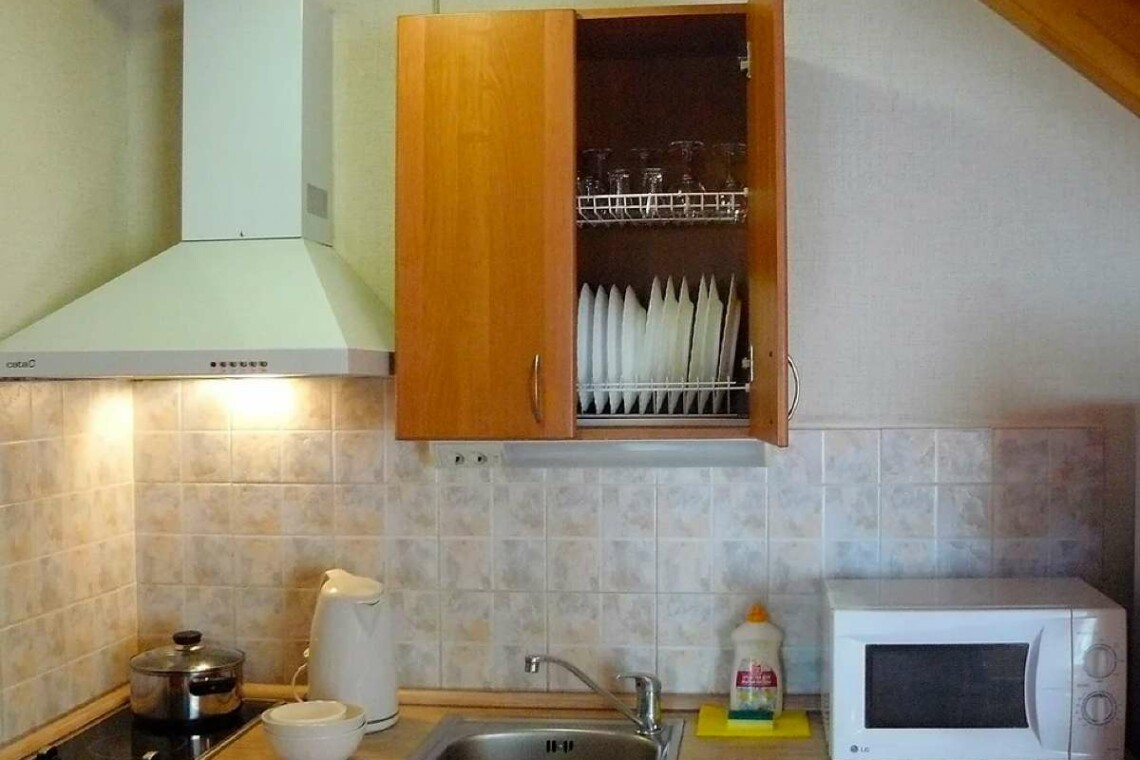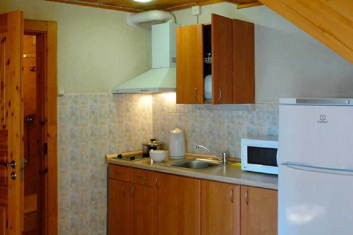 Кухня оснащена двухконфорочной электроплитой, микроволновой печью, двухкамерным холодильником и чайником. Набор посуды рассчитан на проживание 6-и человек.