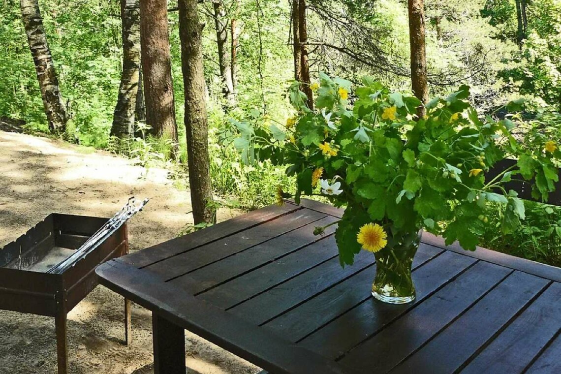 Рядом со входом в апартамент на небольшой выделенной площадке находятся мангал, столик и скамейки.