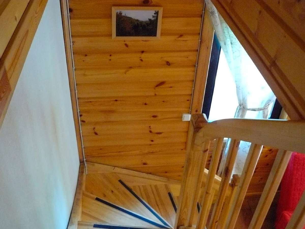 На первом этаже расположены: гостиная с кухонным фронтом , санузел с сауной и душем. Лестница на второй этаж ведет из гостиной.