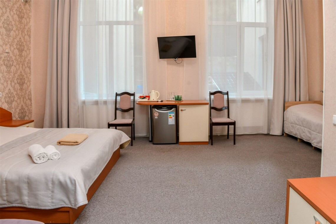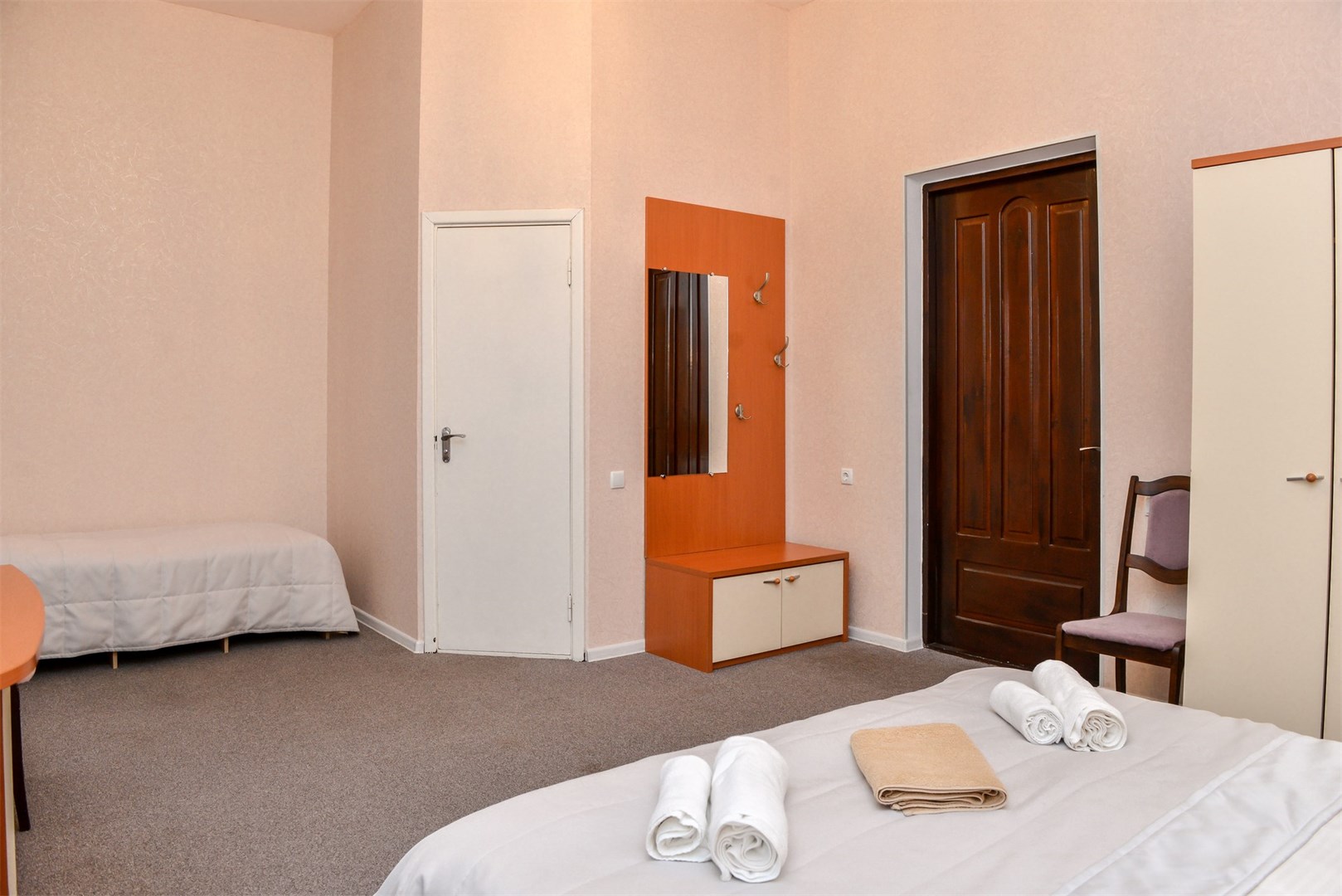 В номере: Двухспальная кровать, односпальная кровать, шкаф для одежды, ТВ, холодильник, центральная система кондиционирования, Wi-Fi, санузел (душ, умывальник , туалет, принадлежности для душа, полотенца, фен), чайная станция, посуда, сушилка для белья.