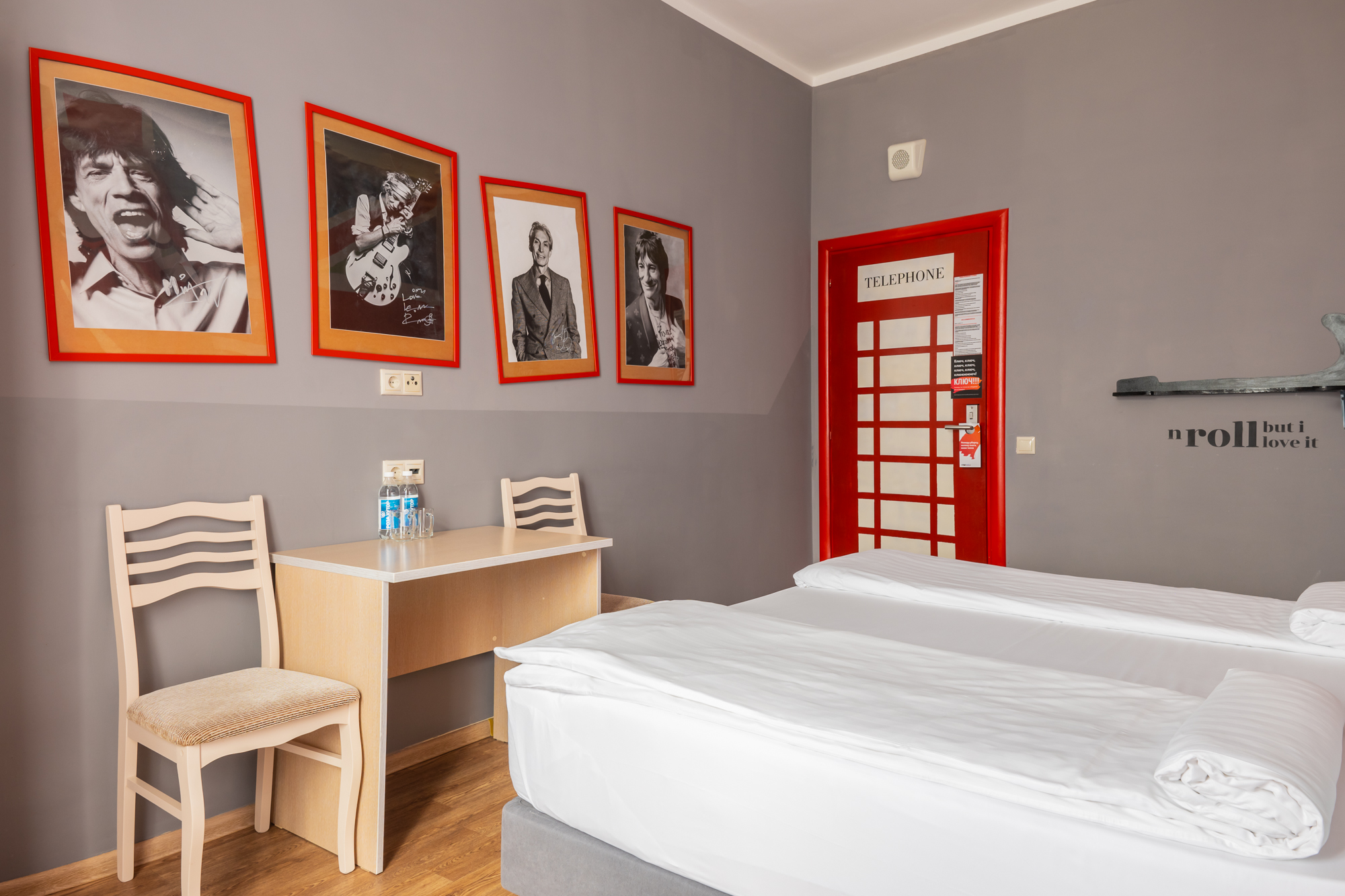 2 прикроватные тумбочки, стол, стул, шкаф, 2 стакана, 2 бутылки воды