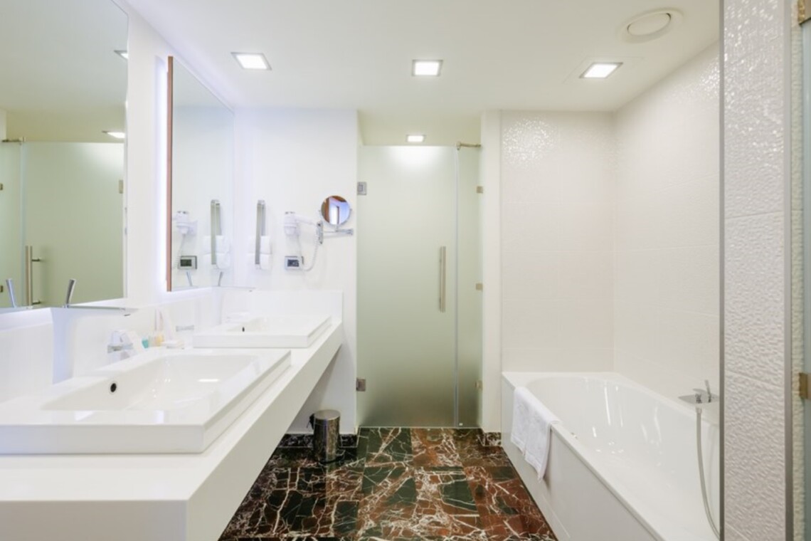 Номер 68-74 кв.м. Пространство функционально разделено на комфортную зону отдыха, рабочий кабинет и спальню. Ванная комната декорирована зеркалами, оснащена отдельной кабиной с ливневым душем и ванной.