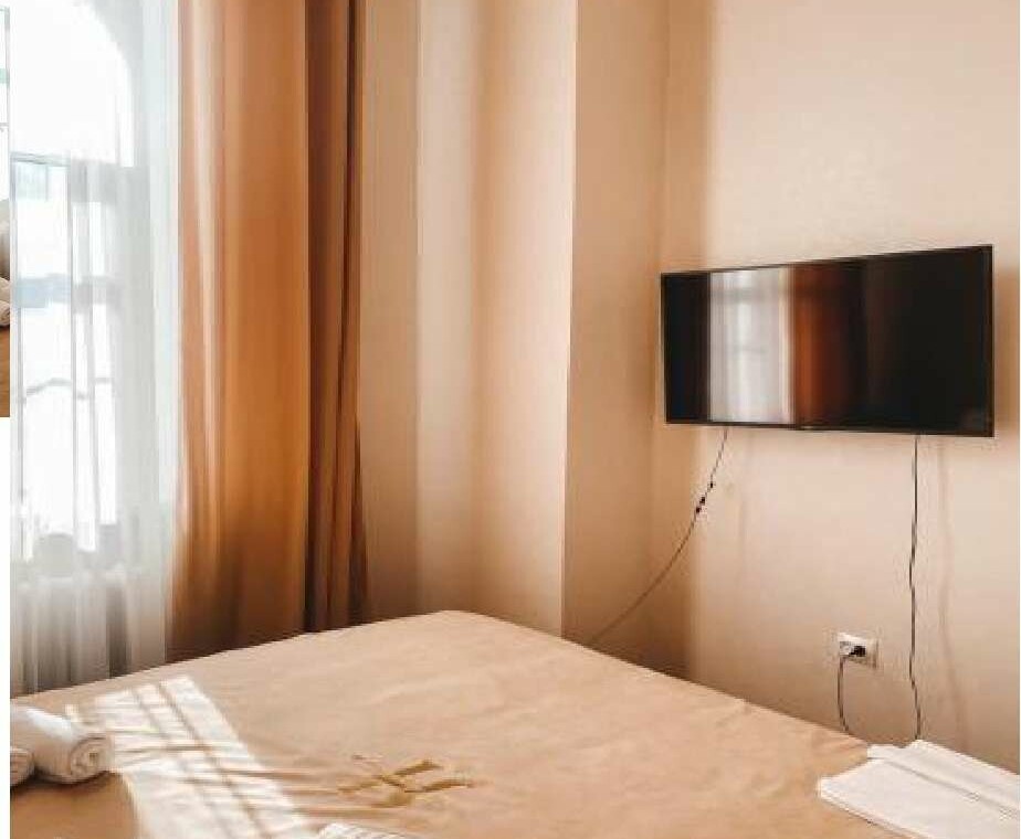 В номере: 1 двуспальная кровать, 2 тумбочки, стол, телевизор, 3 полотенца на каждого гостя, чайник.