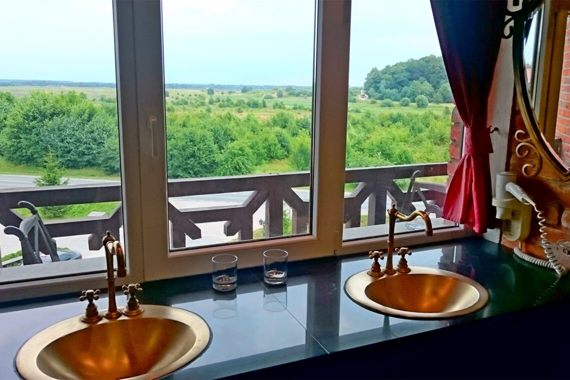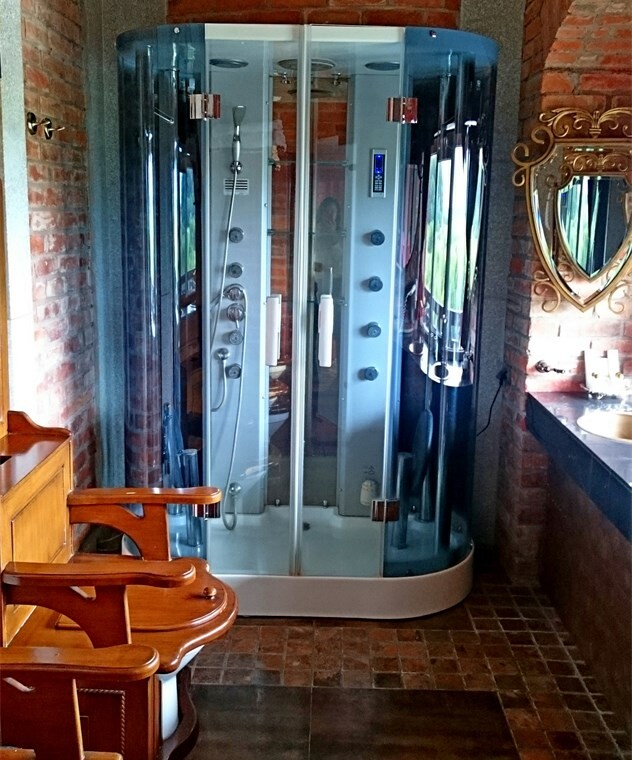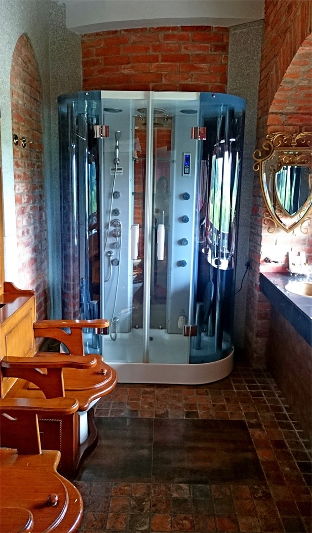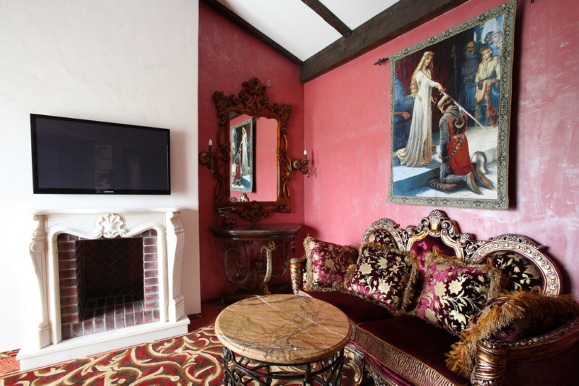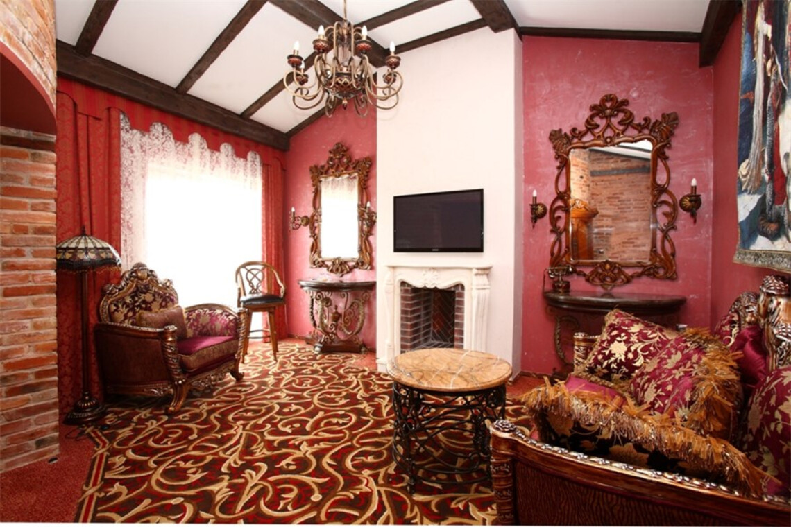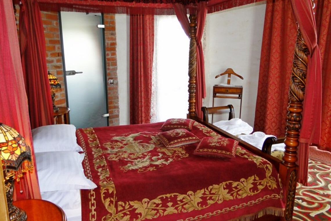 «Нессельбек» — замок, построенный по всем канонам зодчества. Поэтому вся обстановка выдержана в аутентичном стиле. Мебель изготовлена по специальному заказу: стулья и стулья с расписными спинками и кожаной обивкой, изящные столики, роскошные балдахины и портьеры. Номер «Романтический» расположен на первом этаже в 2-х верхних этажах. На первом уровне – гостиная, спальня, расположенная в башне, кровать с балдахином, с/у, ванная комната с 2-х большой душевой кабиной. На втором уровне – 2-х местное джакузи с подсветкой и мебелью для отдыха. Площадь 60 м.кв. Высота потолка 7 метров. Номер с двумя балконами. Завтрак стол включен в стоимость номера.