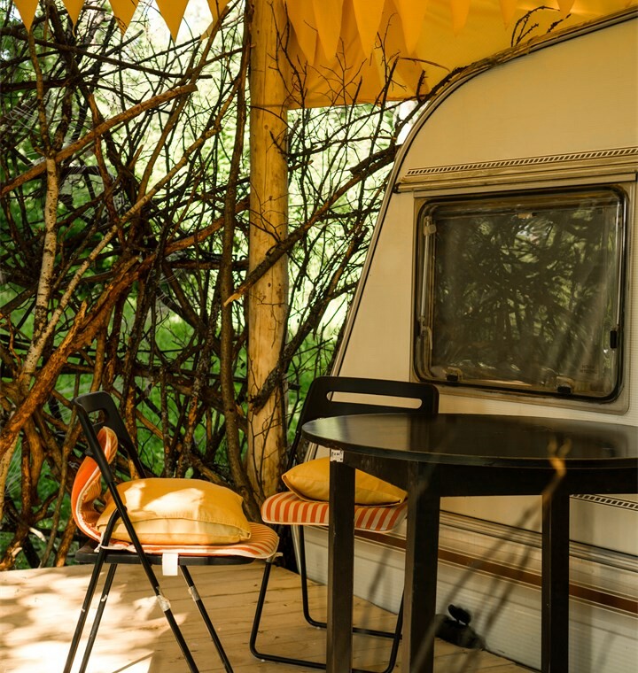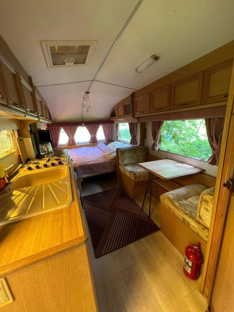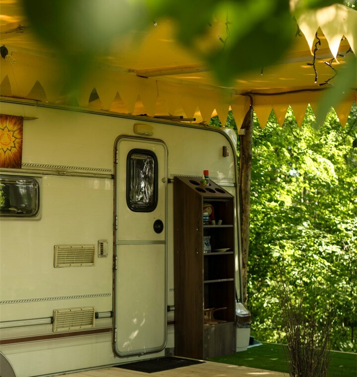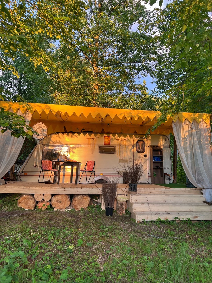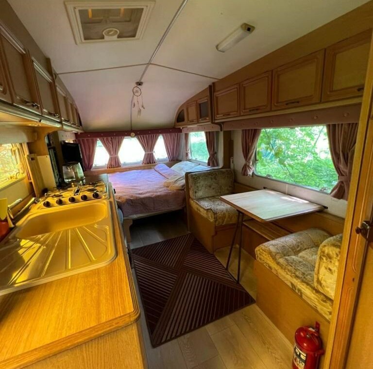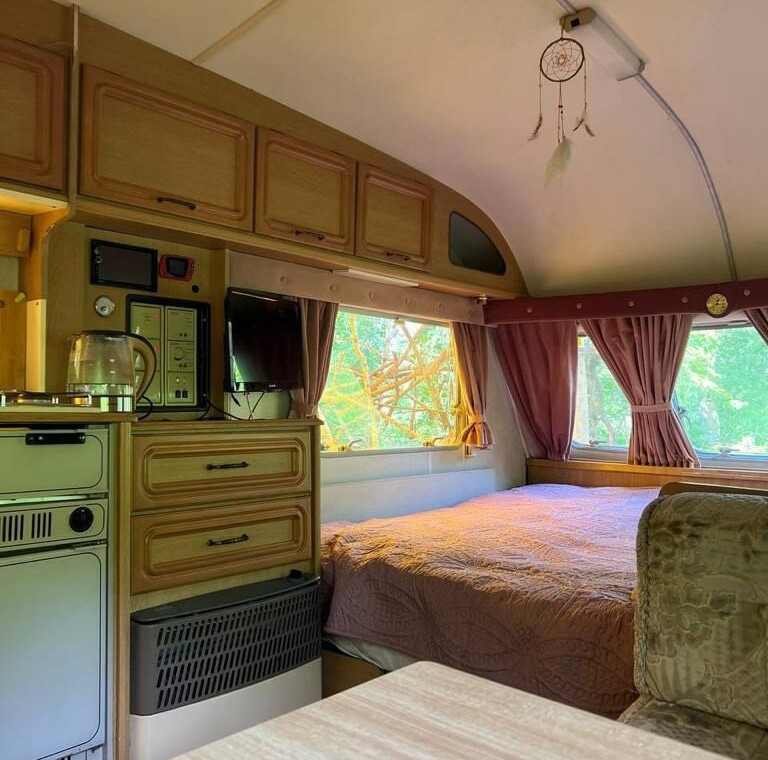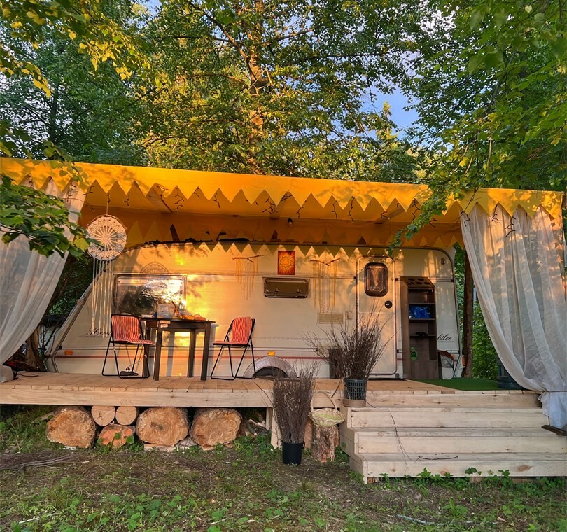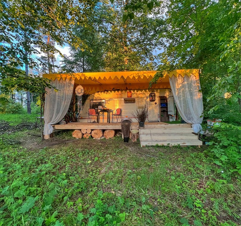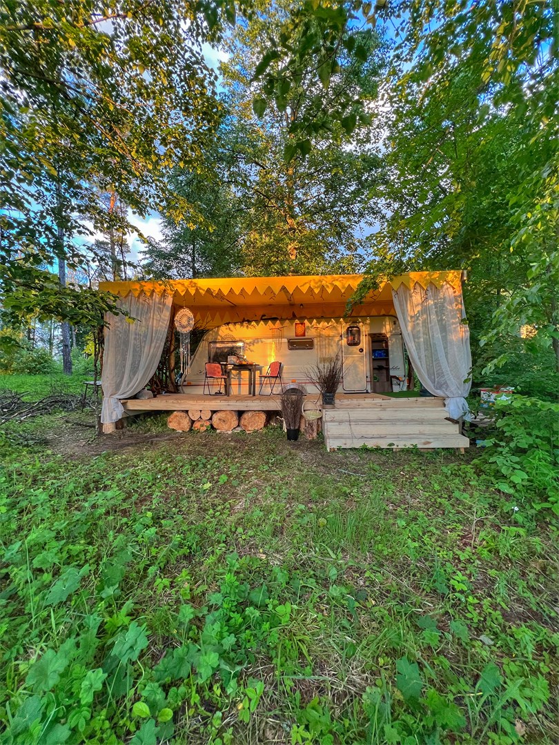 Уютный кемпер с округом, в отдаленном живописном уголке с чудесным видом на лес и закат. Имеется свет, горячая/холодная вода, душ/туалет внутри. В потребление входит постельное белье, посуда, банные полотенца, питьевая вода. Рассчитаны на размещение троих человек.