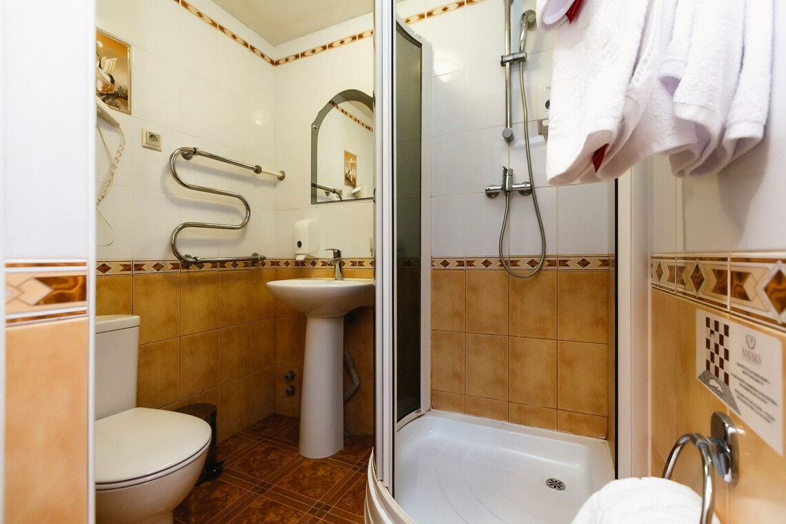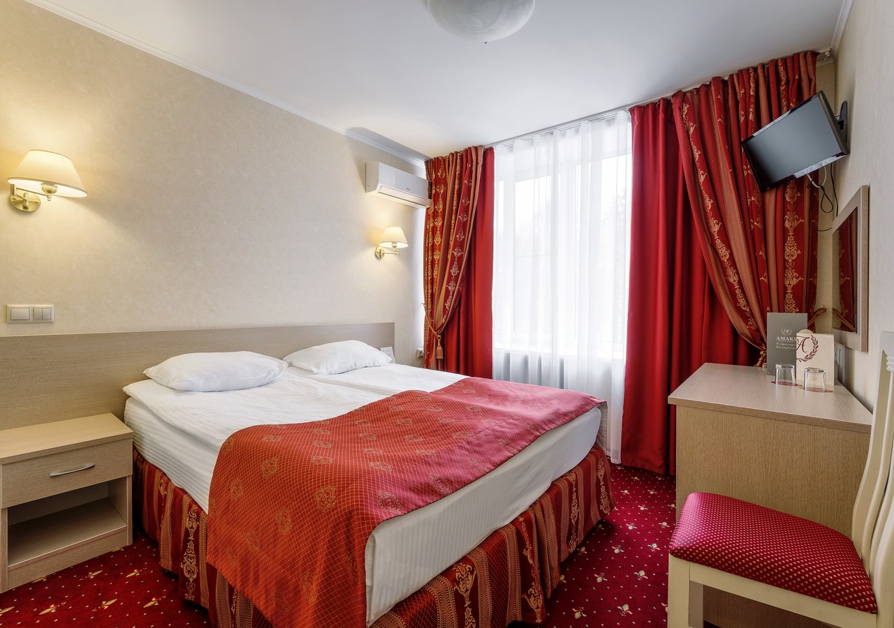 Комфортабельный двухместный номер с двуспальной кроватью. В номере: двуспальная кровать, шкаф для верхней одежды, тумба для обуви и багажа, письменный стол с зеркалом, телевизор, бесплатный Wi-Fi, телефон. Ванная комната оснащена душевой кабиной, туалетными принадлежностями, комплектом полотенец.