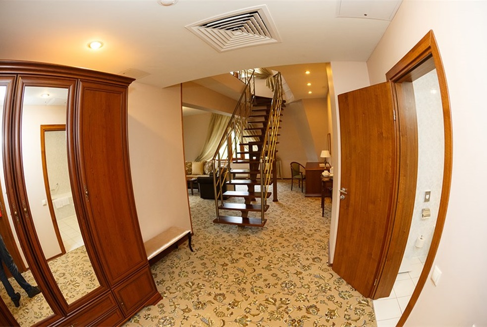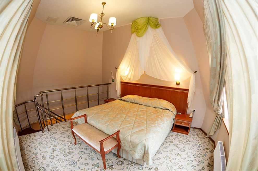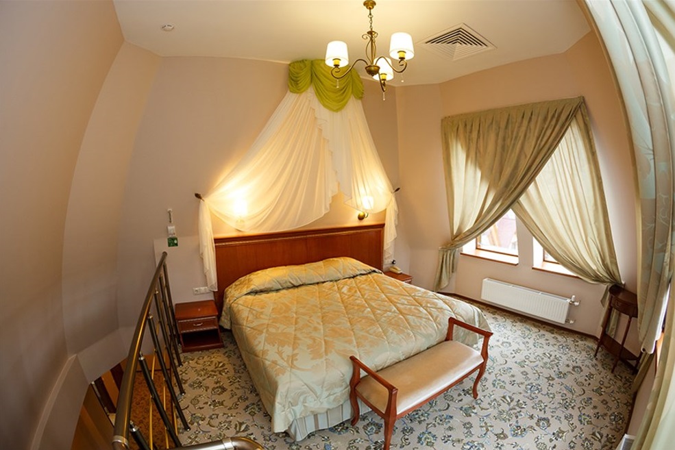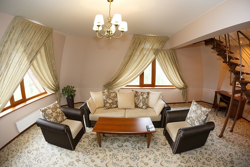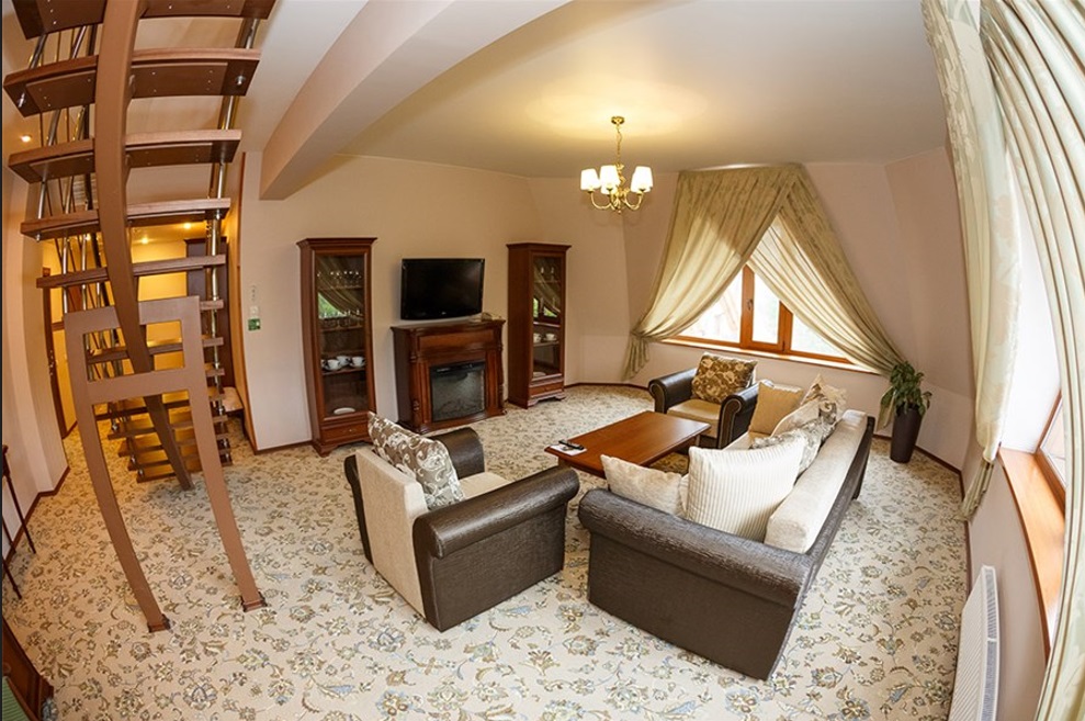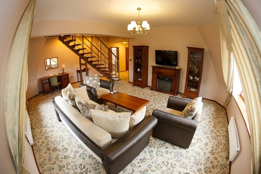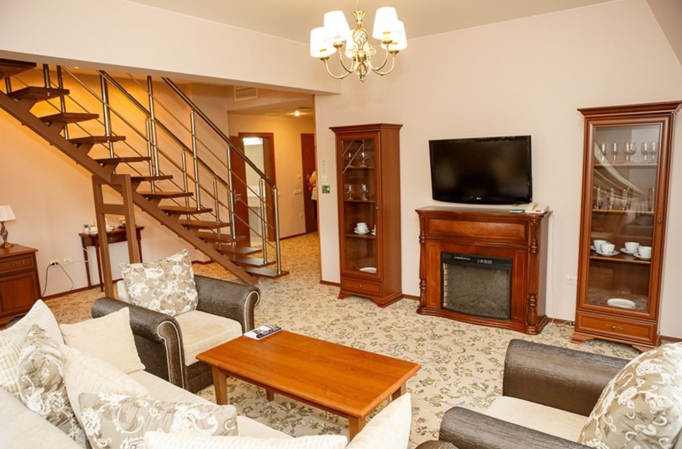 Двухэтажный элегантный номер с индивидуальным дизайном порадует самых взыскательных Гостей. Номер состоит из двух комнат: спальни с большой кроватью (king size) и уютной гостиной с комплектом мягкой мебели (раскладной диван) и электрическим камином. Из окон номера открывается прекрасная панорама альпийской горки и хвойного леса. В номере возможно 4-х местное размещение.