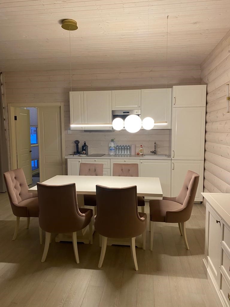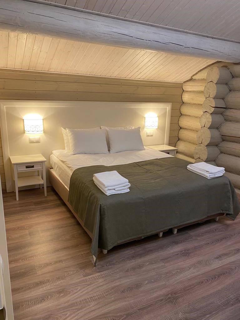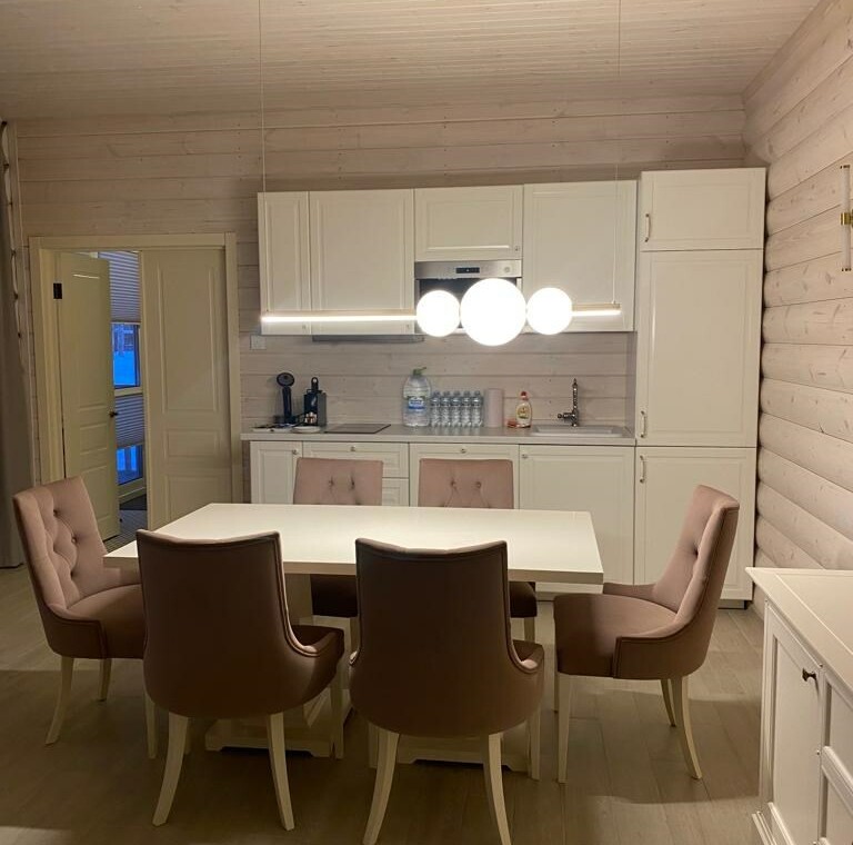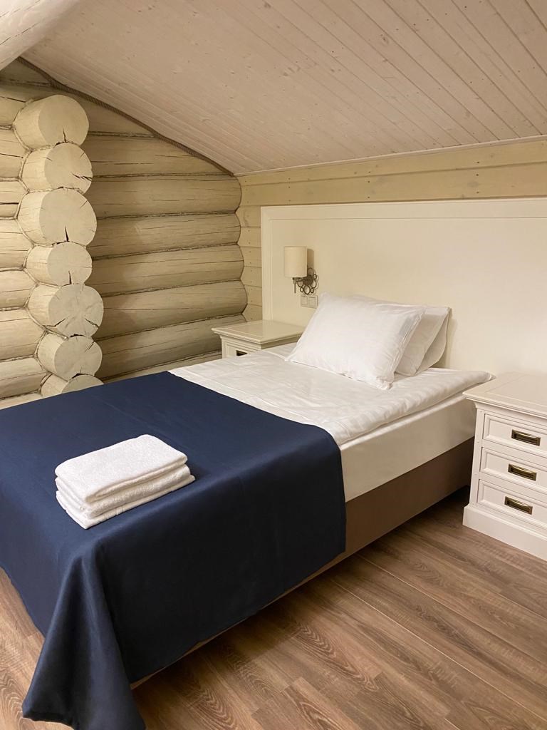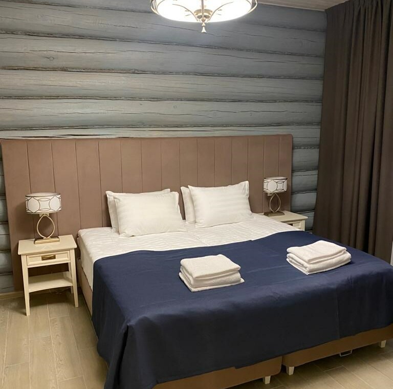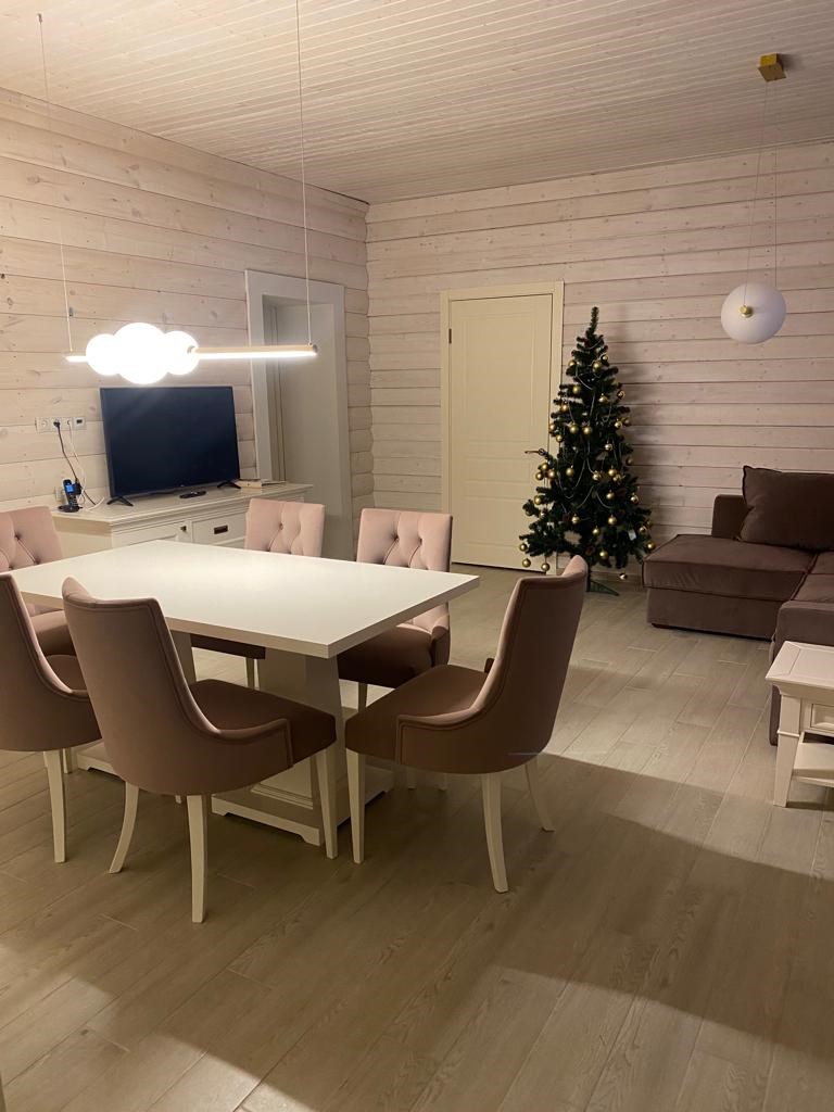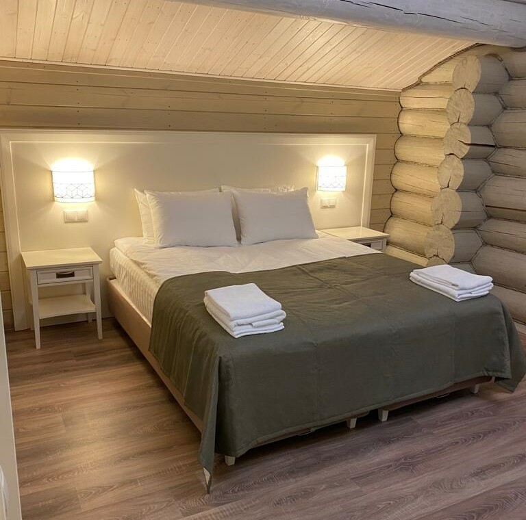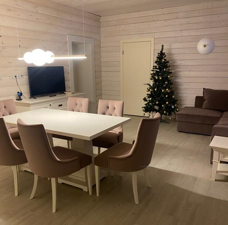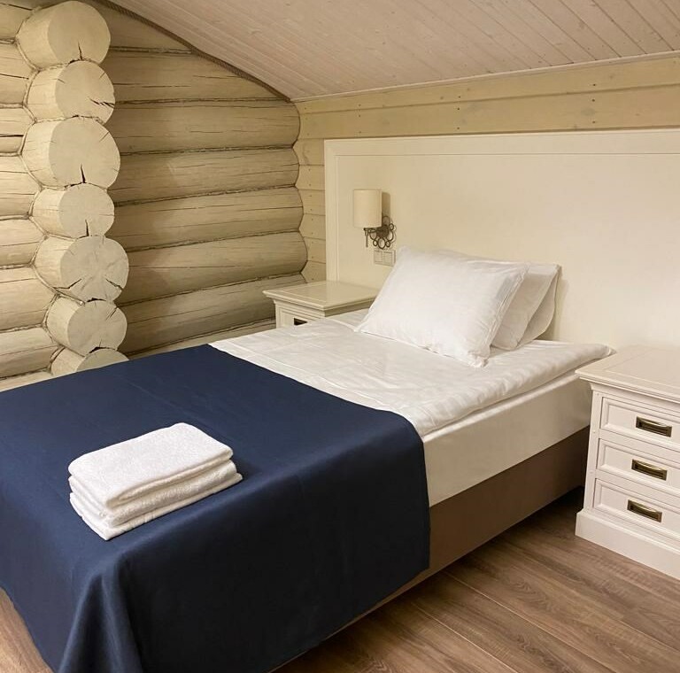 Просторные двухэтажные деревянные дома – коннект для большой семьи или большой компании: три спальни с двуспальными и односпальными кроватями, большая гостиная, уютная кухня-столовая с большим обеденным столом.