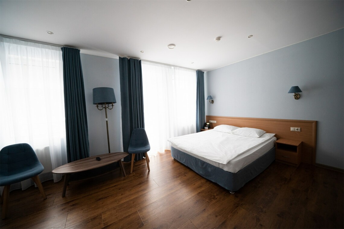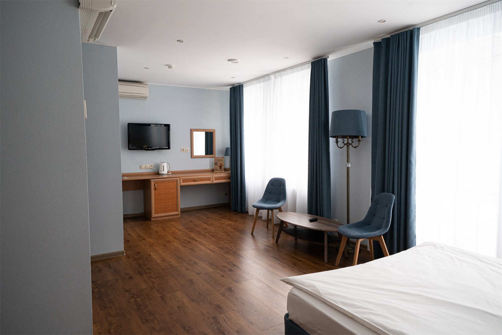 Уютная каюта площадью 20 кв. м с двуспальной кроватью, шкафом-купе, телевизором, письменным и журнальным столом, телефоном, индивидуальным сейфом, санузлом с душевой кабиной и феном. К услугам гостей – бесплатный WI-FI. Количество основных мест – 2.