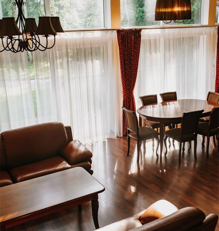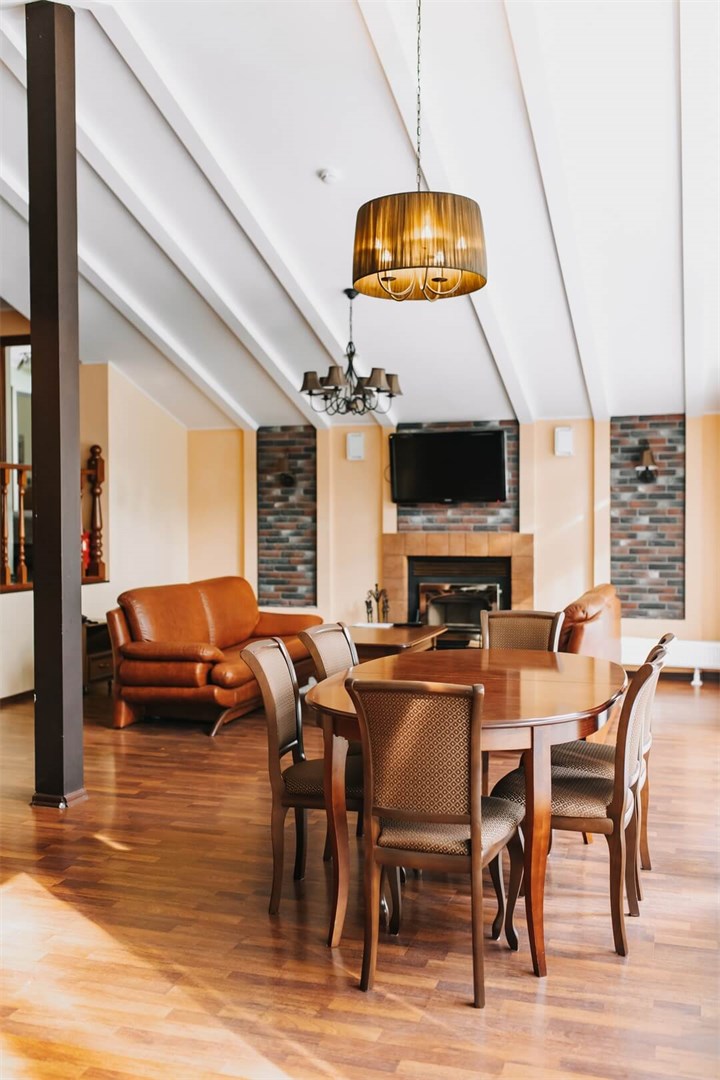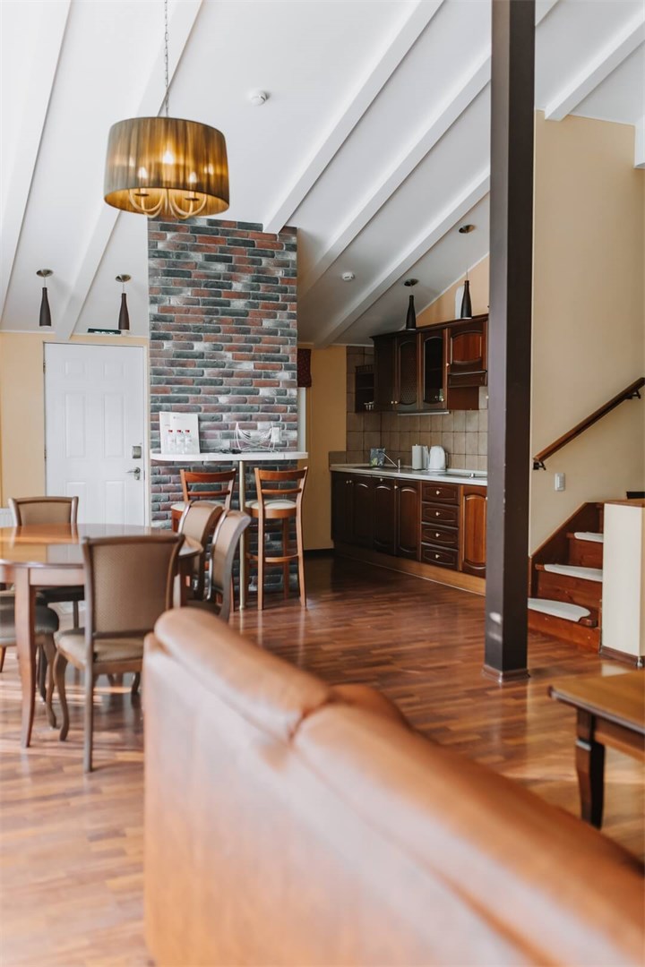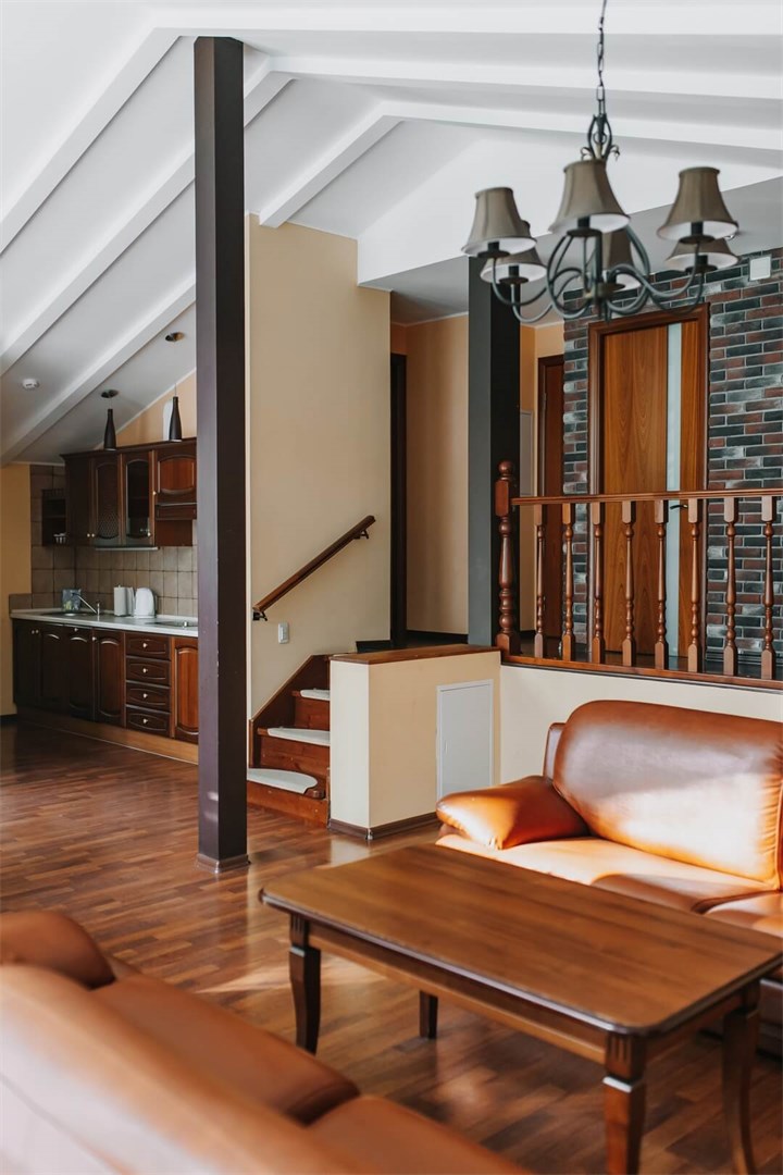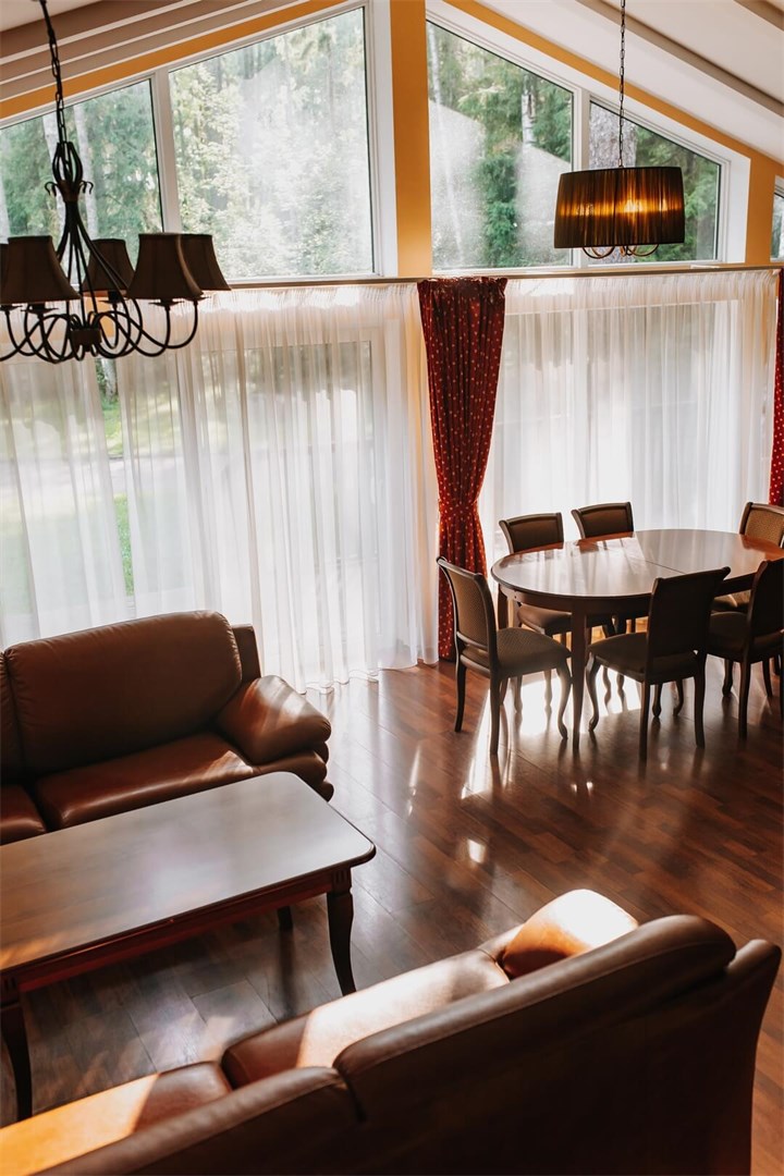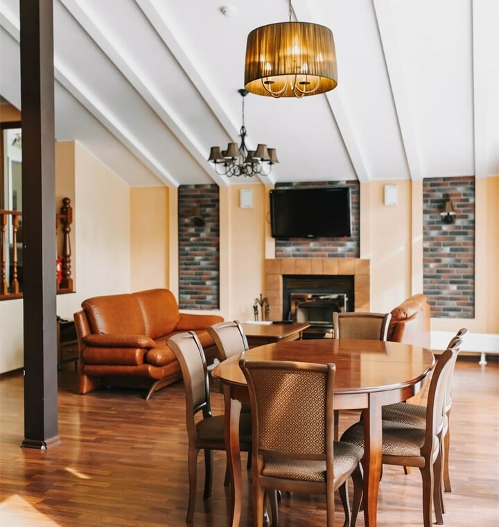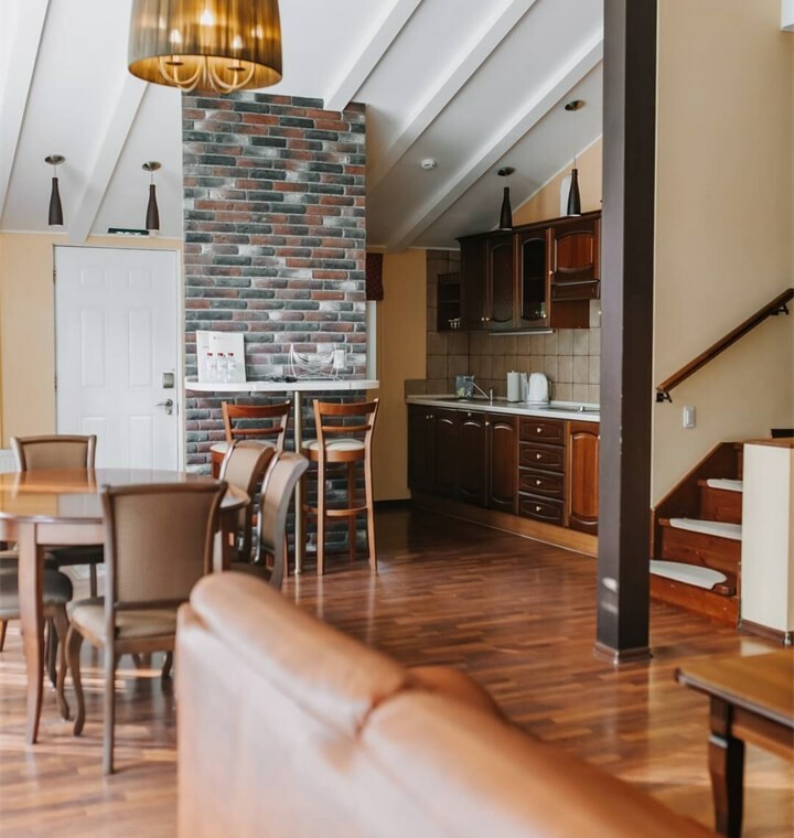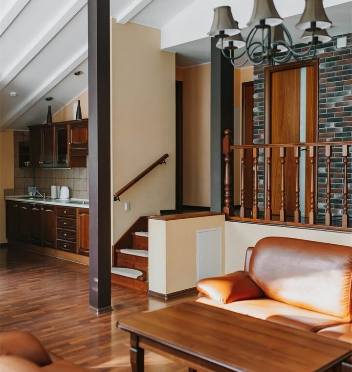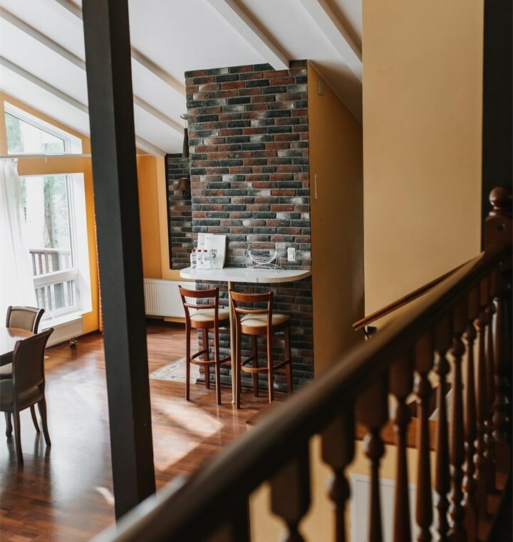 Расположенный в лесной зоне двухуровневый коттедж площадью 114 кв. м с уютной гостиной, оборудованной кухней, тремя спальнями и двумя туалетными комнатами. Кухня с электроплитой, вытяжкой, холодильником, посудомоечной машиной и набором посуды на 6 персон. Гостиная комната с камином, телевизором, телефоном, индивидуальным сейфом. Интерьер коттеджа выполнен в классическом стиле. К услугам гостей – бесплатный WI-FI. Количество основных мест – 6, дополнительных мест – 2.