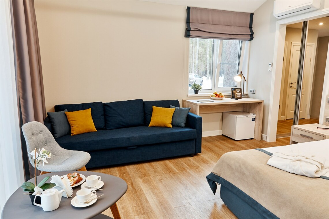 Коттедж «Гранвилл» расположен в заповедном лесу и состоит из двух номеров , которые при желании можно объединить. В каждом номере собственная терраса, где вы можете пить чай в окружении семьи и обитающих на территории парк-отеля белок и краснокнижных птиц. Концепция коттеджа «номер в лесу», где современный комфорт и технологии соединены с природой.