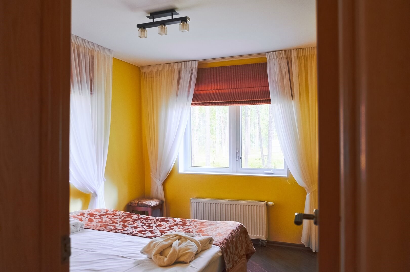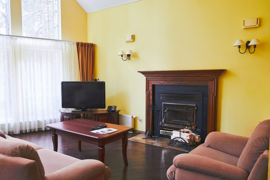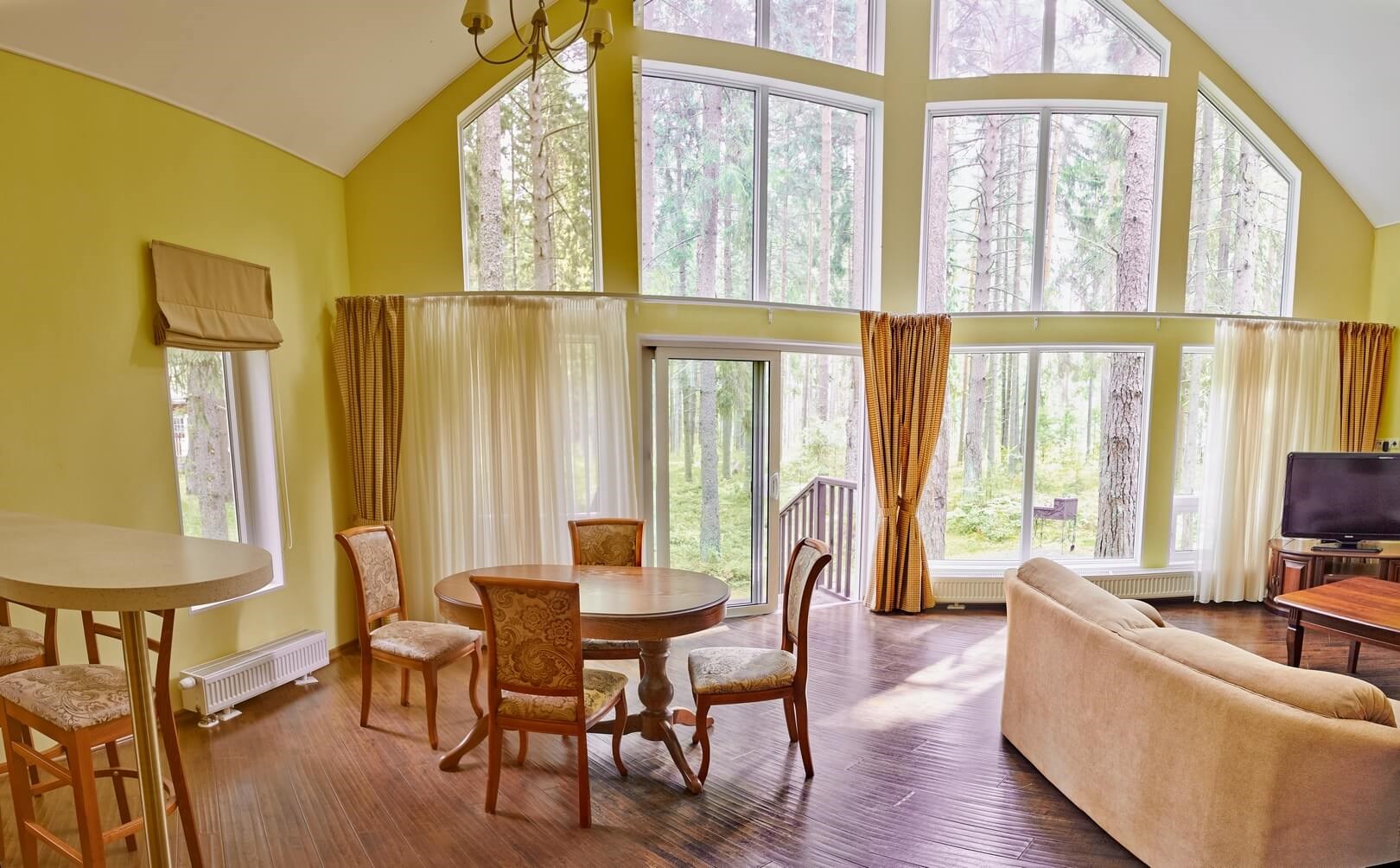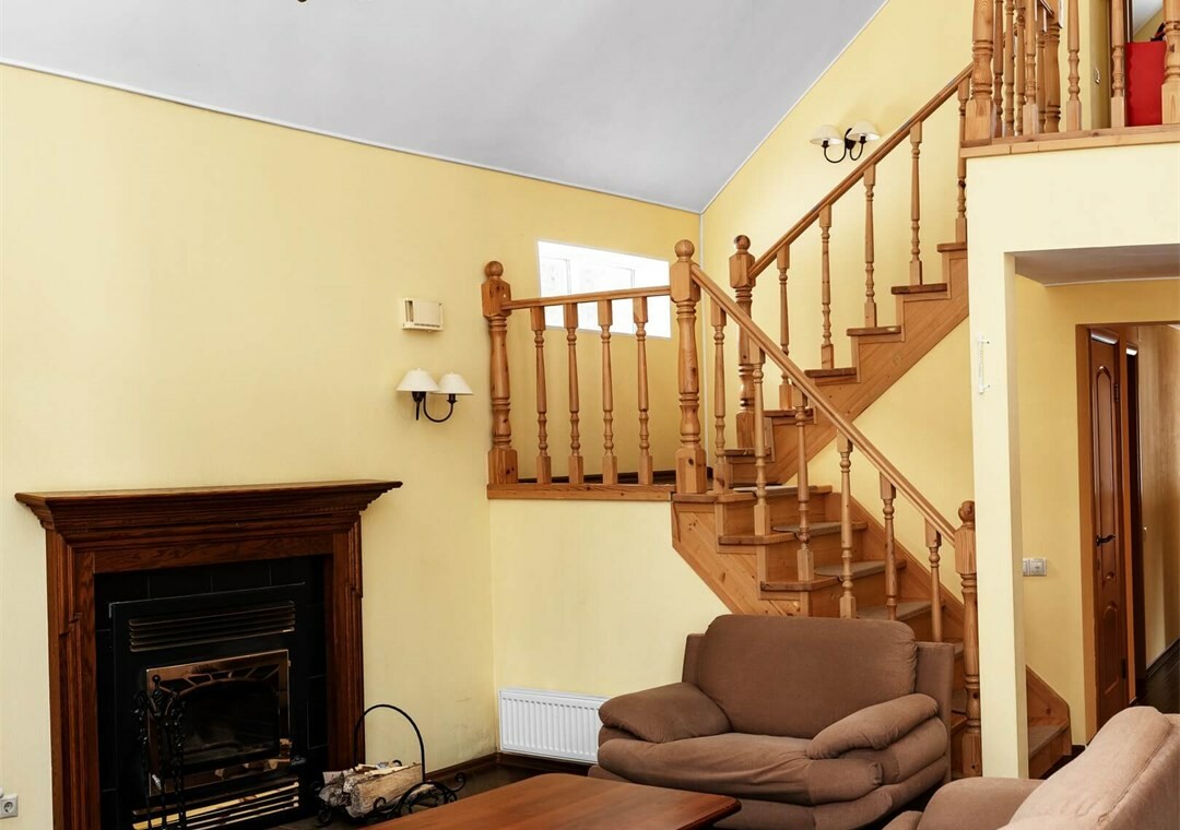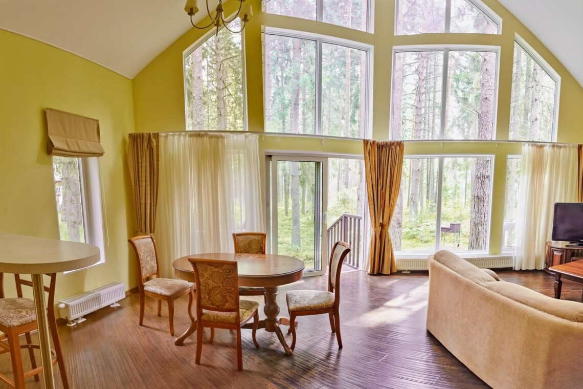 Расположенный в лесной зоне двухэтажный коттедж площадью 118 кв. м. с гостиной, оборудованной кухней-столовой, двумя спальными комнатами на разных этажах и двумя туалетными комнатами. На первом этаже расположена сауна на два человека с душем. Кухня с электроплитой, вытяжкой, холодильником, посудомоечной машиной и набором посуды на 6 персон. Гостиная с камином, телевизором, телефоном, индивидуальным сейфом. К услугам гостей – бесплатный WI-FI. Количество основных мест – 4, дополнительных мест – 2