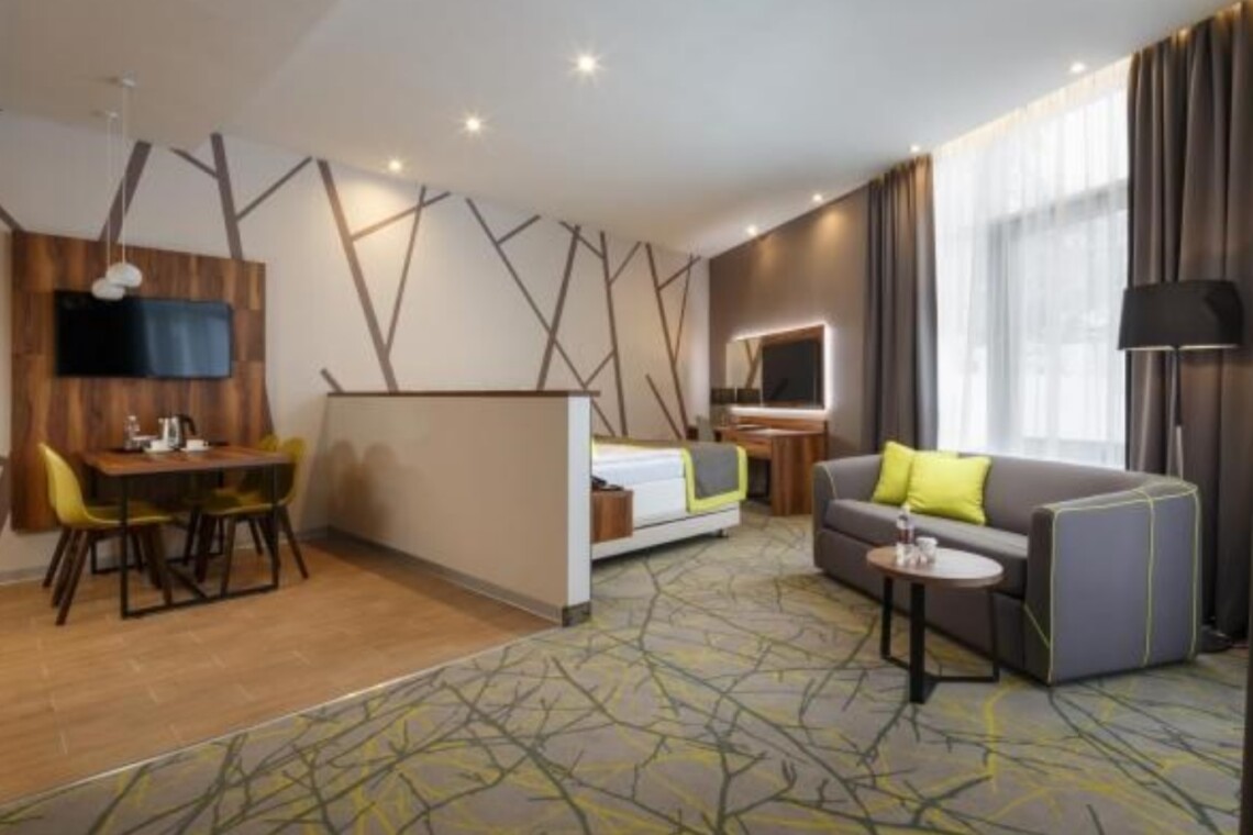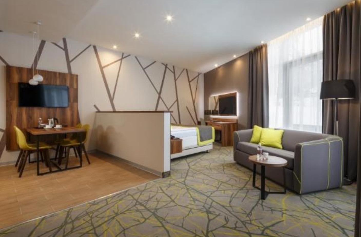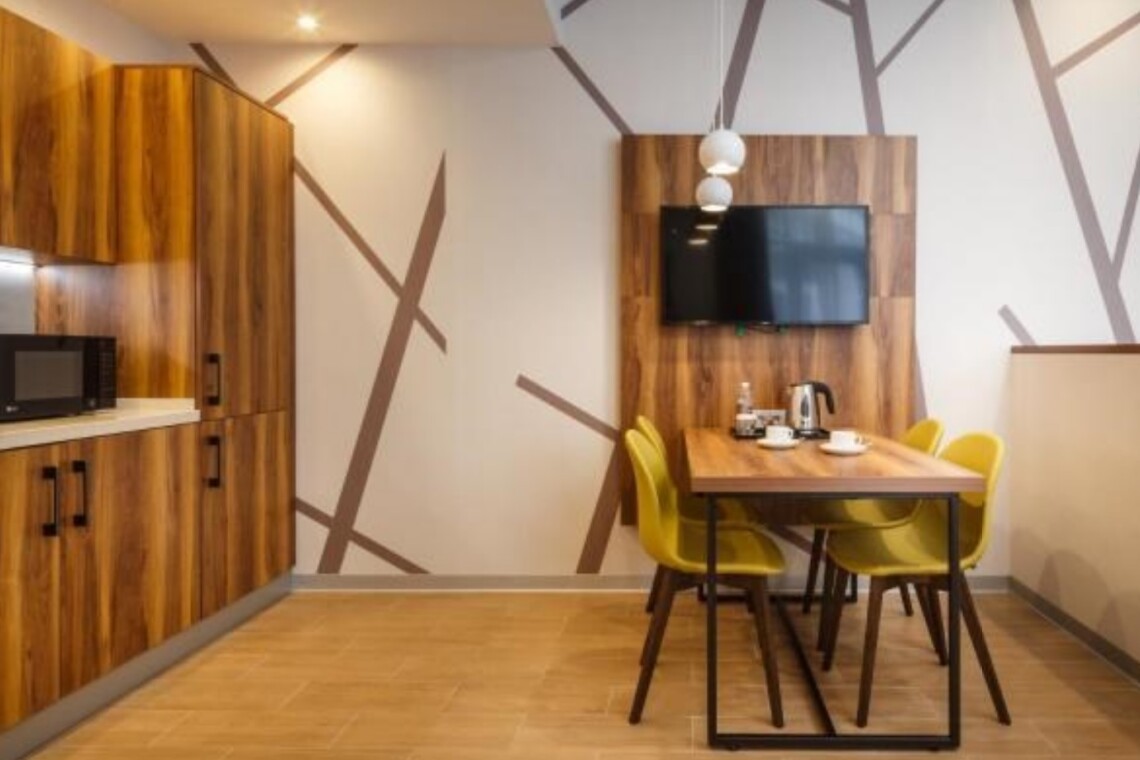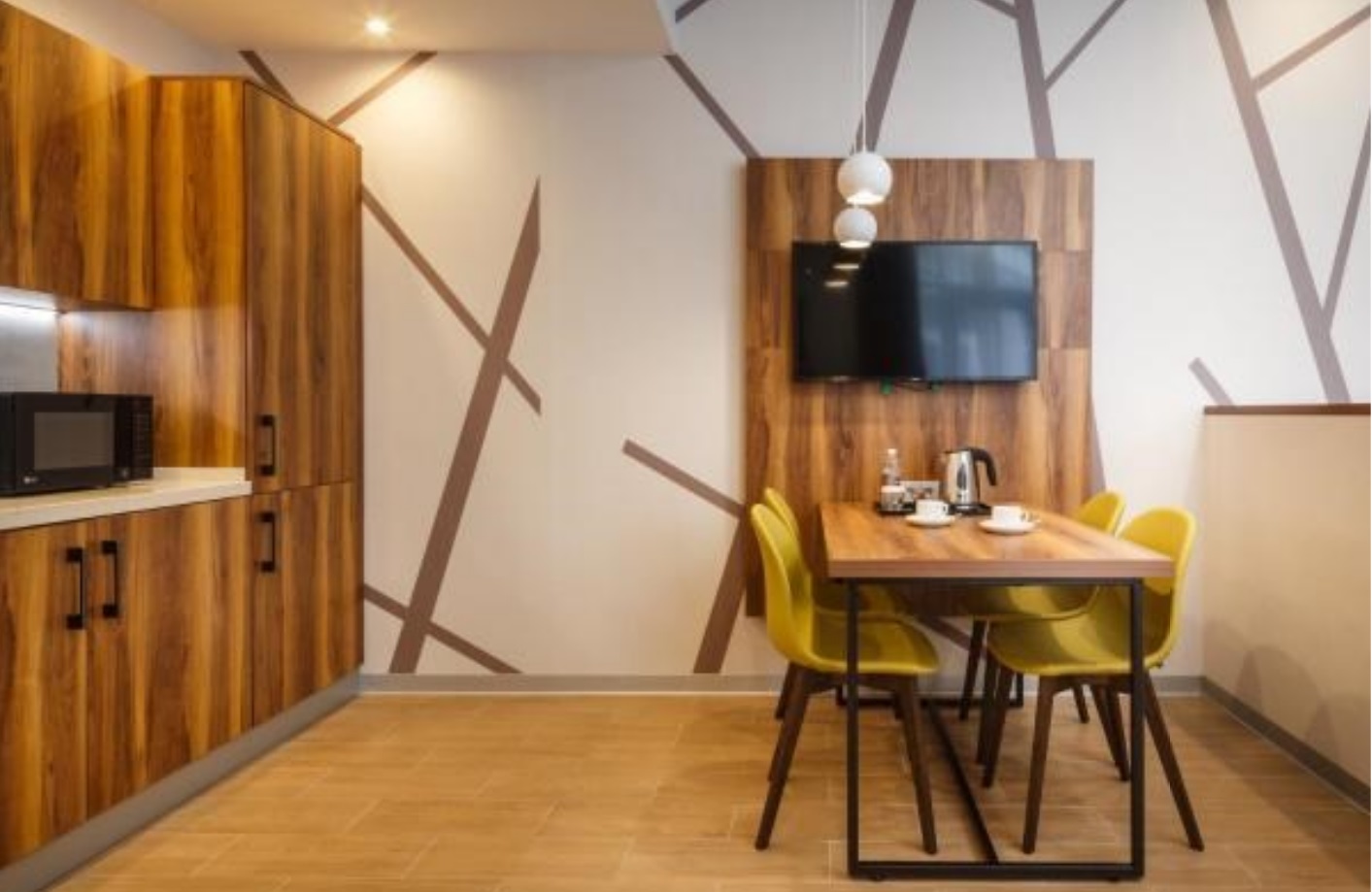 Большой номер площадью 45-50 кв.м Максимальное количество Гостей – 5. В номере: прихожая, гостиная, встроенные шкафы, кухня, обеденный стол, холодильник, микроволновая печь, сейф, телевизор, спальная система Ergomotion с трансформируемым основанием, рабочий стол со стульями , гладильная станция, чайный набор, набор посуды.