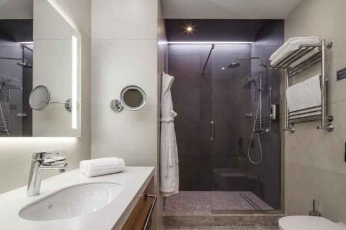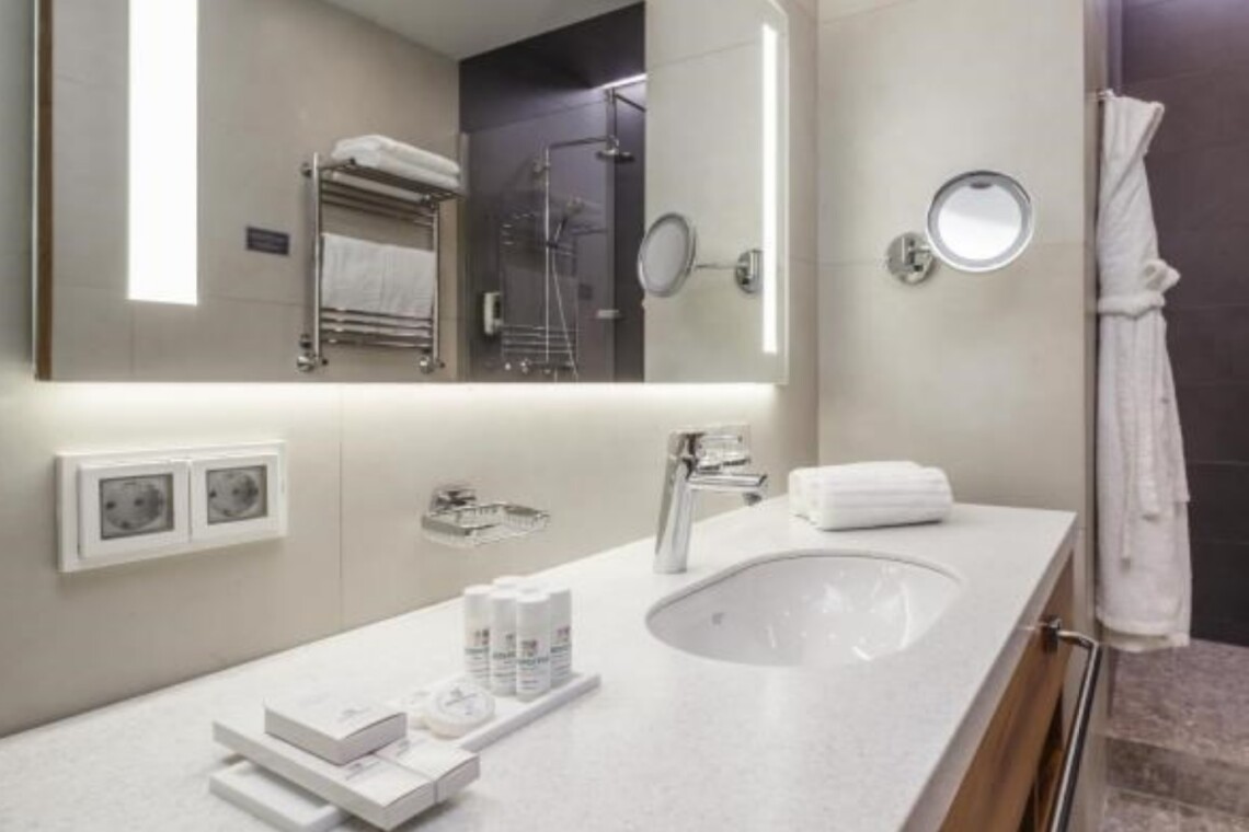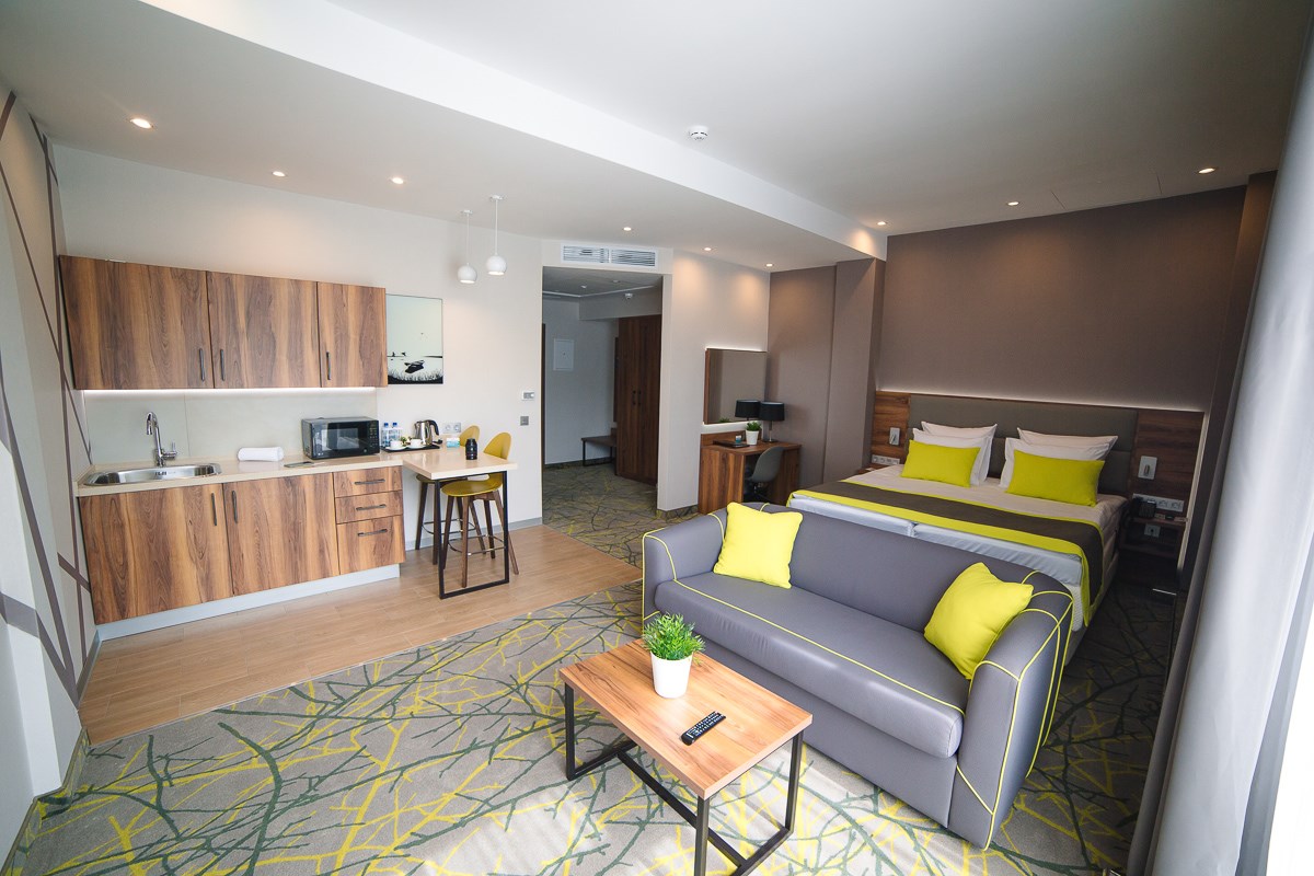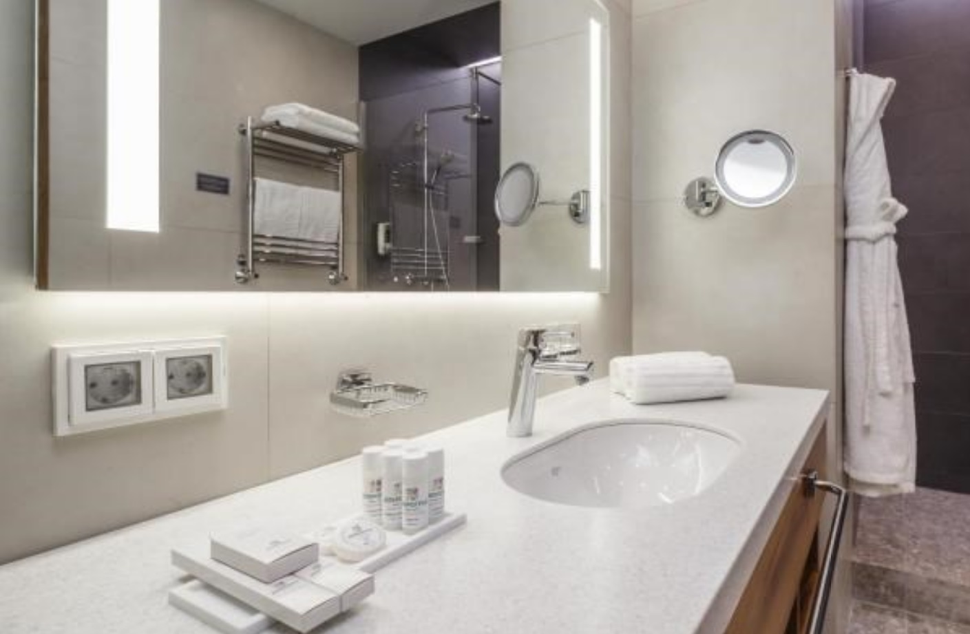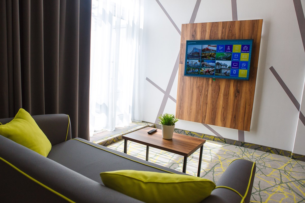 Большой номер площадью 45-50 кв.м Максимальное количество Гостей – 5. В номере: прихожая, гостиная, встроенные шкафы, кухня, обеденный стол, холодильник, микроволновая печь, сейф, телевизор, спальная система Ergomotion с трансформируемым основанием, рабочий стол со стульями , гладильная станция, чайный набор, набор посуды.
