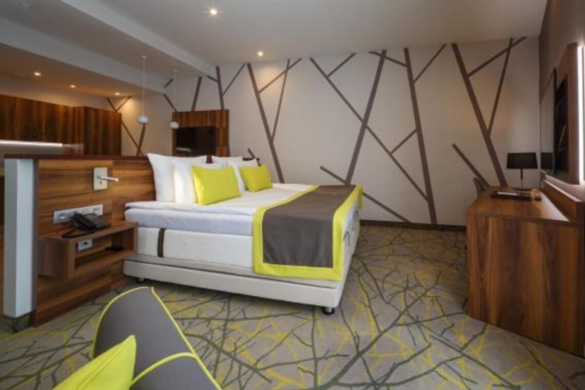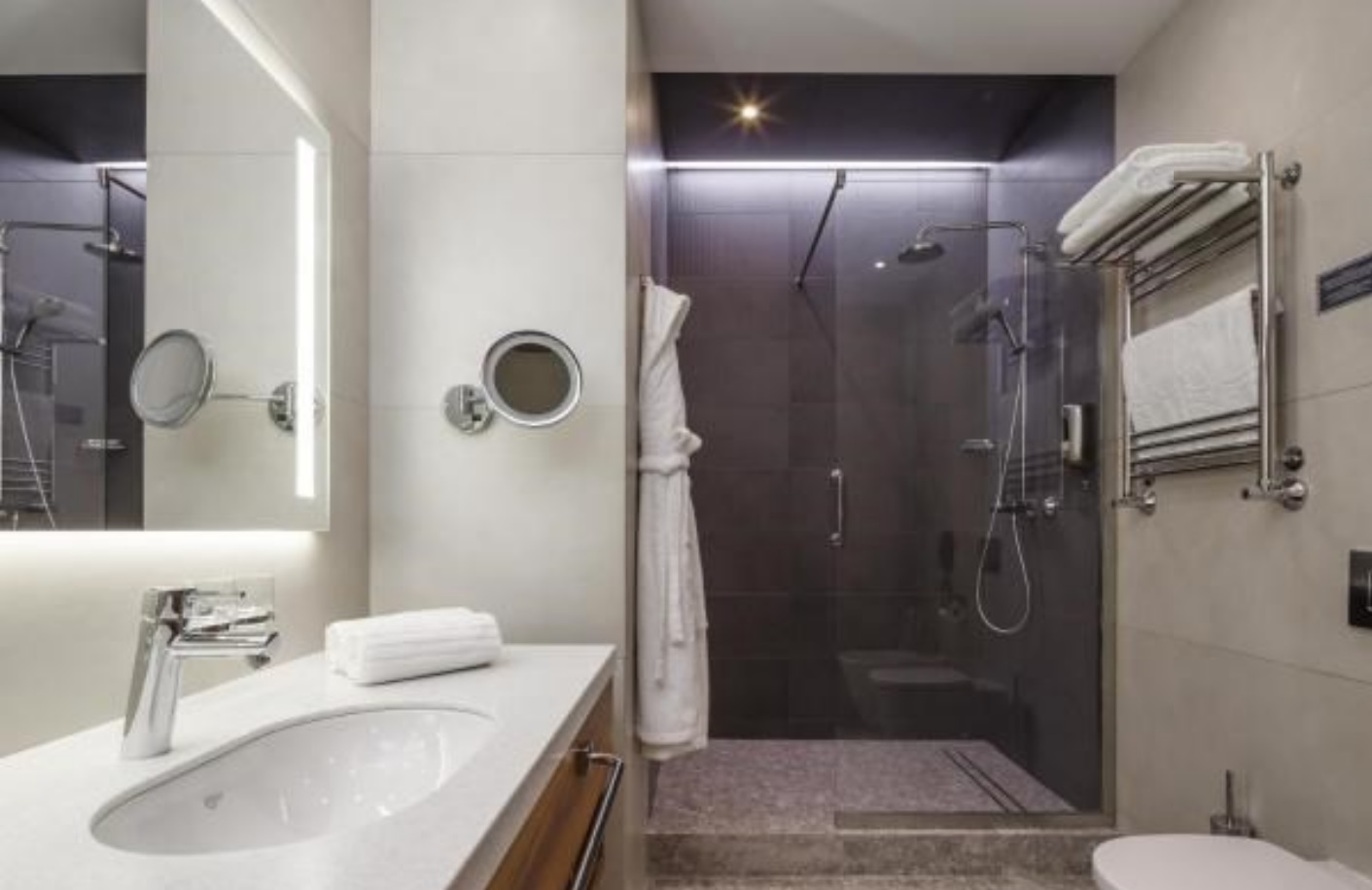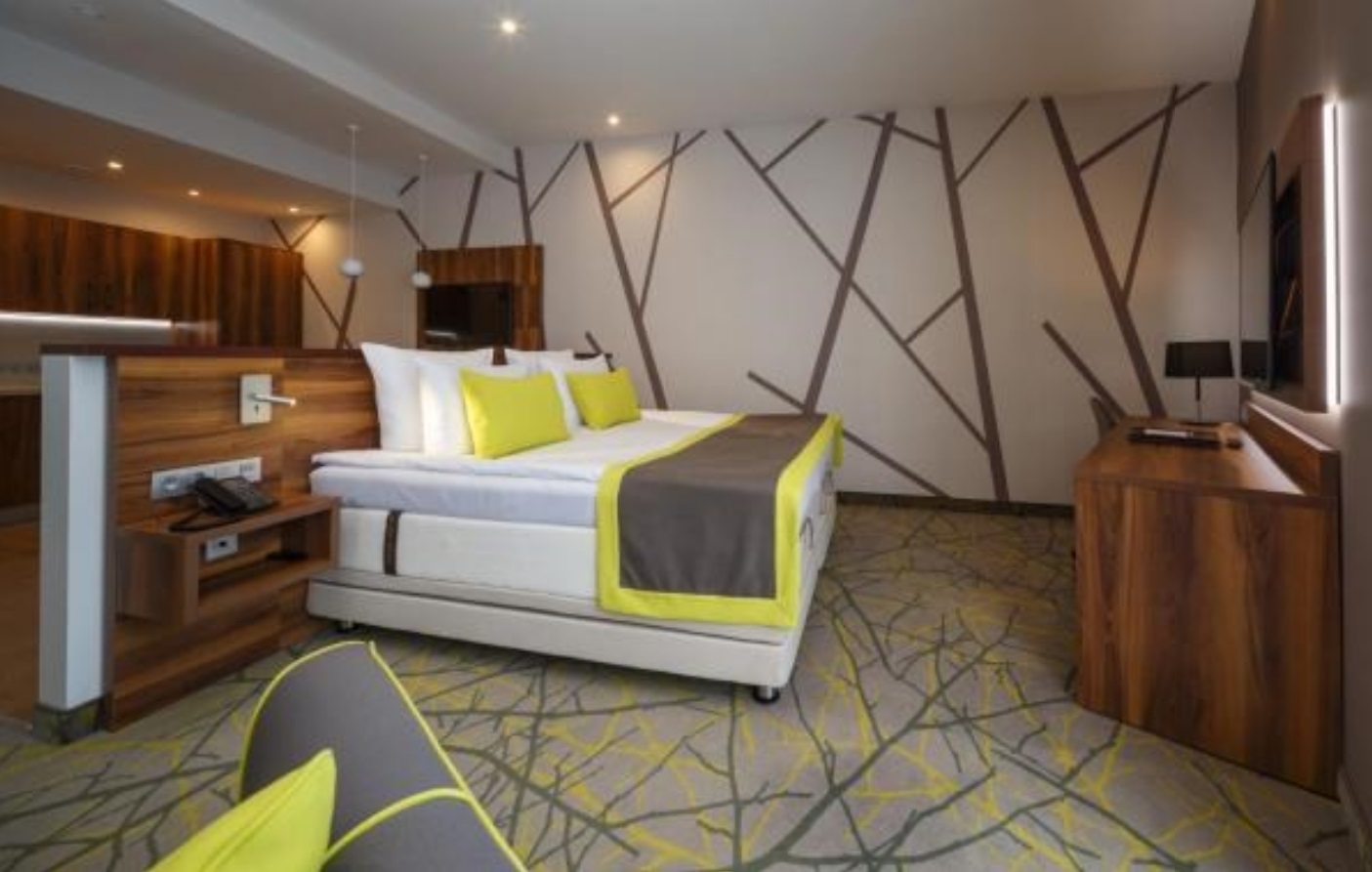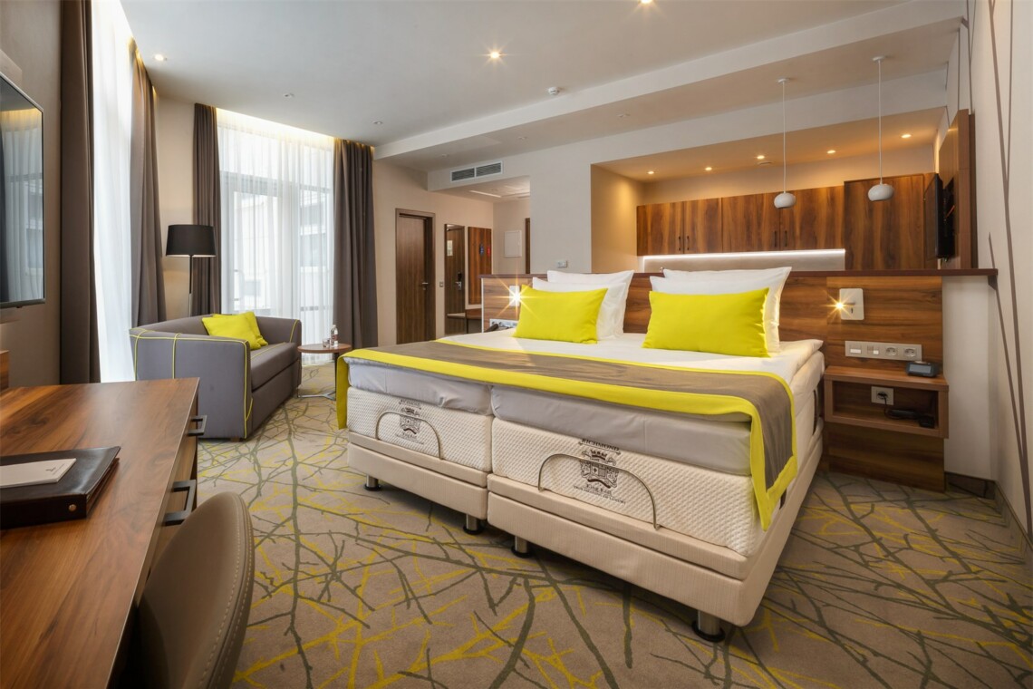 Большой номер площадью 45-50 кв.м Максимальное количество Гостей – 5. В номере: прихожая, гостиная, встроенные шкафы, кухня, обеденный стол, холодильник, микроволновая печь, сейф, телевизор, спальная система Ergomotion с трансформируемым основанием, рабочий стол со стульями , гладильная станция, чайный набор, набор посуды.