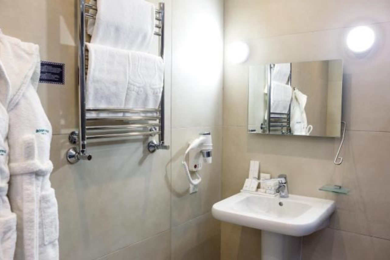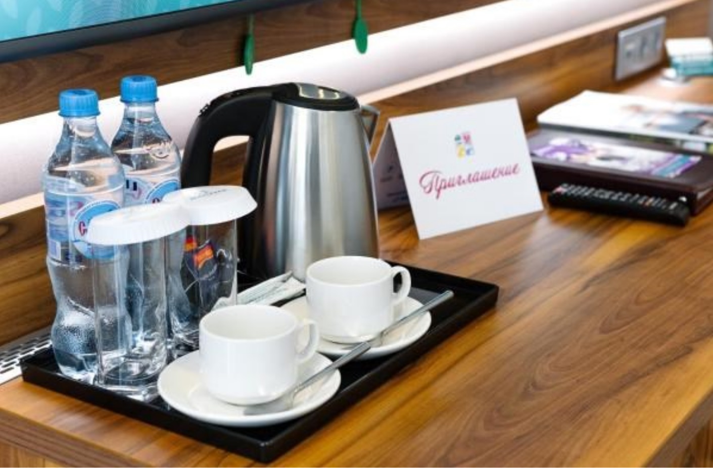 Большой номер площадью 45-50 кв.м. В номере: прихожая, гостиная, встроенные шкафы, сейф, телевизор, широкая кровать, рабочий стол со стульями, гладильная станция, чайный набор, набор посуды.