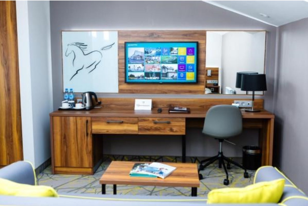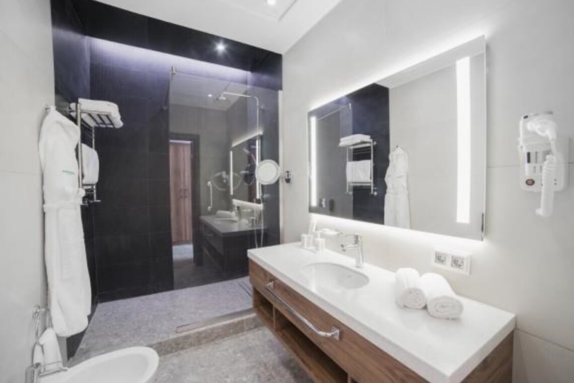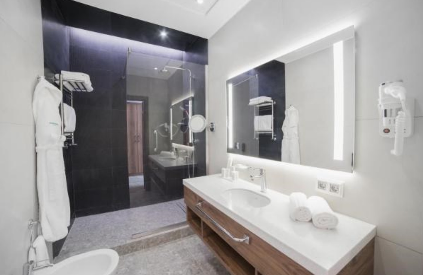 Просторный номер СТУДИЯ С КРОВАТЬЮ “king-size” или с двумя односпальными приложениями площадью 30-35 кв. м. наличием дивана, журнальным столиком, кухонным столом, стулом, кухонным шкафом, кухонным столом, мини-баром, сейфом, чайным набором. В ванной комнате: душ, фен, зеркало, зеркало для бритья, биде, душевые принадлежности.