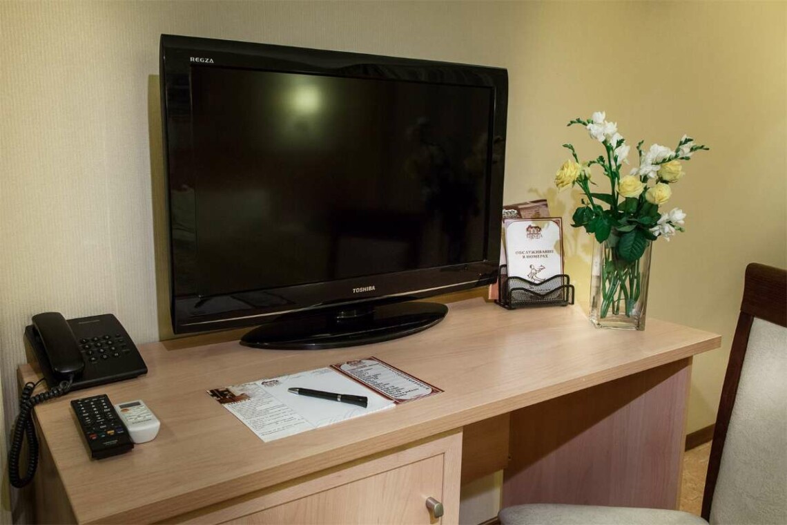 Все просторные звукоизолированные номера оборудованы кондиционером, TV с плоским экраном, кабельными каналами, мини-баром*, сейфом, ковровым покрытием, средствами личной гигиены, феном, халаты и тапочки включены в люксы, в стандартные номера предоставляются по запросу.*