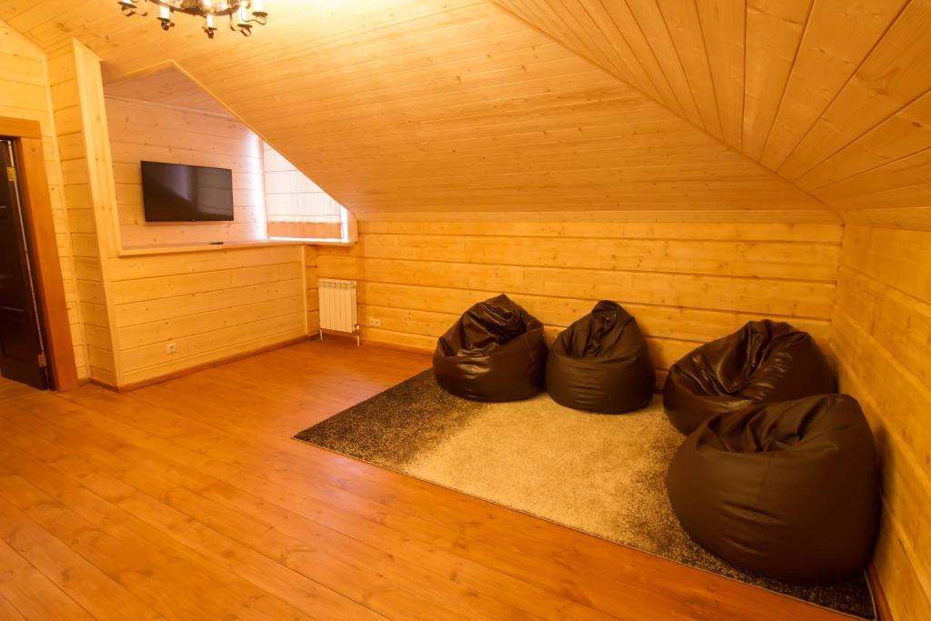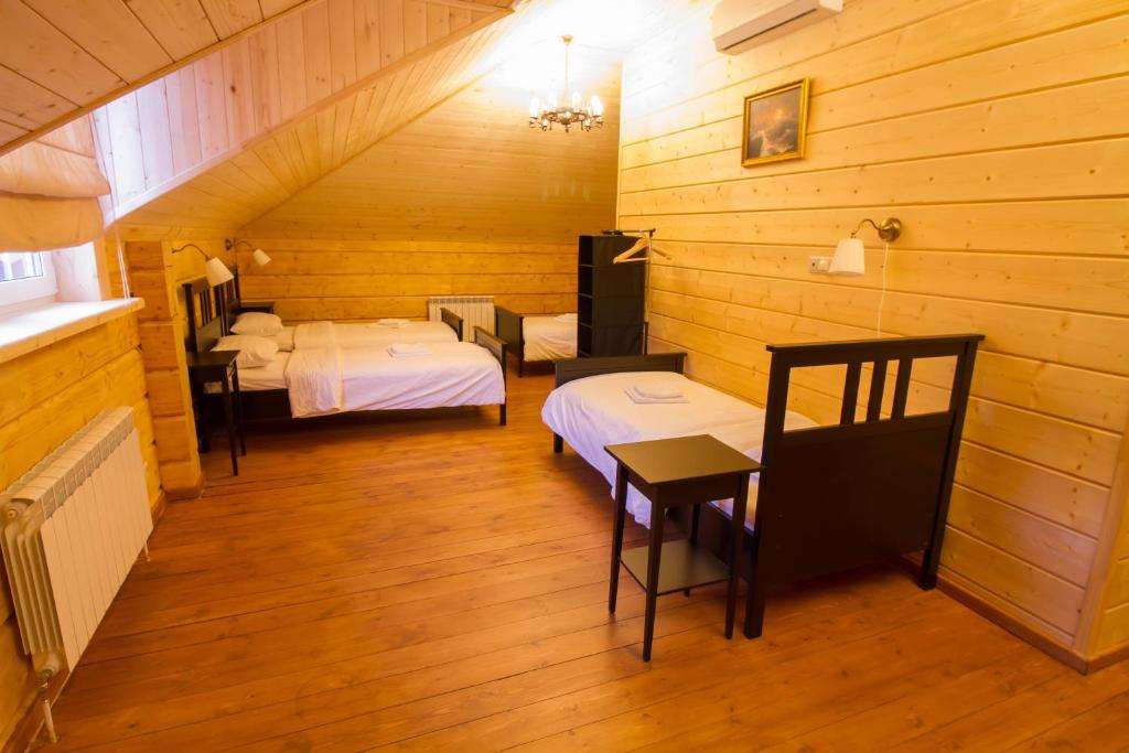 Новый номер в деревянном коттедже с односпальными креслами, комфортом и туалетом. Номера располагаются на 3 этажах. Комната просторная с зоной отдыха.