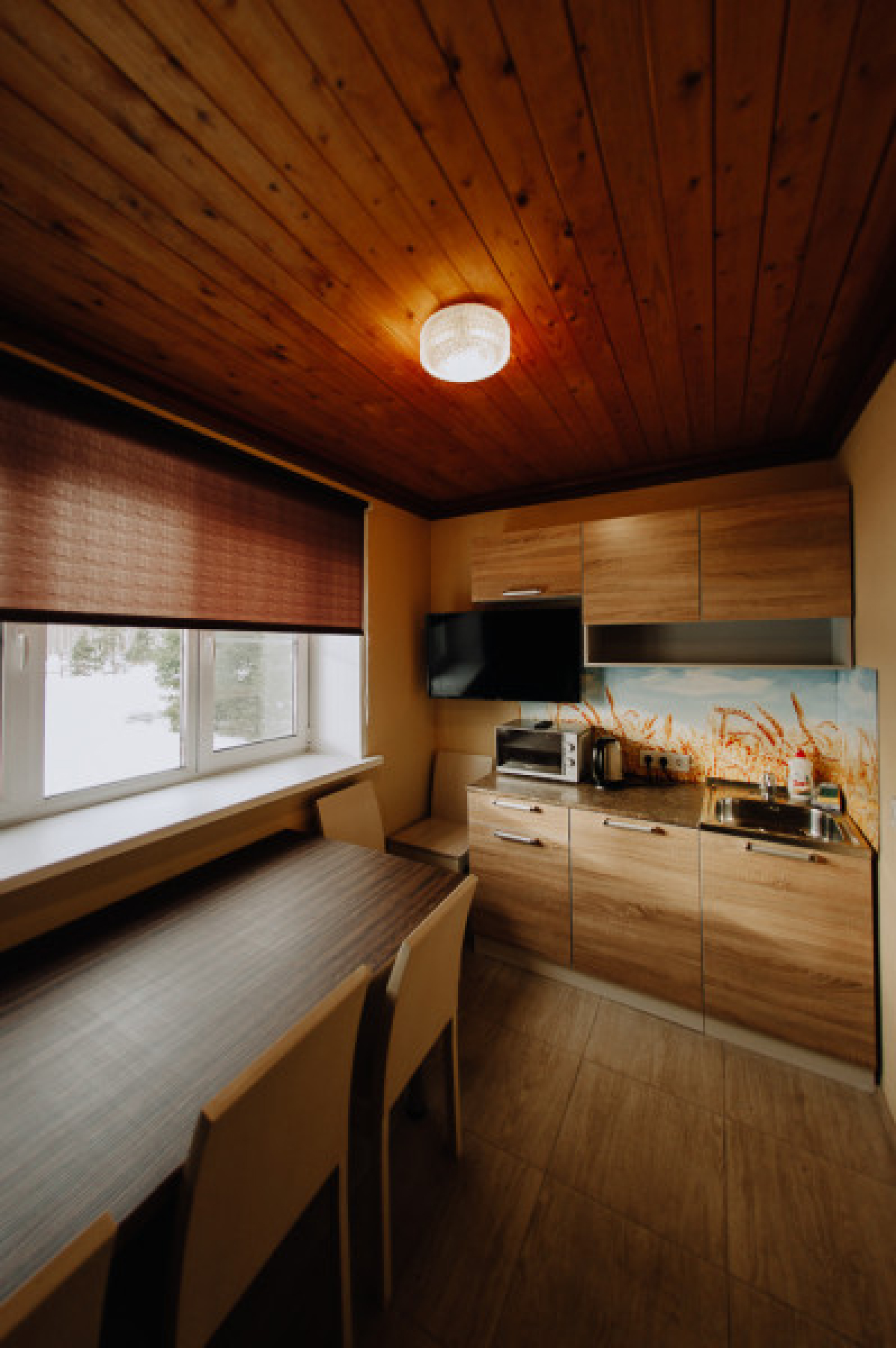 Описание: четырехместный: 2 спальни и кухня, прихожая, туалет, душ, сауна, ведро с холодной водой. В каждой спальне: одна двухспальная кровать и одна одноместная. На кухне: большой стол, холодильник, чайник и микроволновая печь, телевизор. Пользование сауной оплачивается дополнительно. В сауну входит полотенце, простынь, веник и тапочки. Своя уличная веранда, уличный стол, мангал.