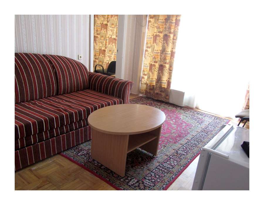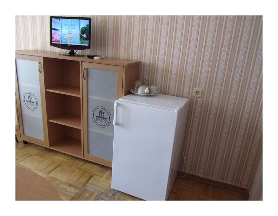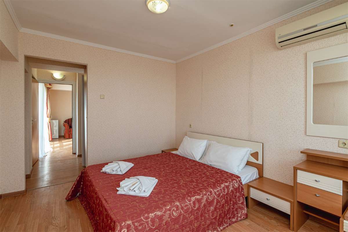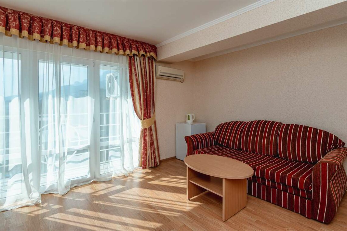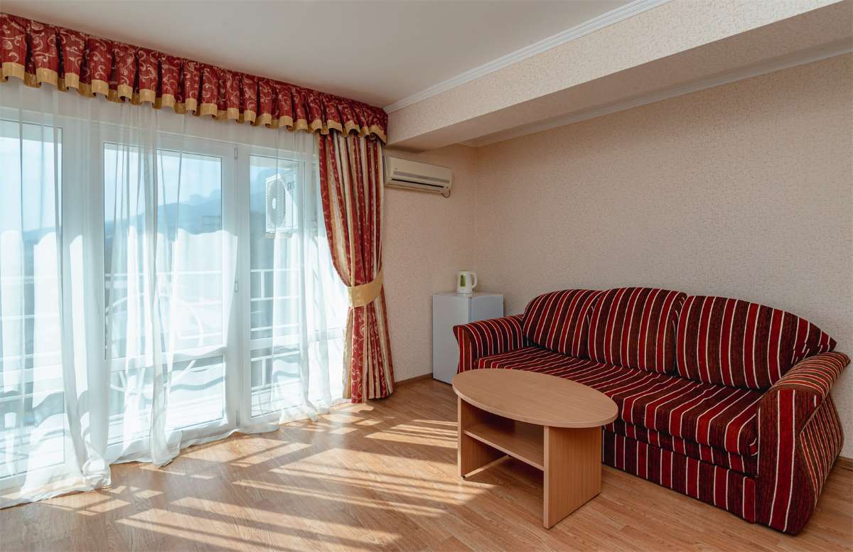 Двухкомнатный номер общей площадью – 44 м.кв., жилая – 25 м.кв. В номере: одна двуспальная кровать, диван, кресла, тумбочки, шкаф, стол, стулья. Санузел: душевая кабина, раковина, унитаз. Два дополнительных места – диван.