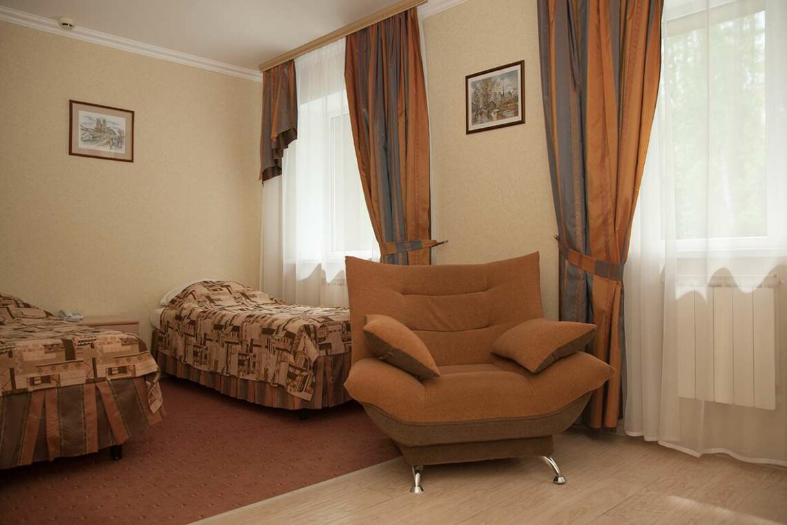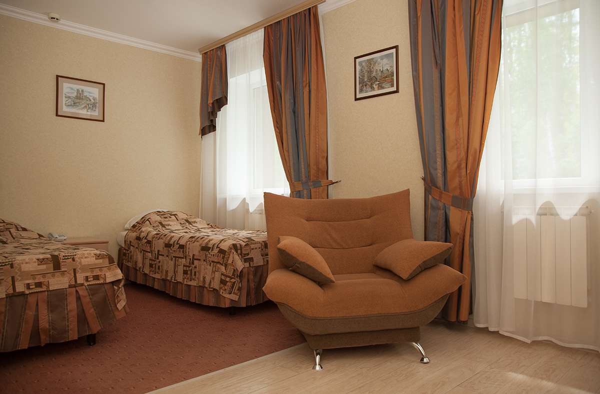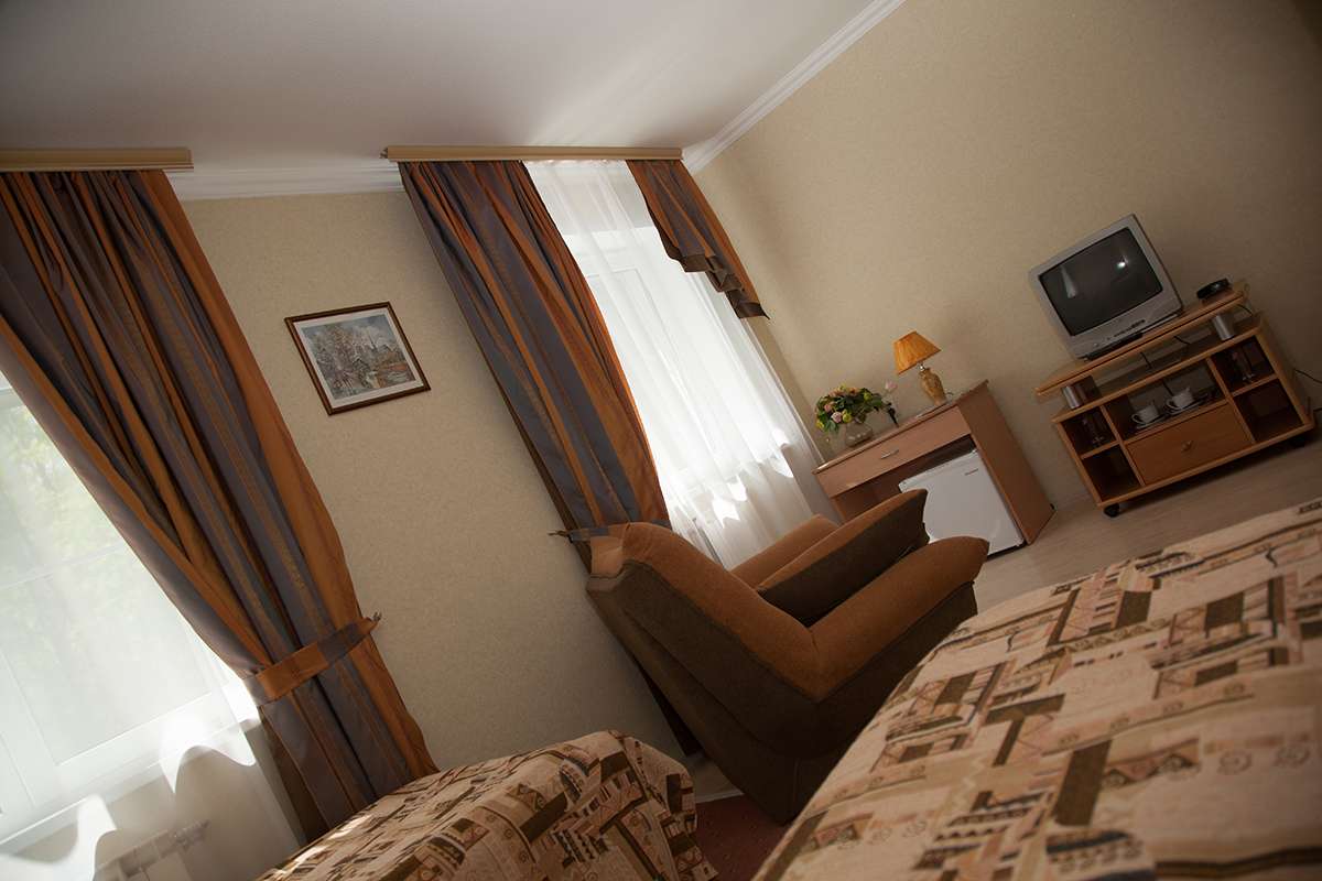 В номере: одна двуспальная кровать, прикроватные тумбы, шкаф для одежды, телевизор, телефон, Wi-Fi, журнальный столик, мягкая мебель, холодильник.