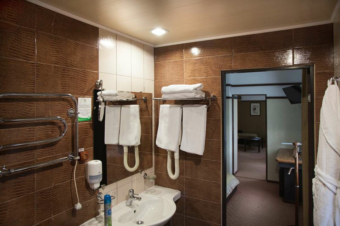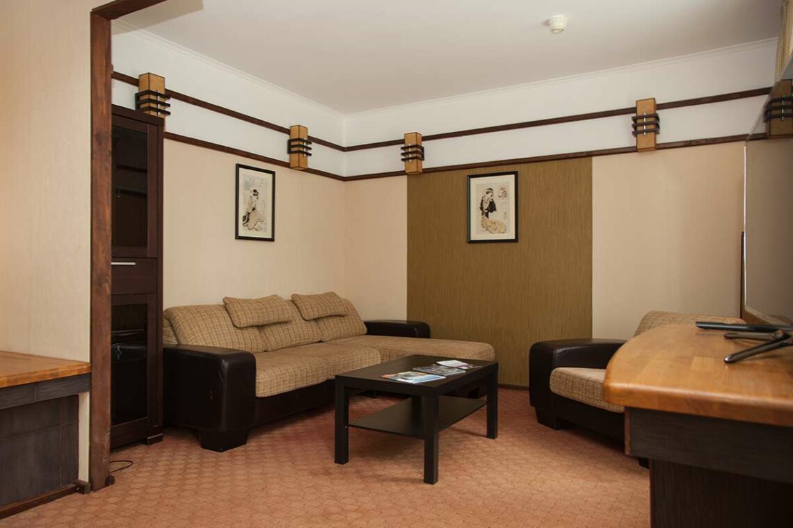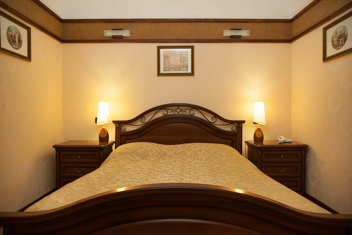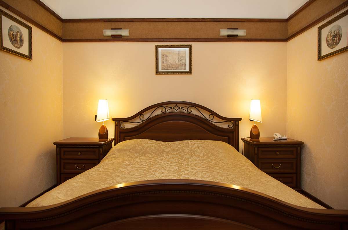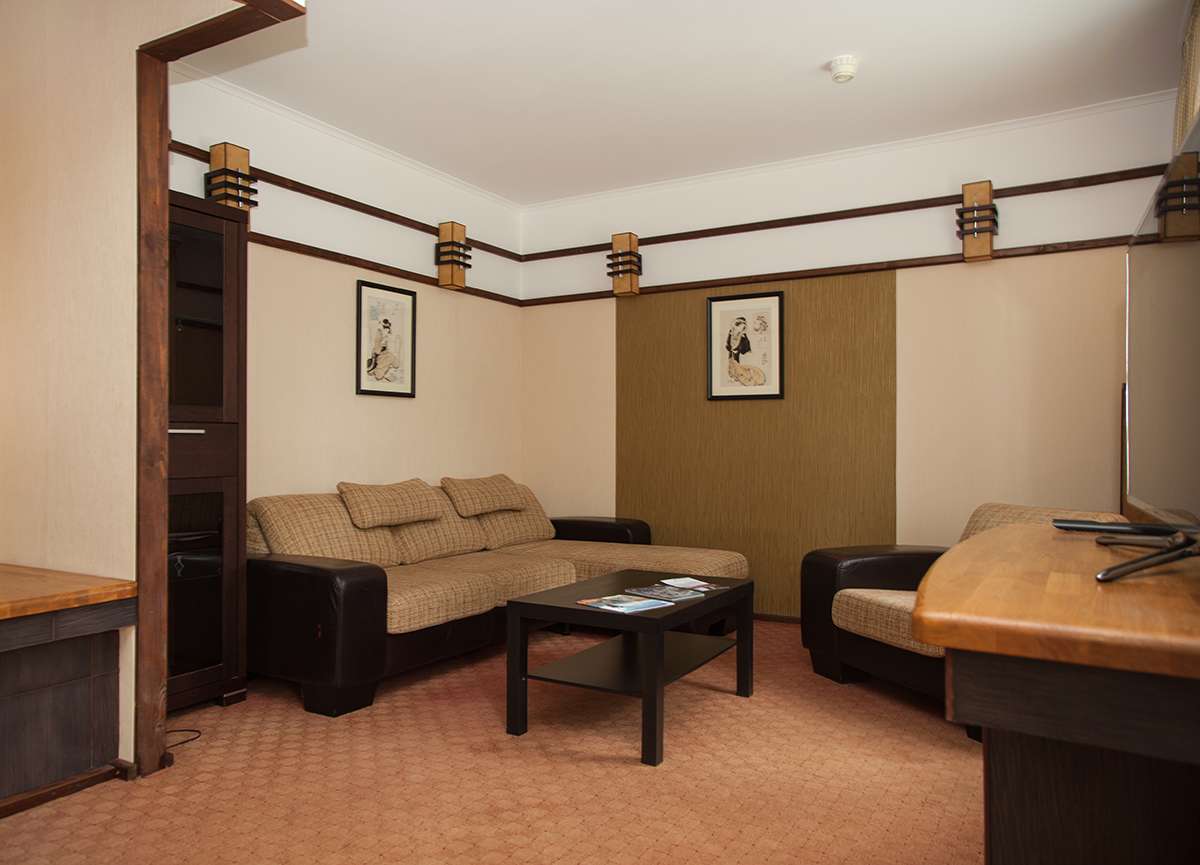 В номере: одна двуспальная кровать, прикроватные тумбы, шкаф для одежды, телевизор, телефон, Wi-Fi, журнальный столик, мягкая мебель, холодильник.