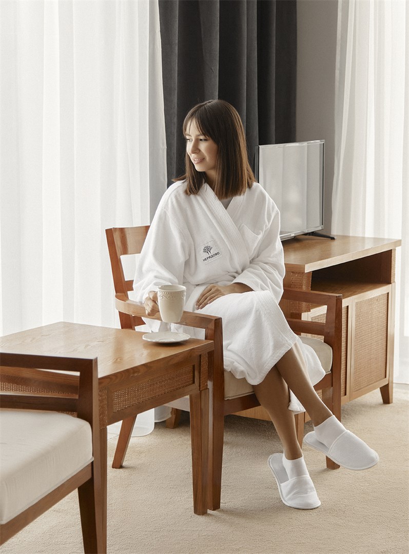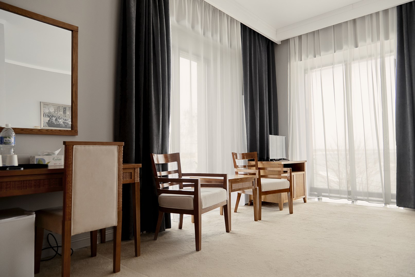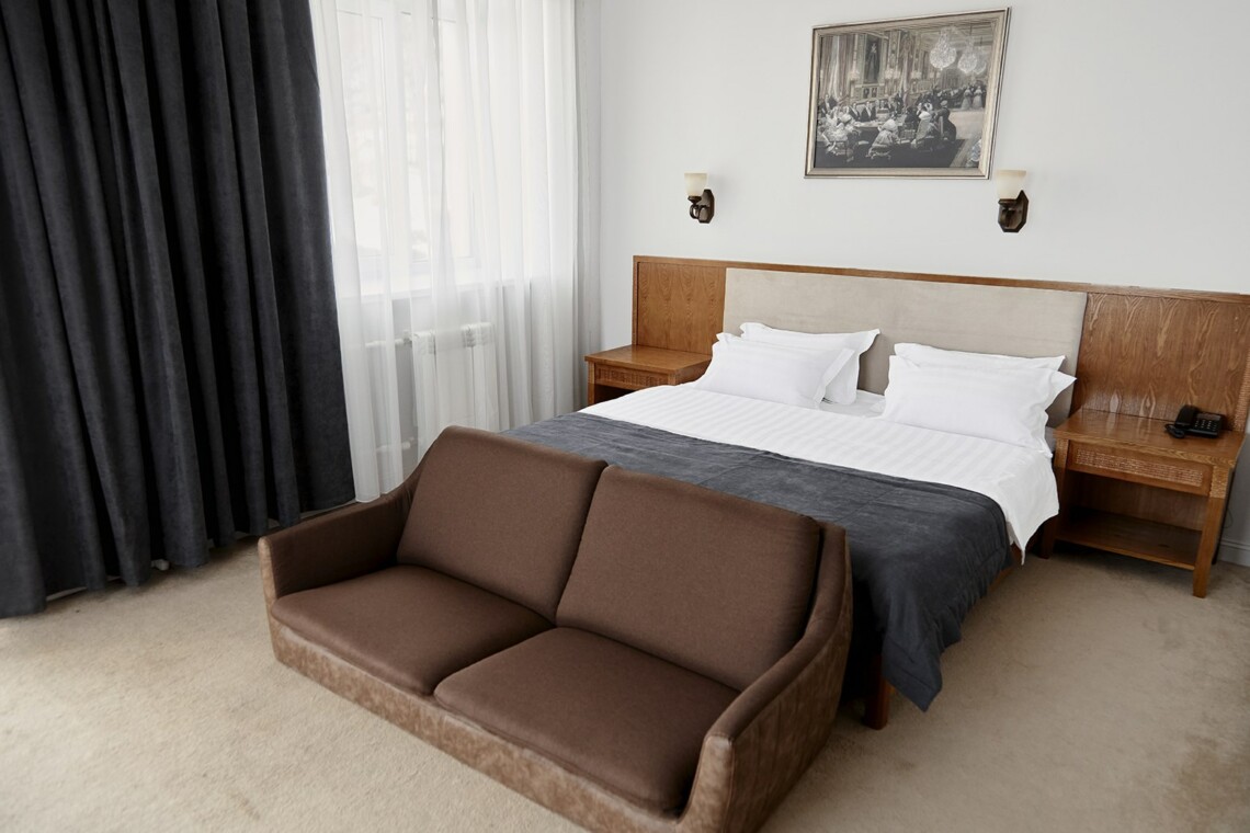 Панорамный Делюкс с видом на реку Волга. Просторный номер с двуспальной кроватью. Делюкс оснащен телевизором, диваном, шкафом для одежды, сейфом, журнальным столиком, стульями, туалетным столом, настольной лампой, чайной станцией и питьевой водой. Санузел с душевой кабиной. Халаты, тапочки, косметические средства, полотенца и всё необходимое в номере предоставлено.