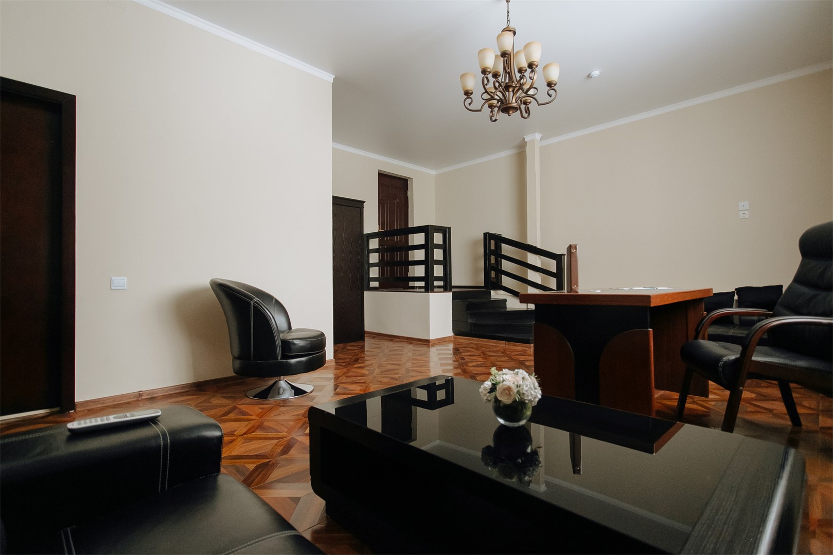 Просторный двухкомнатный Люкс с видом на реку Волга. Подойдет для отдыха с семьей. Гостиная оснащена большим диваном, телевизором, письменным столом, шкафом для одежды, сейфом и креслом. Спальня с двуспальной кроватью, журнальным столиком, стульями, туалетным столом, настольной лампой, чайной станцией и питьевой водой. Санузел с джакузи. Халаты, тапочки, косметические средства, полотенца и всё необходимое в номере предоставлено.