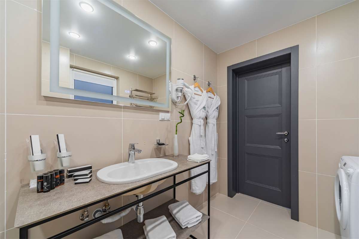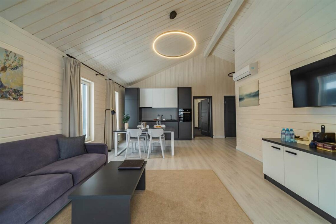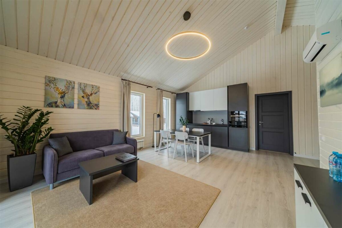 Современный европейский дизайн, 2 больших спальни с оценкой “кинг-сайз”, которые по запросу трансформируются в две раздельные и просторные кухни-гостиные оборудованные всем необходимым, для больших семейных вечеров с выходом на большую террасу. Предоставляемые Les Villages услуги коттеджа Nouveau предоставляются завтраки высшего класса с алкогольными напитками в премиум ресторане Изба, а также персональный менеджер по работе с гостями, 20% скидка на СПА-меню, вечерние часы в бассейне, детская комната с аниматором в течении дня, термальный комплекс с парными безлимитно.
